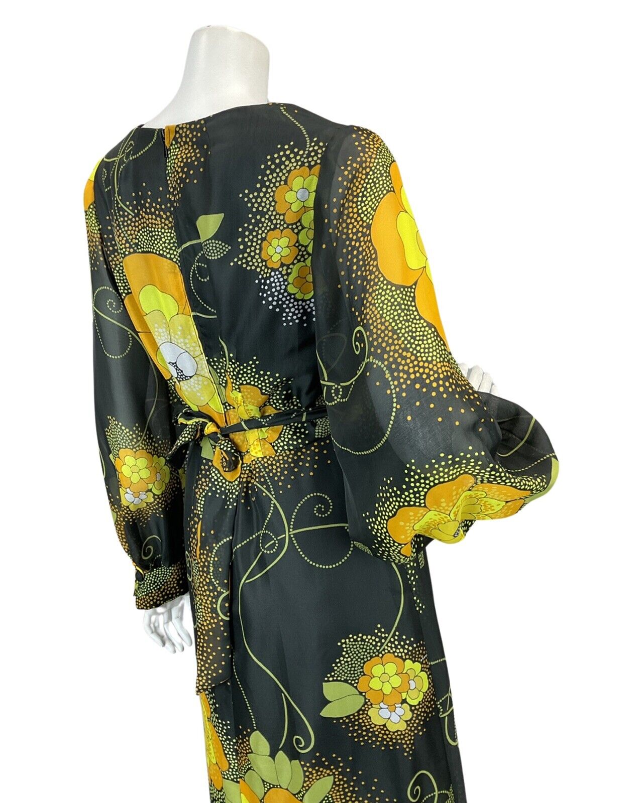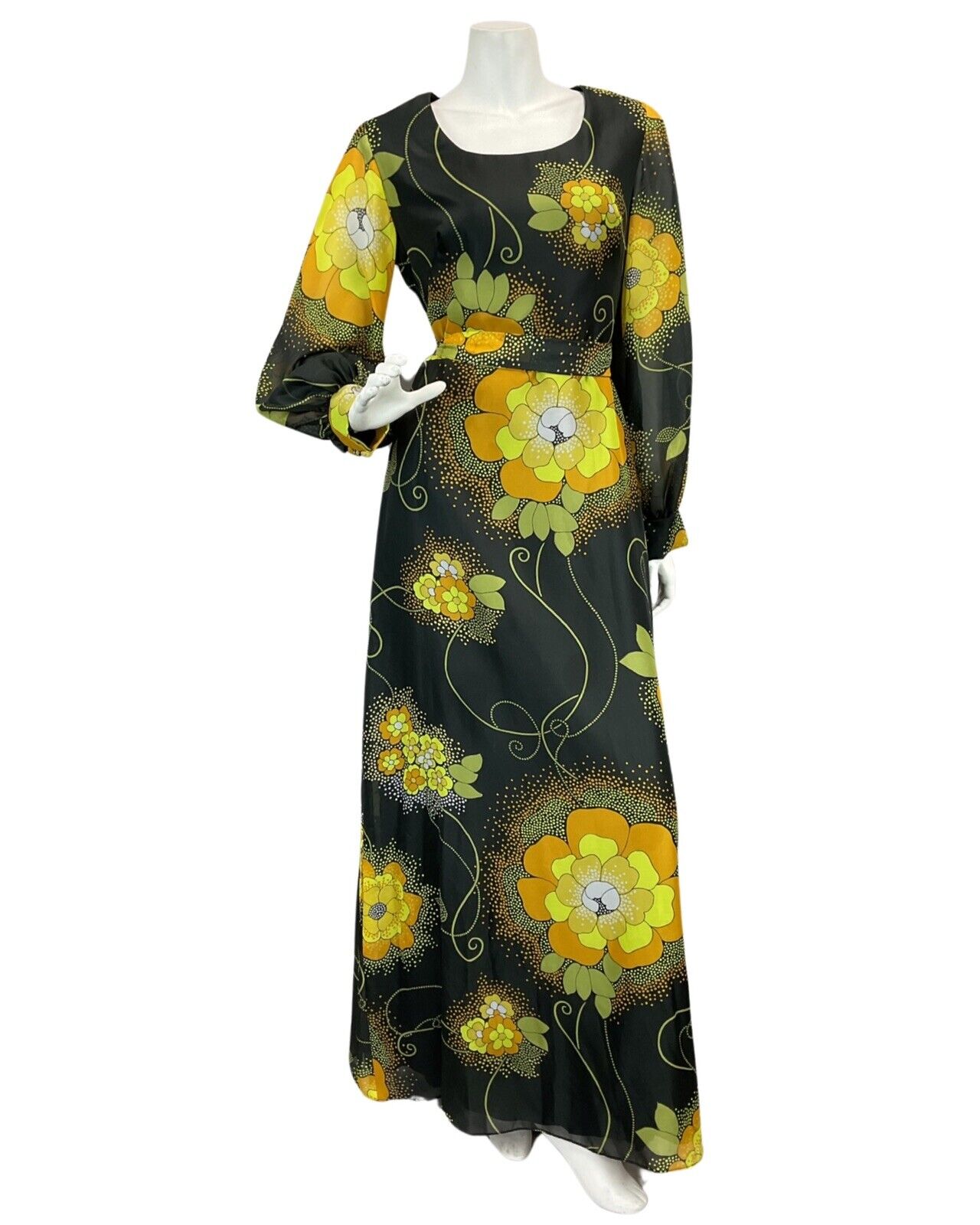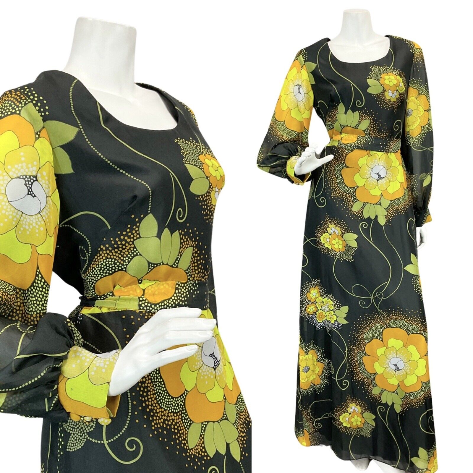 VTG 60s 70s BLACK YELLOW ORANGE FLORAL PRINT PSYCHEDELIC MAXI DRESS 10 12