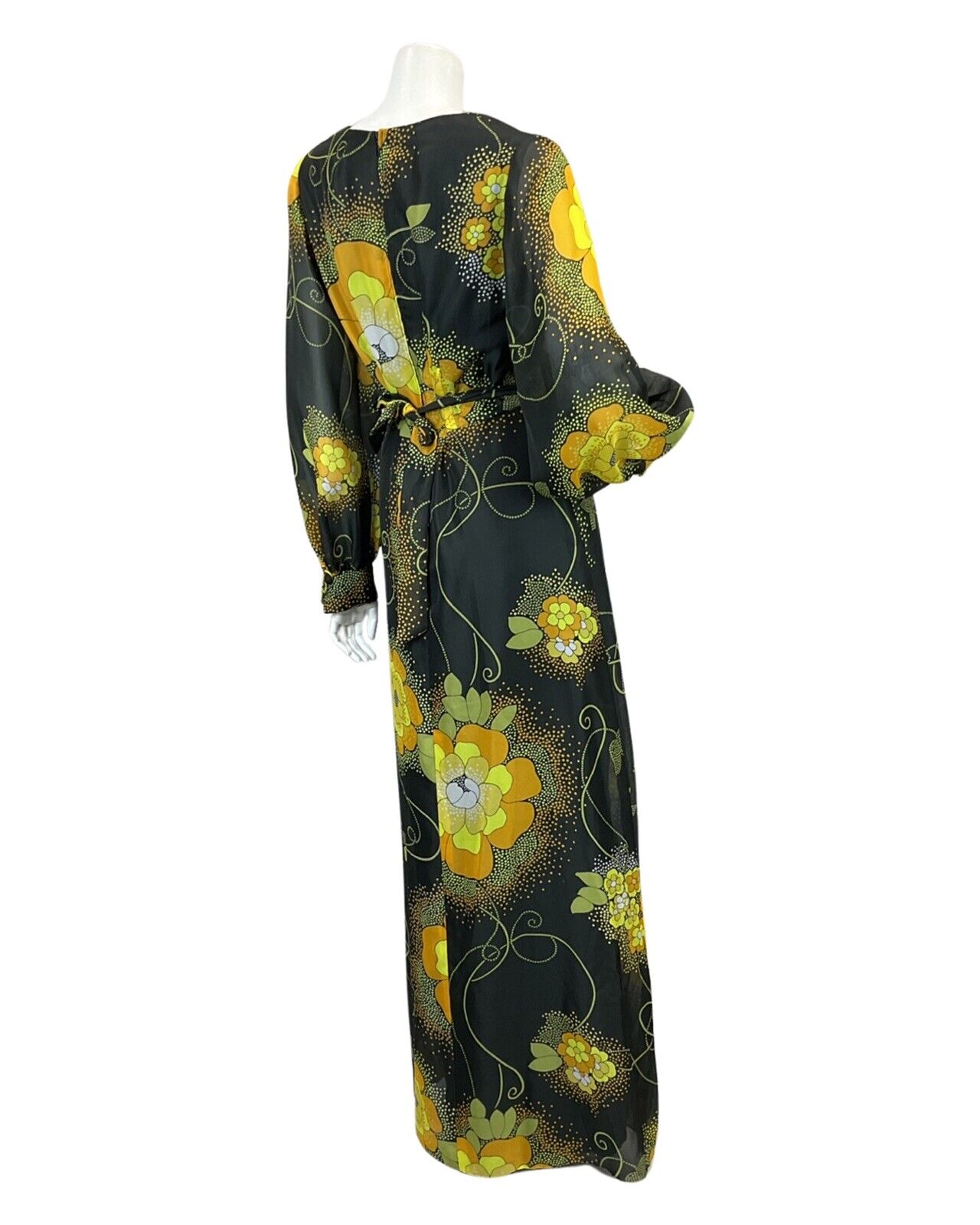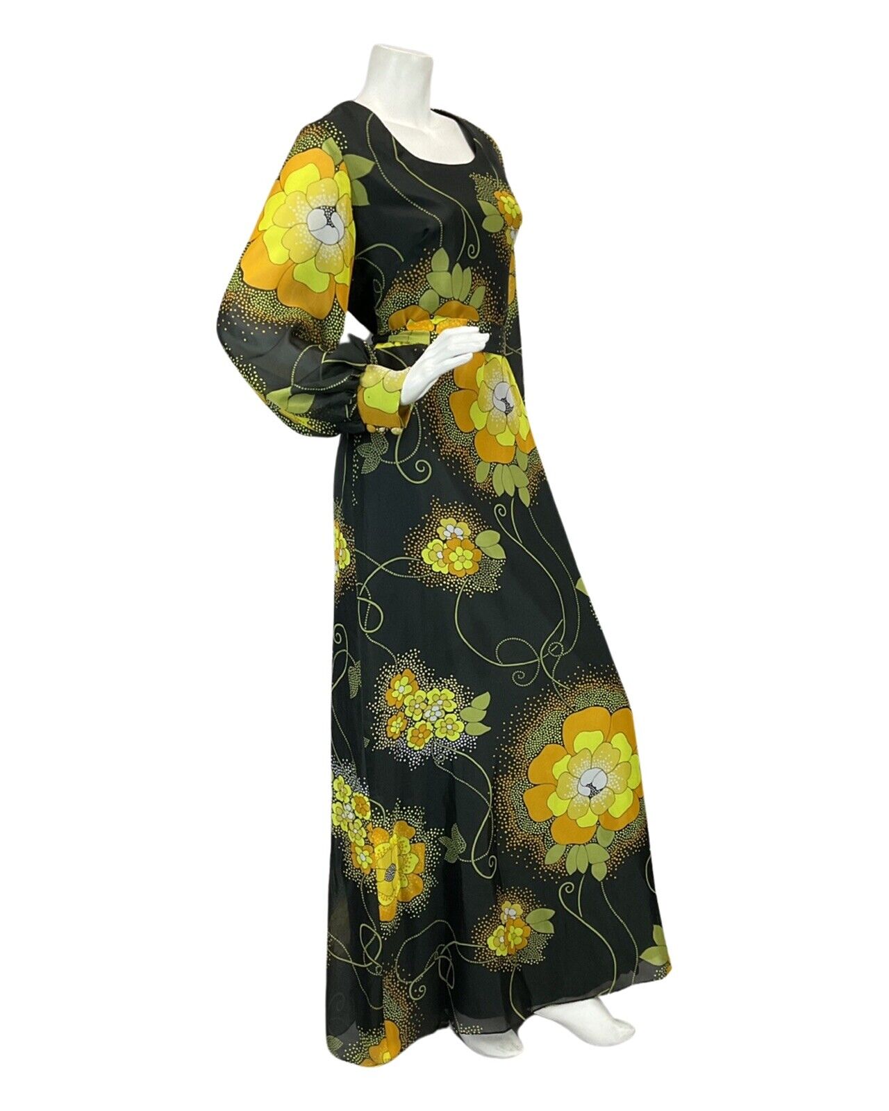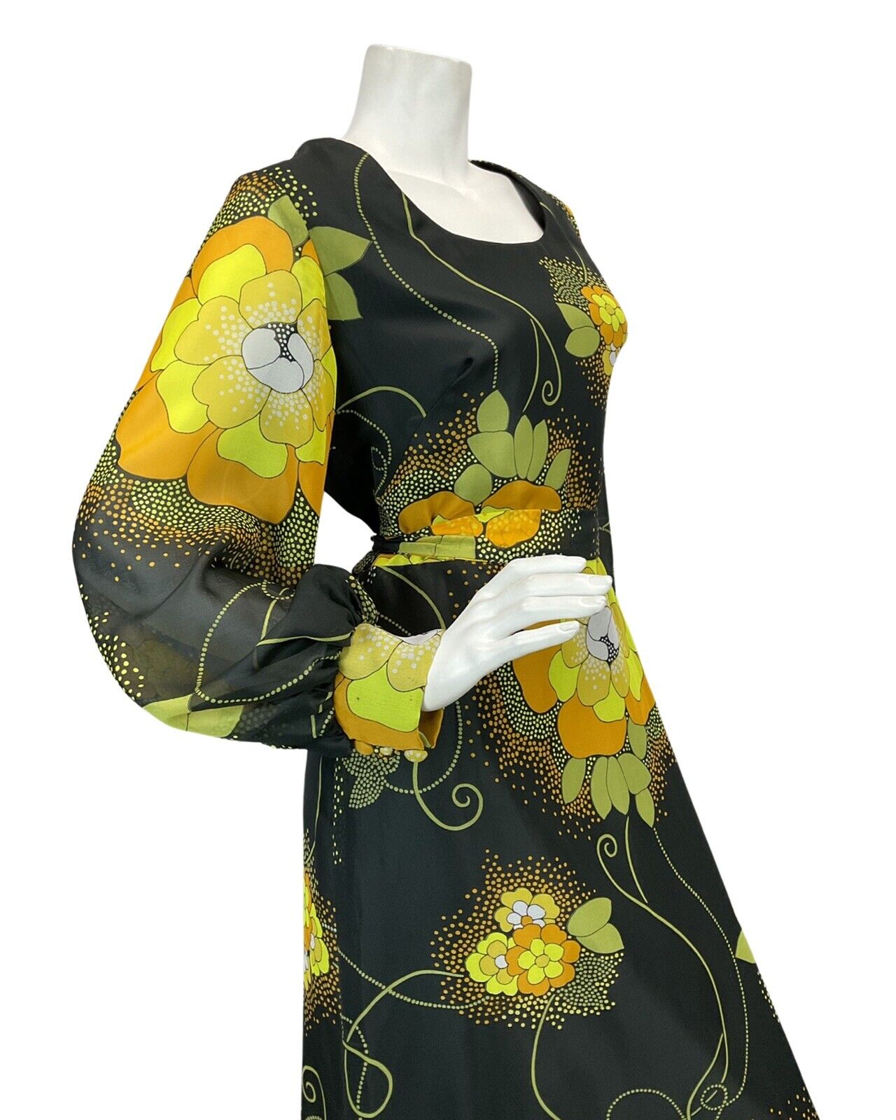 VTG 60s 70s BLACK YELLOW ORANGE FLORAL PRINT PSYCHEDELIC MAXI DRESS 10 12