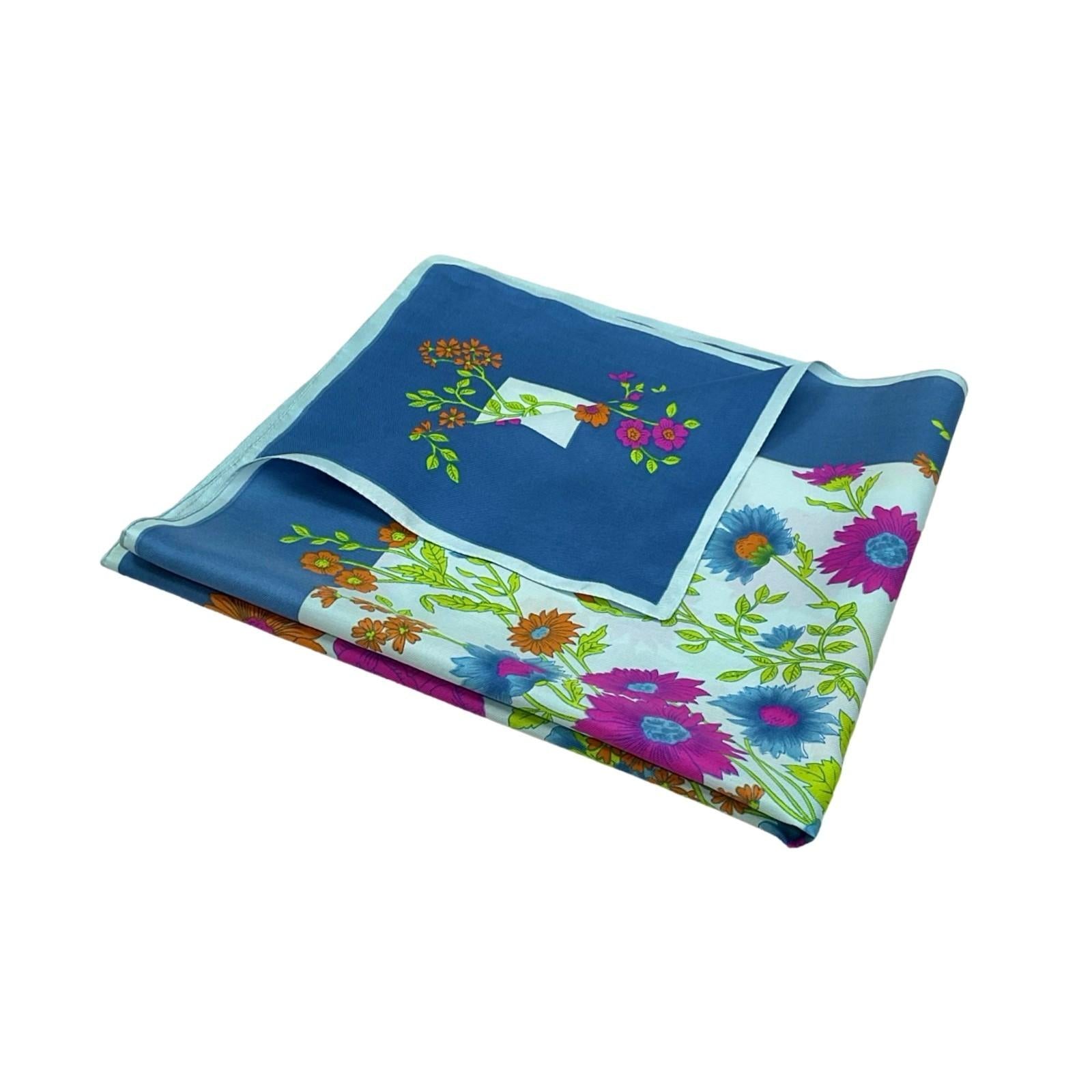 This is a lovely 60s 70s scarf made from a synthetic fabric printed with various florals in orange, purple, green and blue on a blue background.