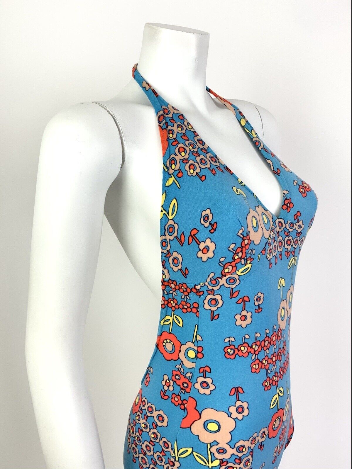 This is an amazing vintage swimsuit made from a bright blue polyamide fabric with a good amount of stretch and no added lining.