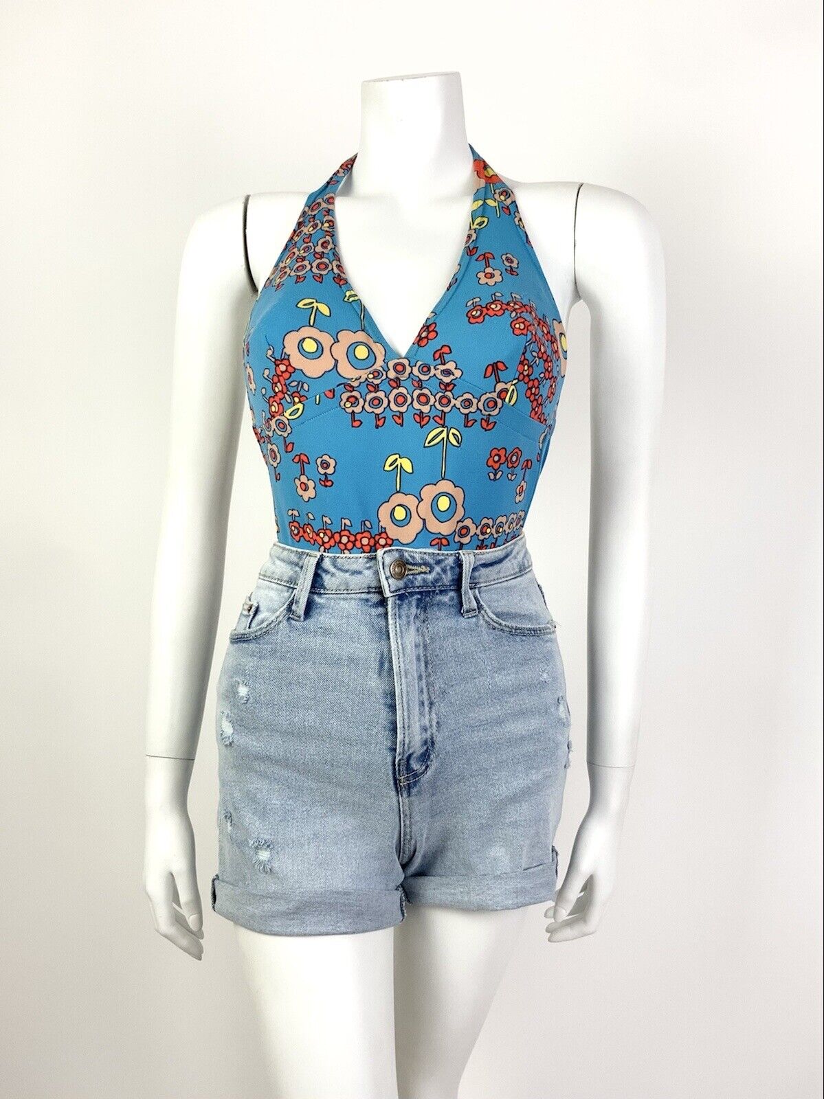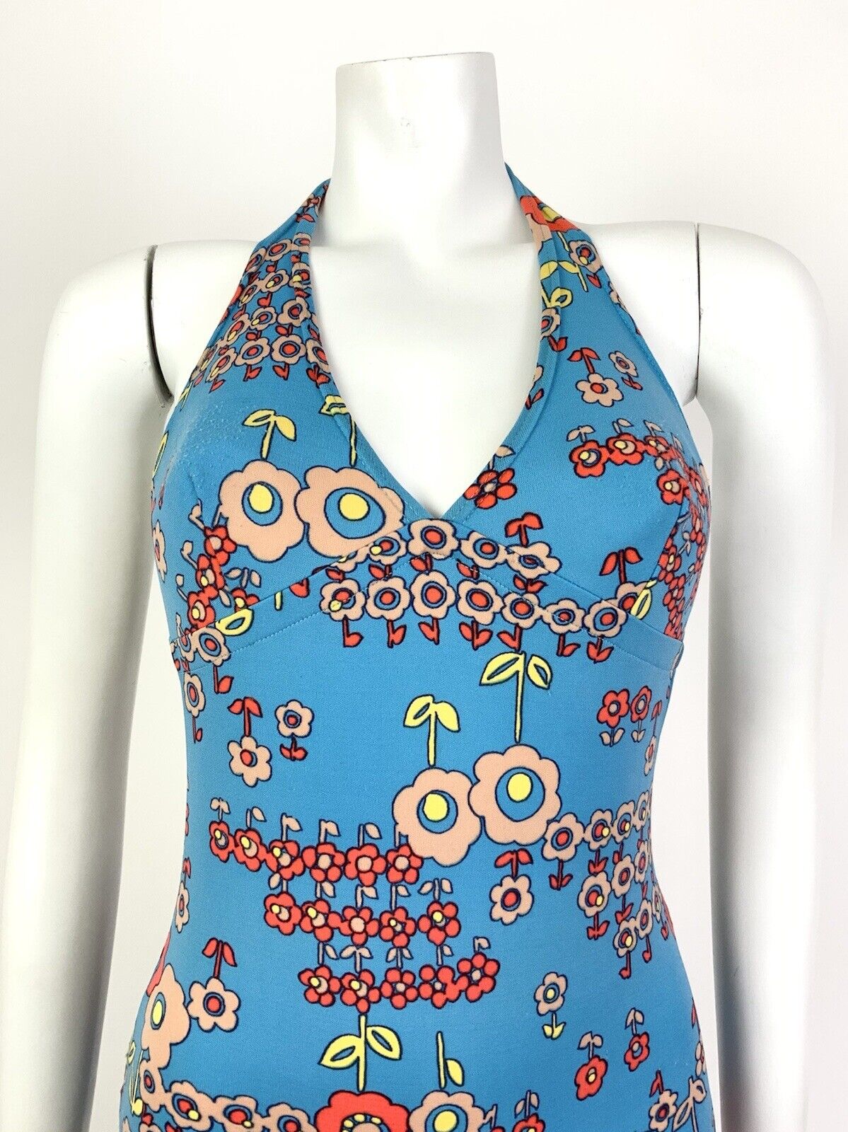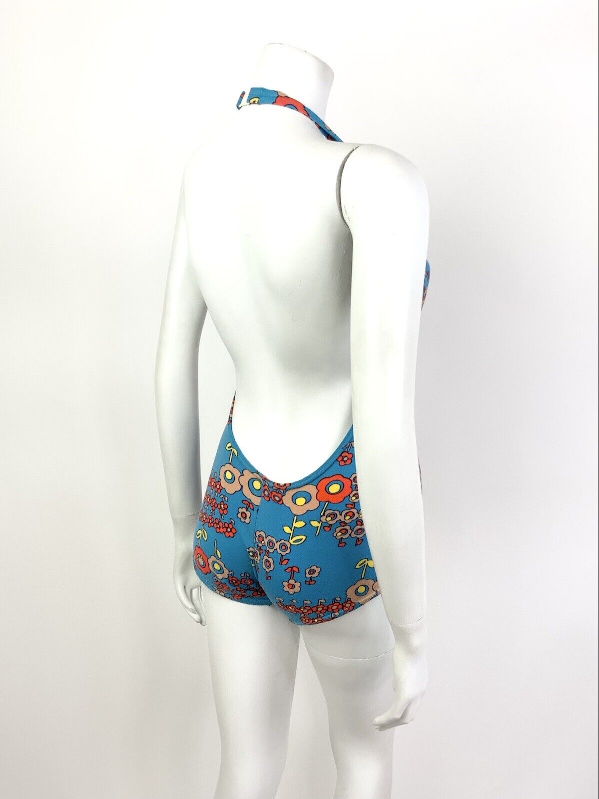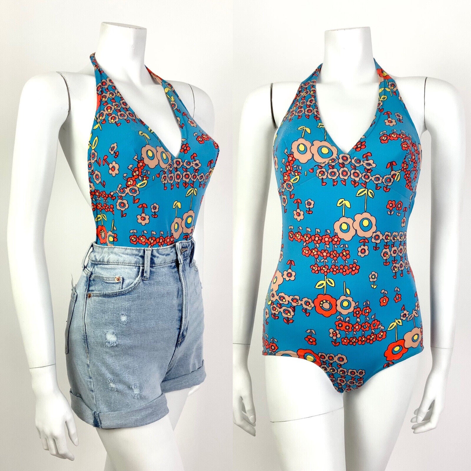 VTG 60s 70s BLUE ORANGE FLORAL DAISY MOD PSYCHEDELIC BATHING SWIM SUIT 8 10