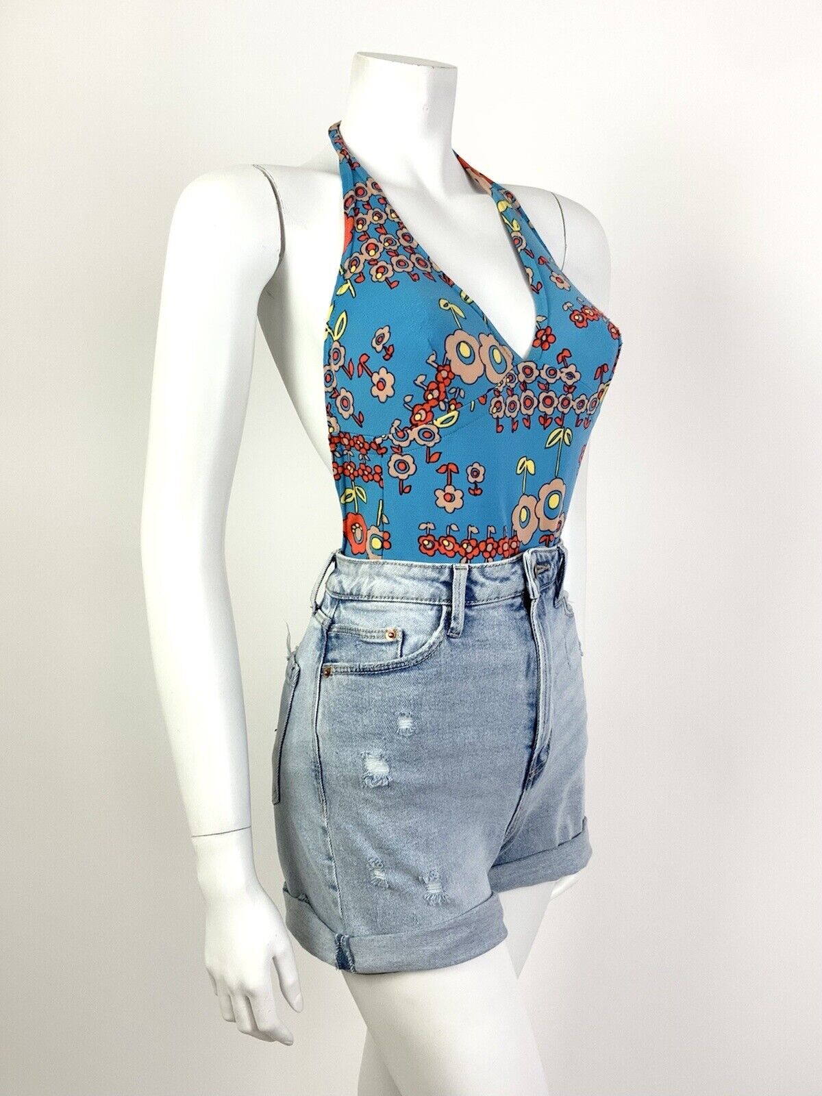 Featuring a low plunging v-shaped neckline, long thin halter straps that fasten at the back, fitted cups in the bust, a low fitting back, and low rise hips.