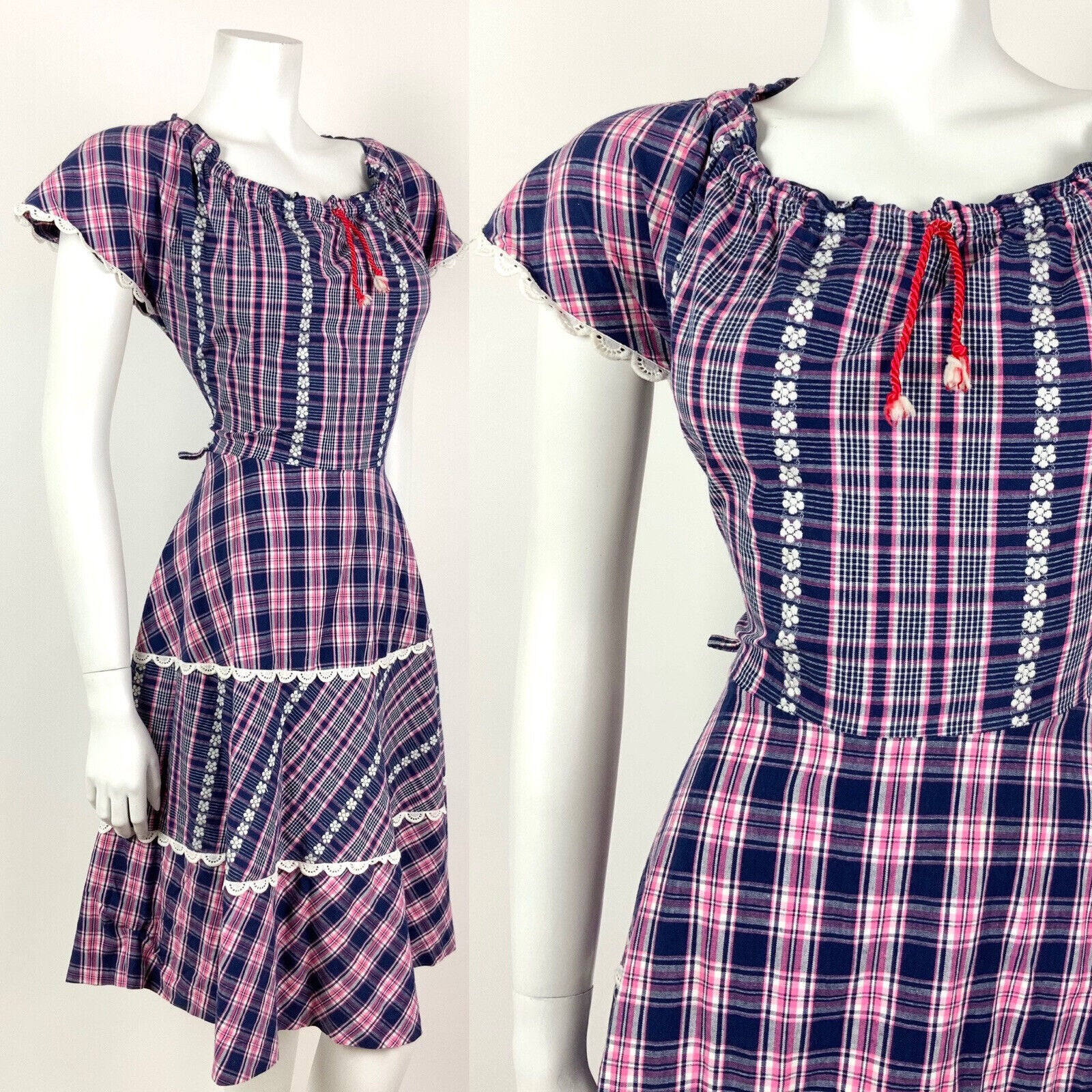 VTG 60s 70s BLUE PINK WHITE TARTAN PLAID FLORAL EMBROIDERED LACE PRAIRIE DRESS 8