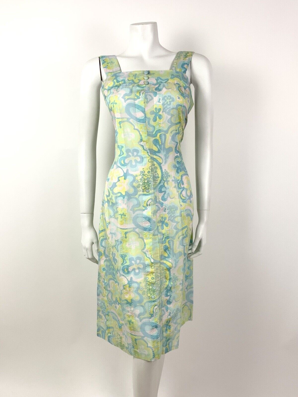 VTG 60s 70s BLUE PINK YELLOW GREEN PSYCHEDELIC FLORAL SLEEVELESS PINNY DRESS 10