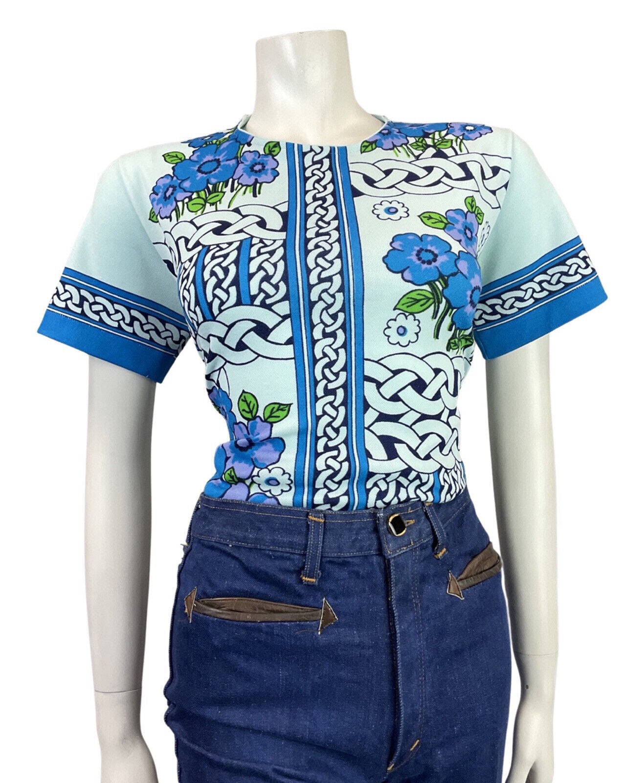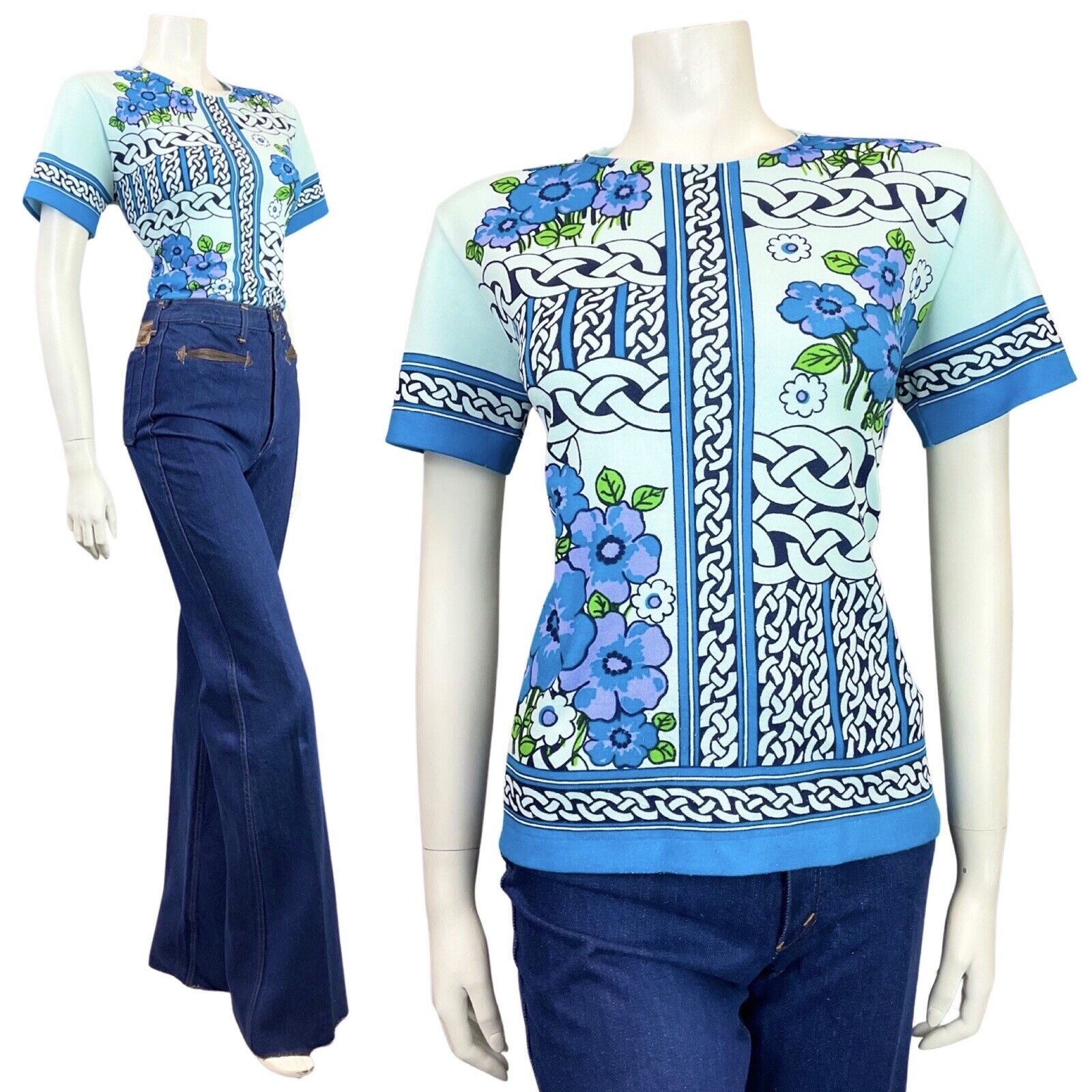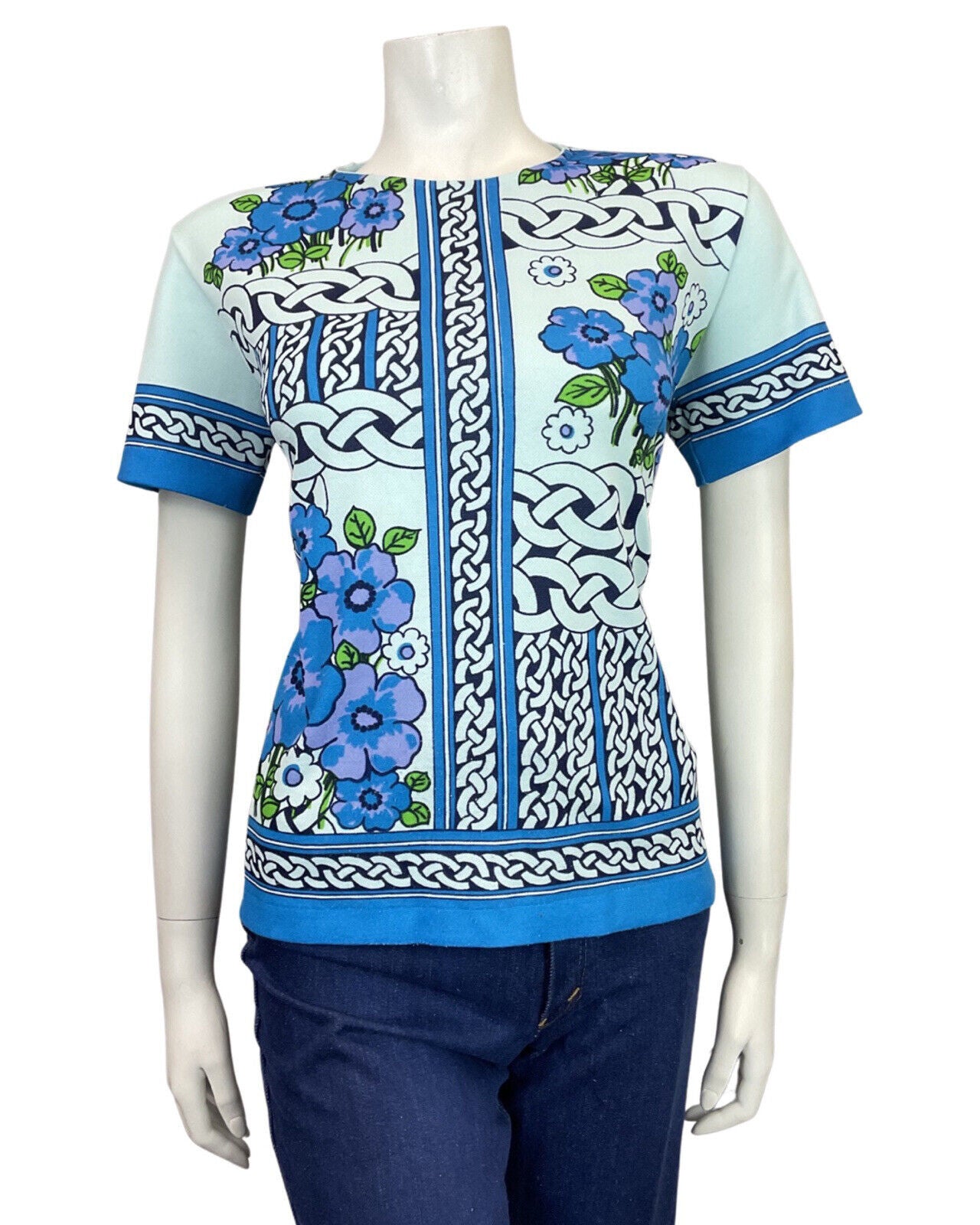 VTG 60s 70s BLUE PURPLE BLACK CELTIC KNOT FLORAL SHORT SLEEVE BLOUSE TOP 12 14