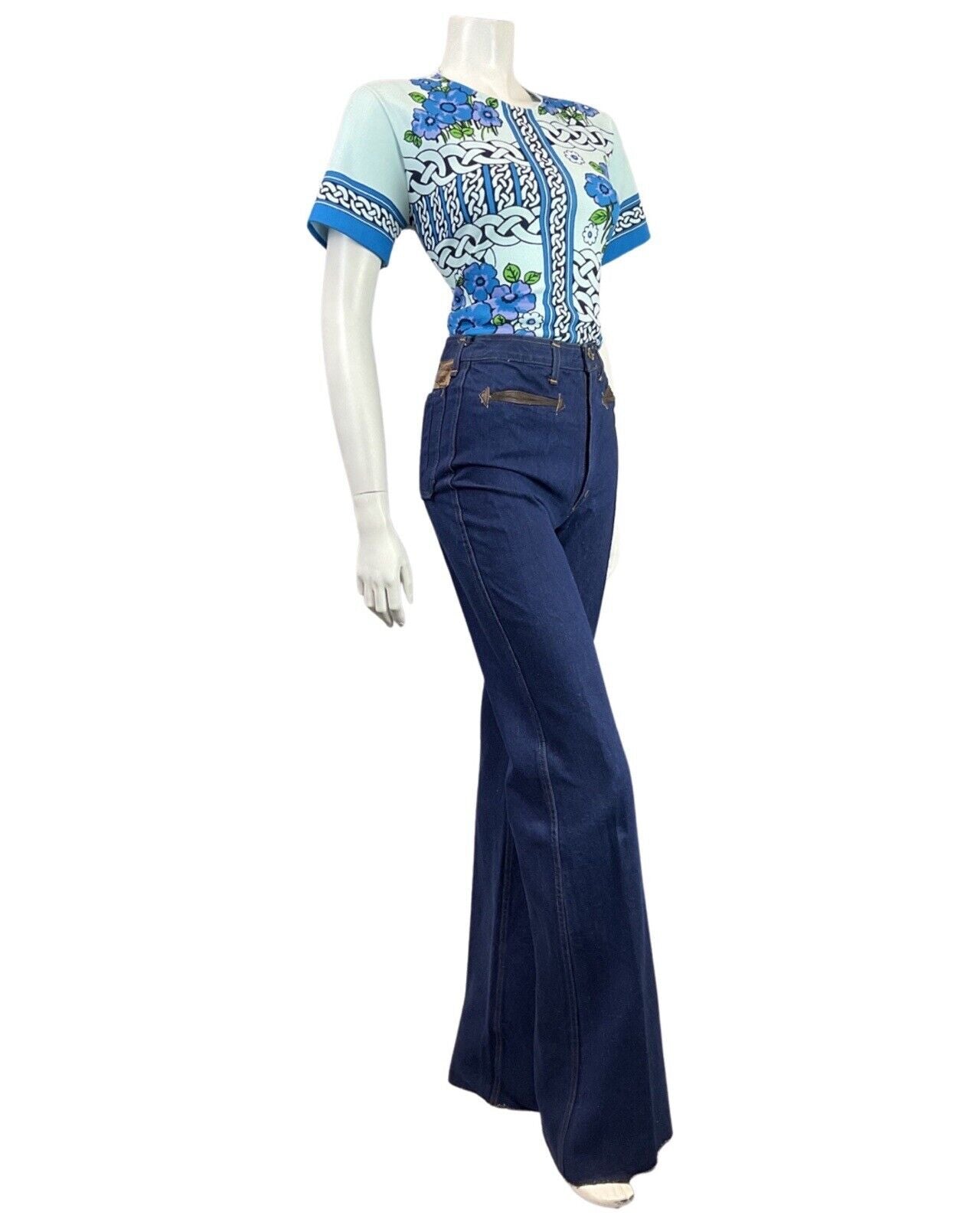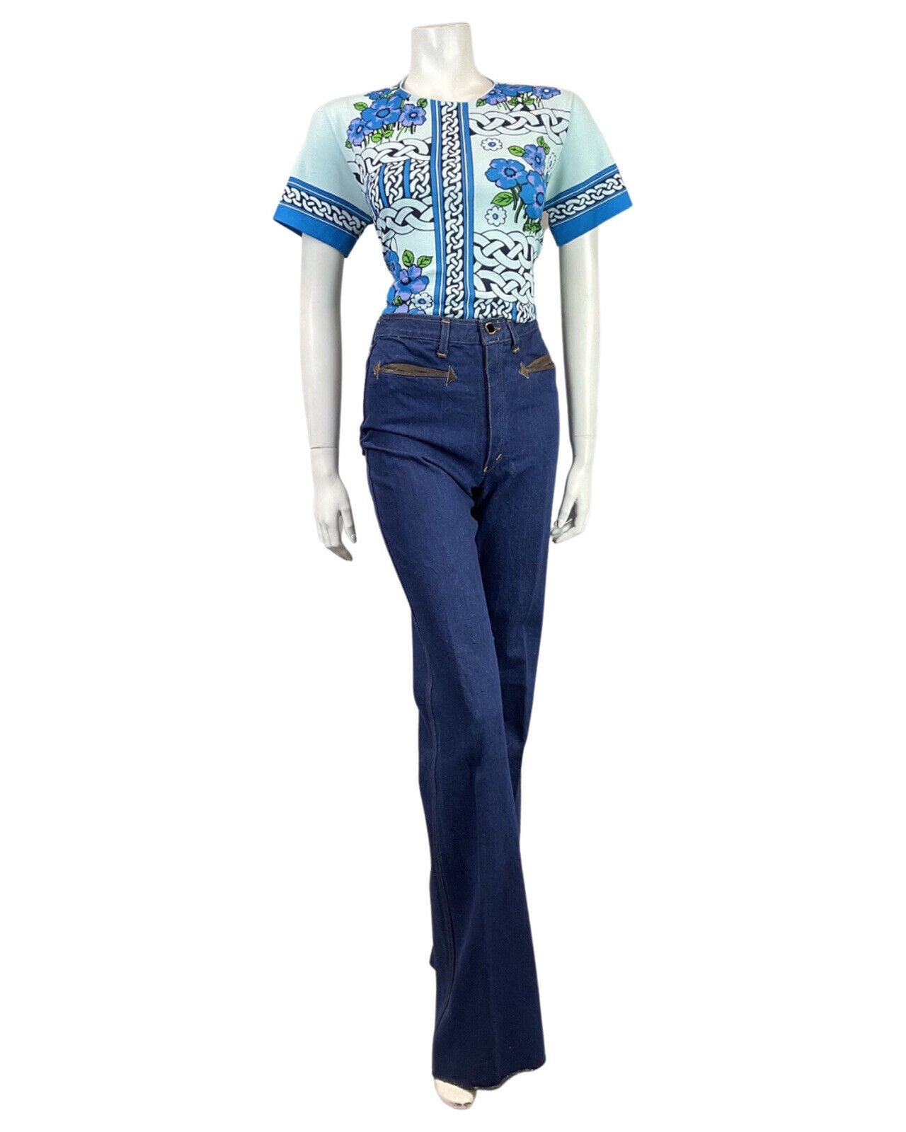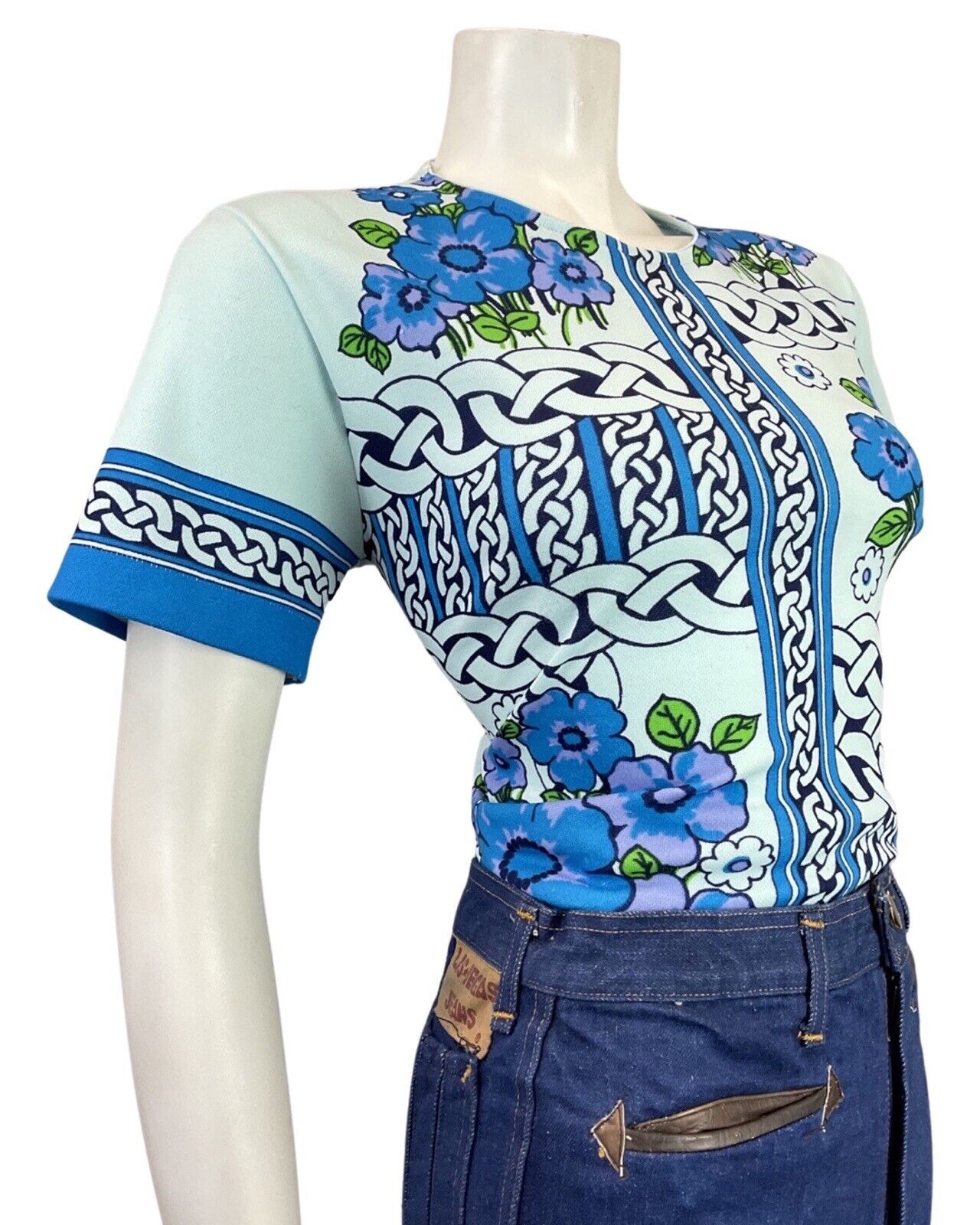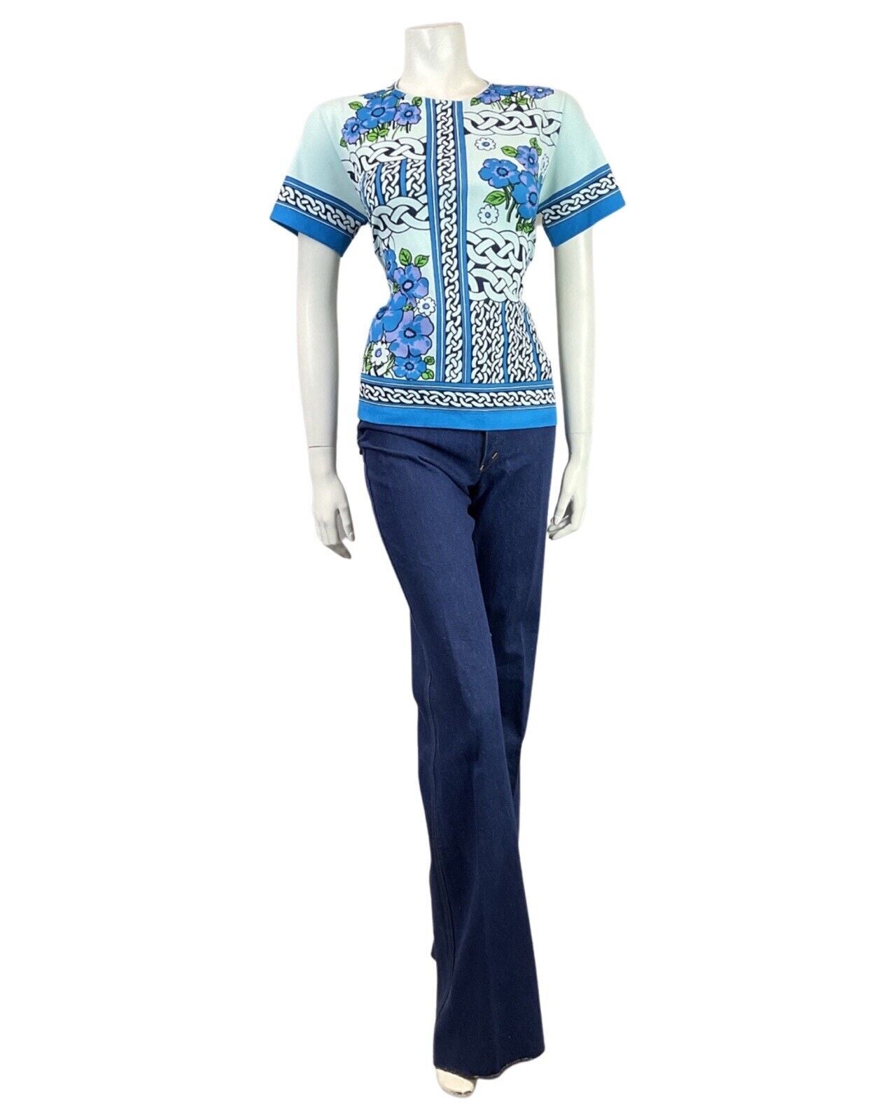 VTG 60s 70s BLUE PURPLE BLACK CELTIC KNOT FLORAL SHORT SLEEVE BLOUSE TOP 12 14