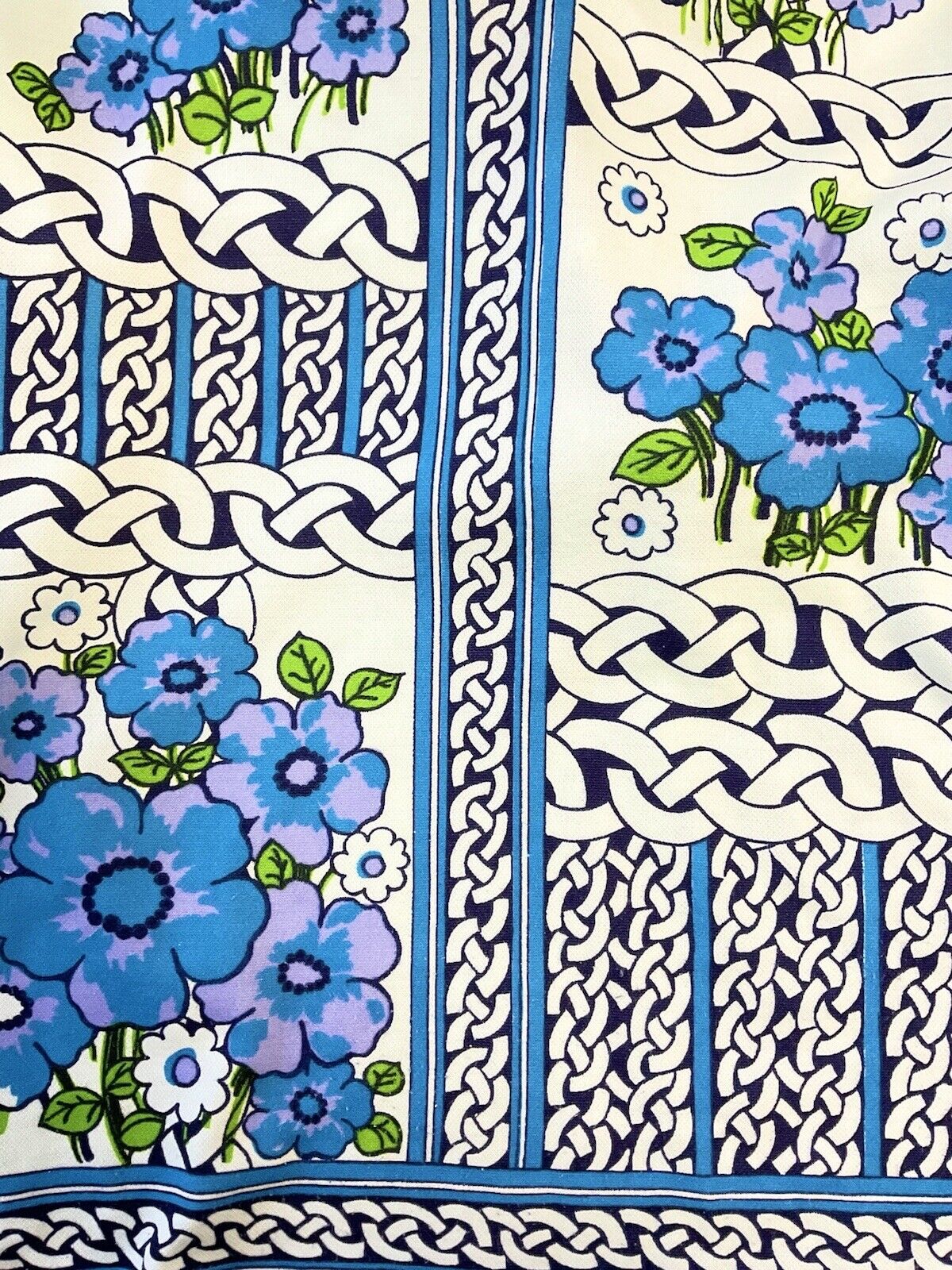 Covering the top is a celtic knot pattern with large blue and purple flowers in between.