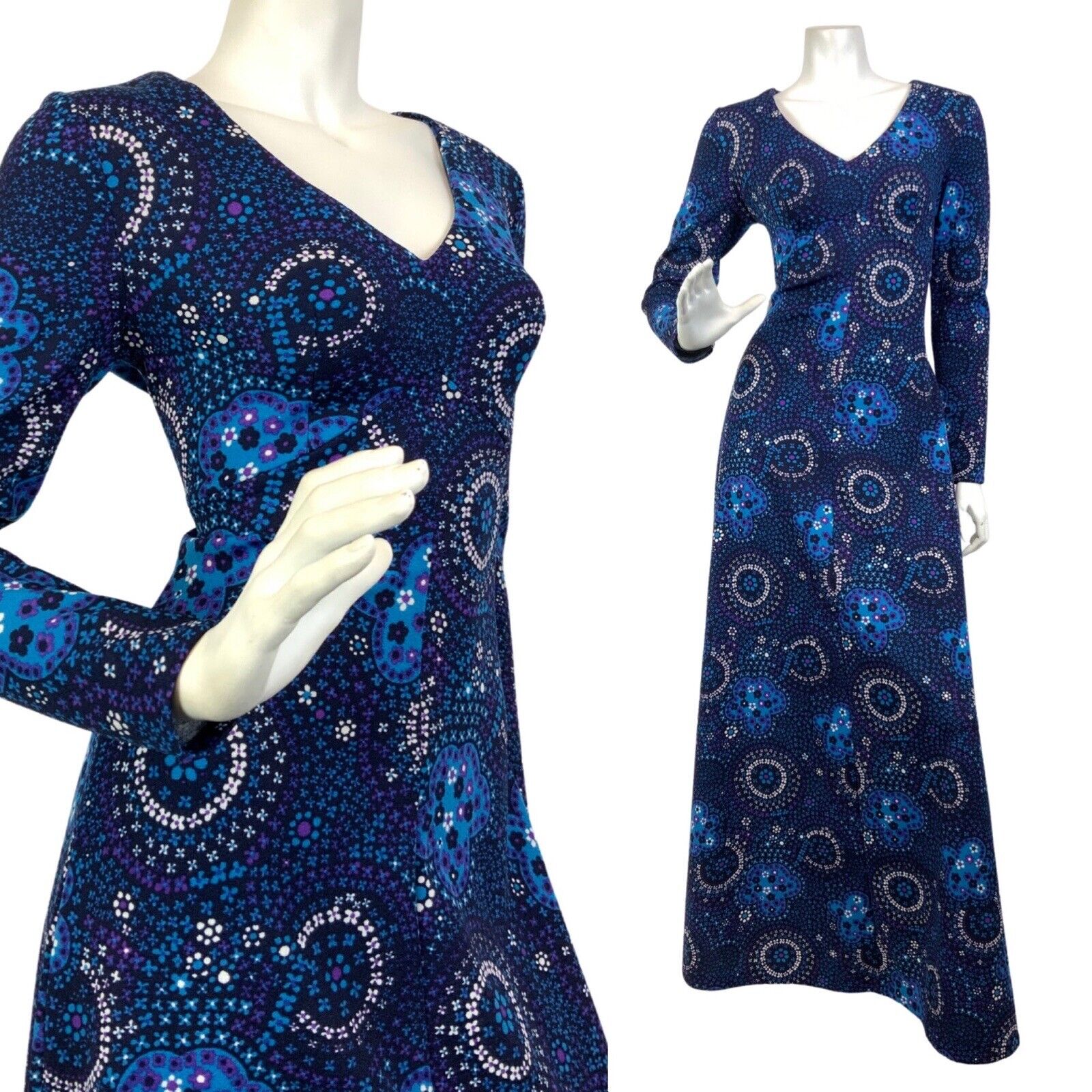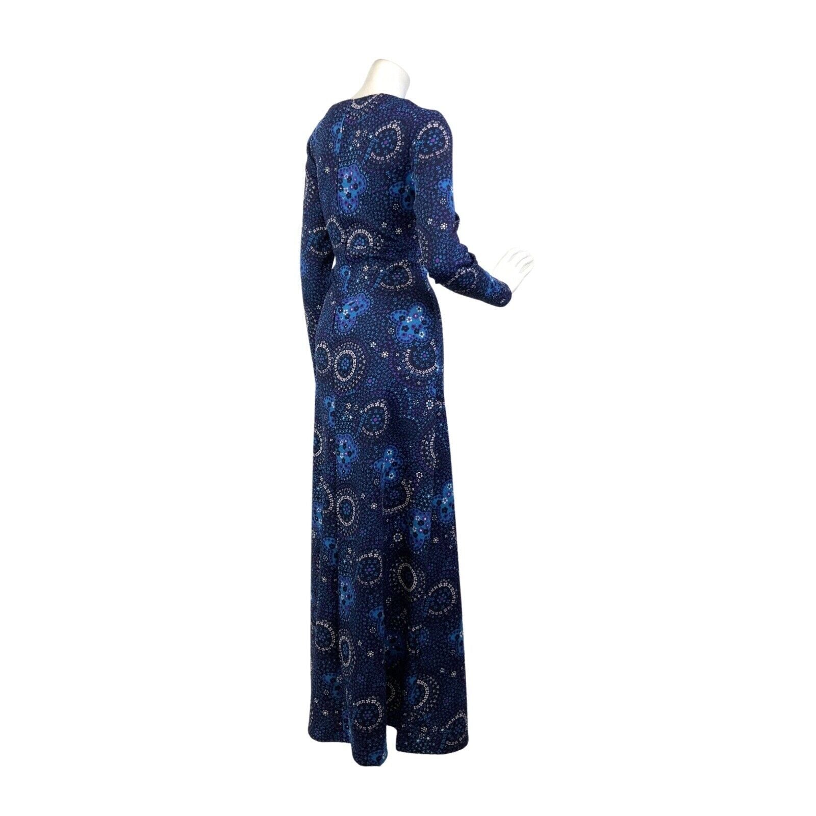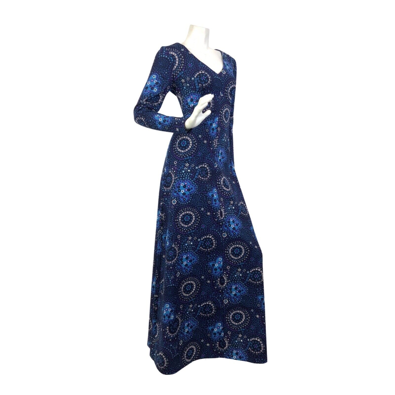VTG 60s 70s BLUE PURPLE WHITE PSYCHEDELIC FLORAL DITSY MANDALA MAXI DRESS 10 12