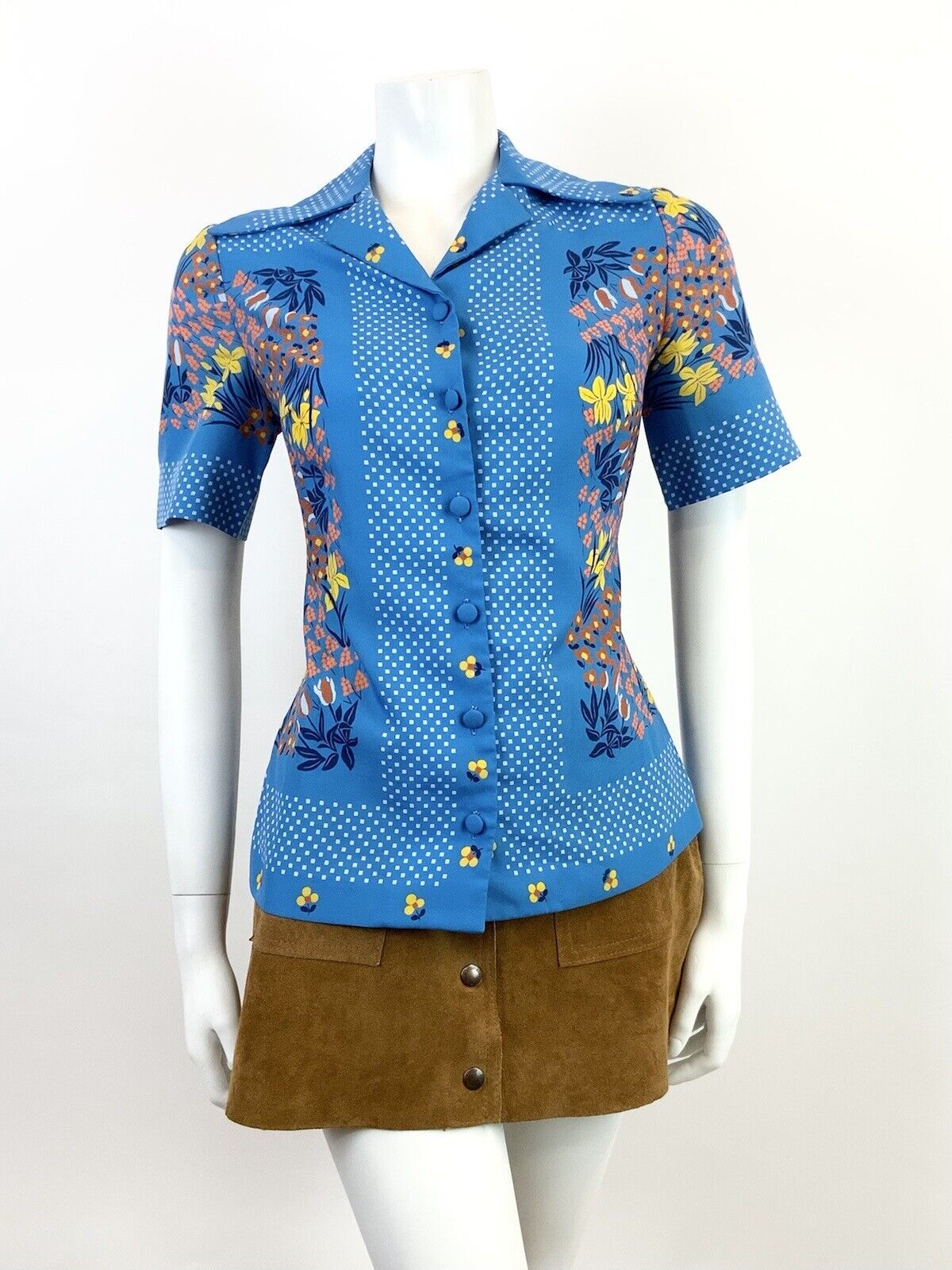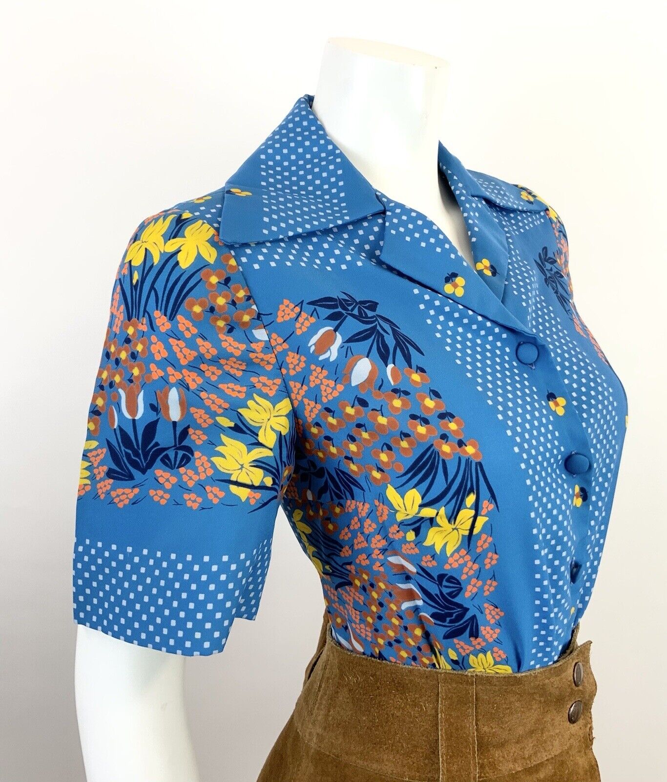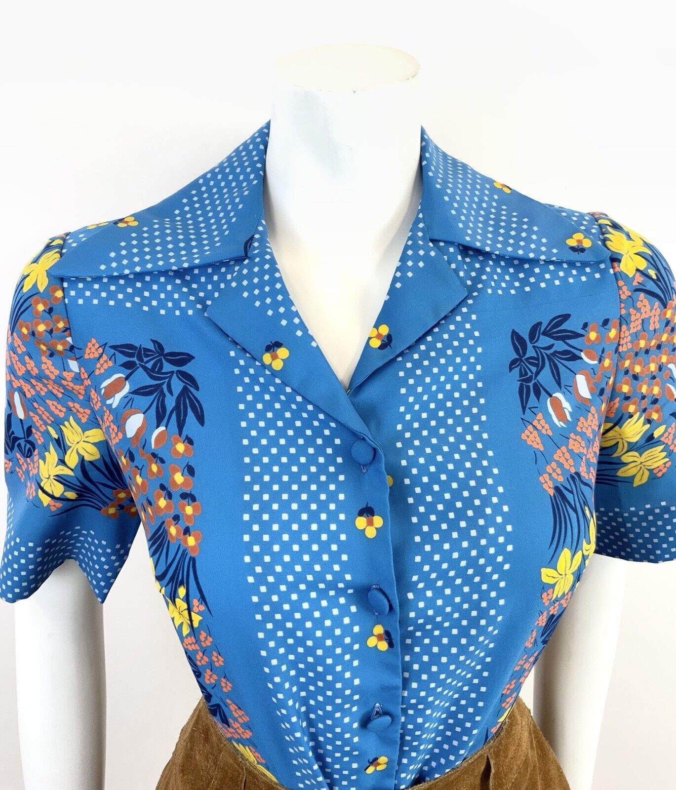 VTG 60s 70s BLUE YELLOW ORANGE FLORAL PSYCHEDELIC CHECKED DAGGER BLOUSE TOP 12