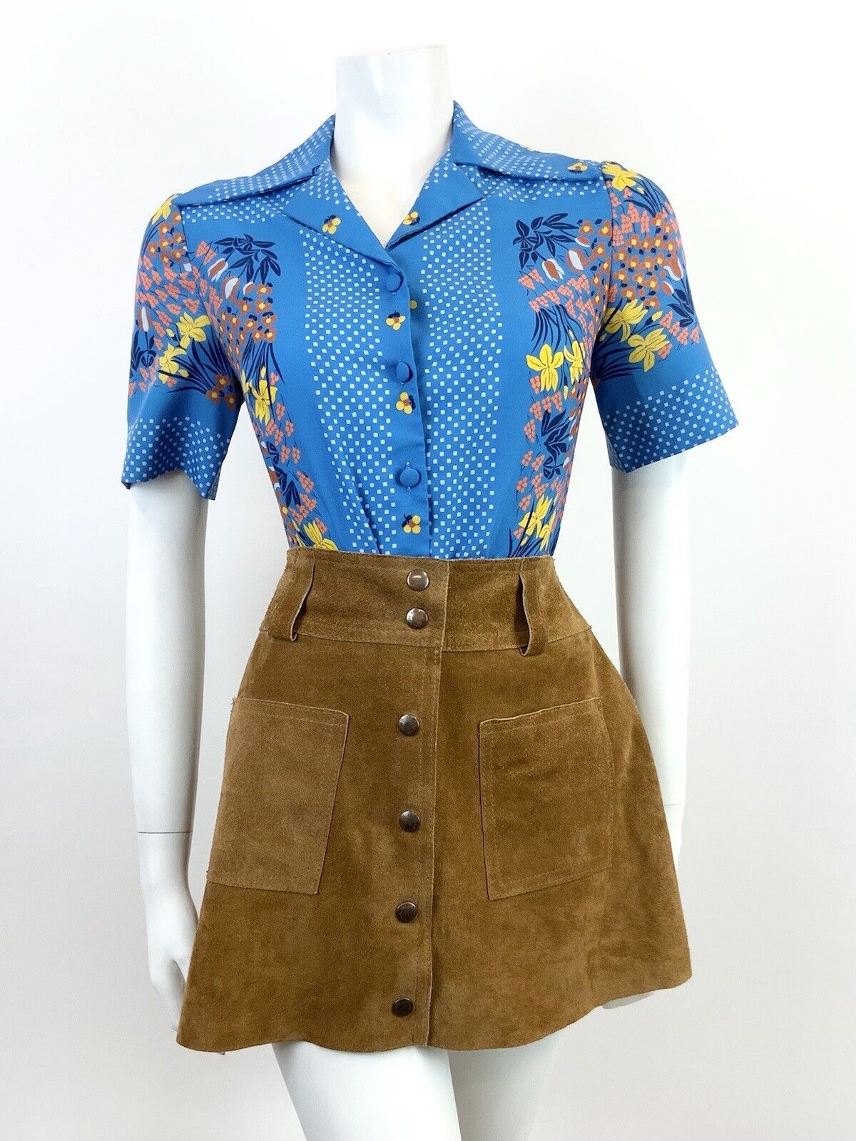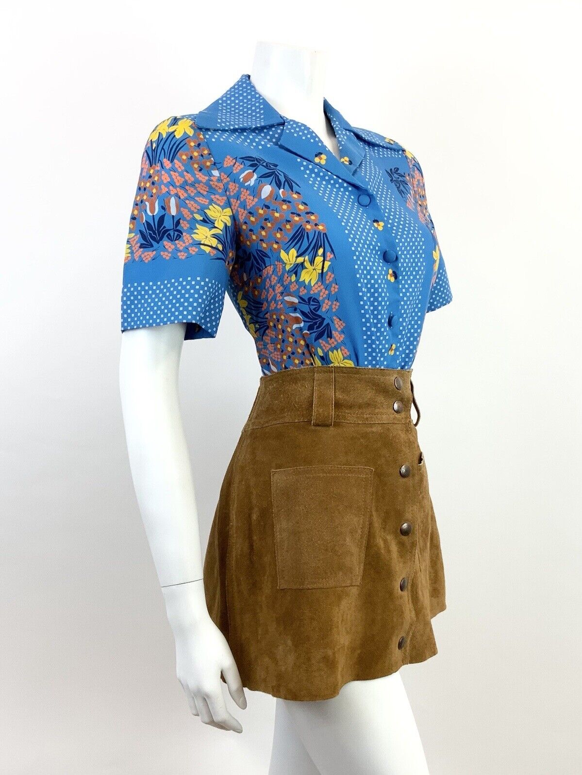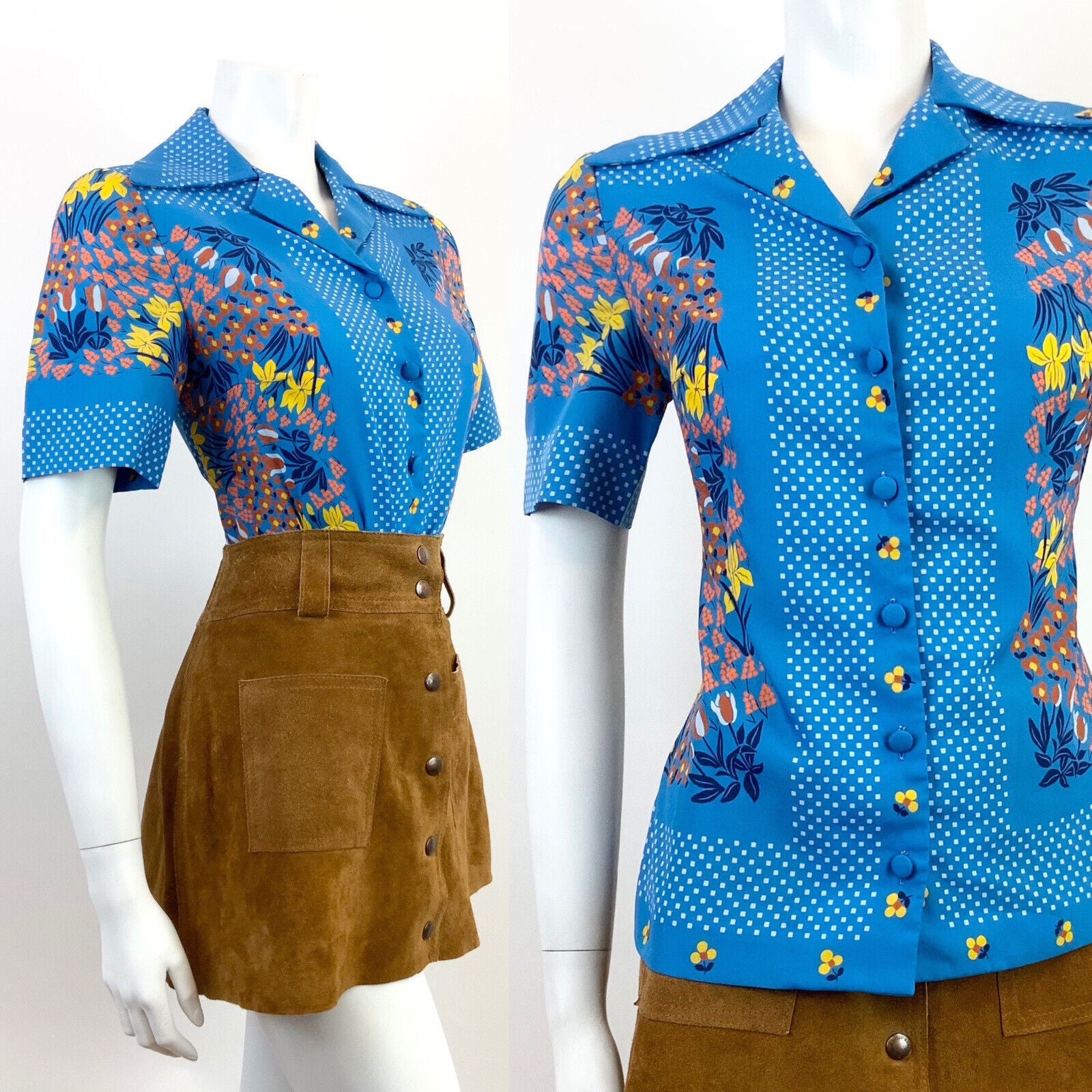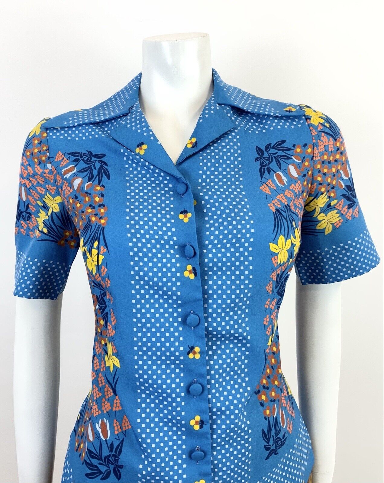 VTG 60s 70s BLUE YELLOW ORANGE FLORAL PSYCHEDELIC CHECKED DAGGER BLOUSE TOP 12