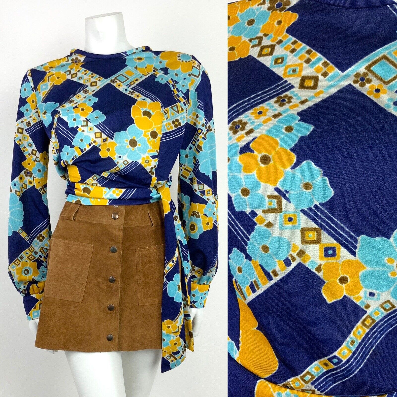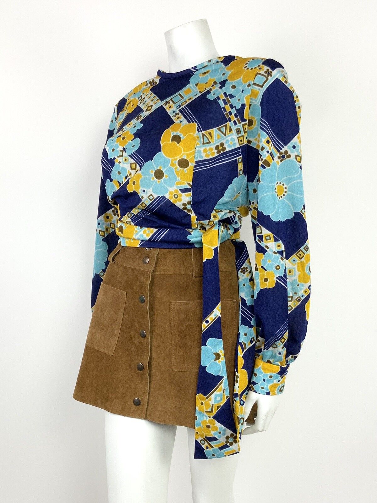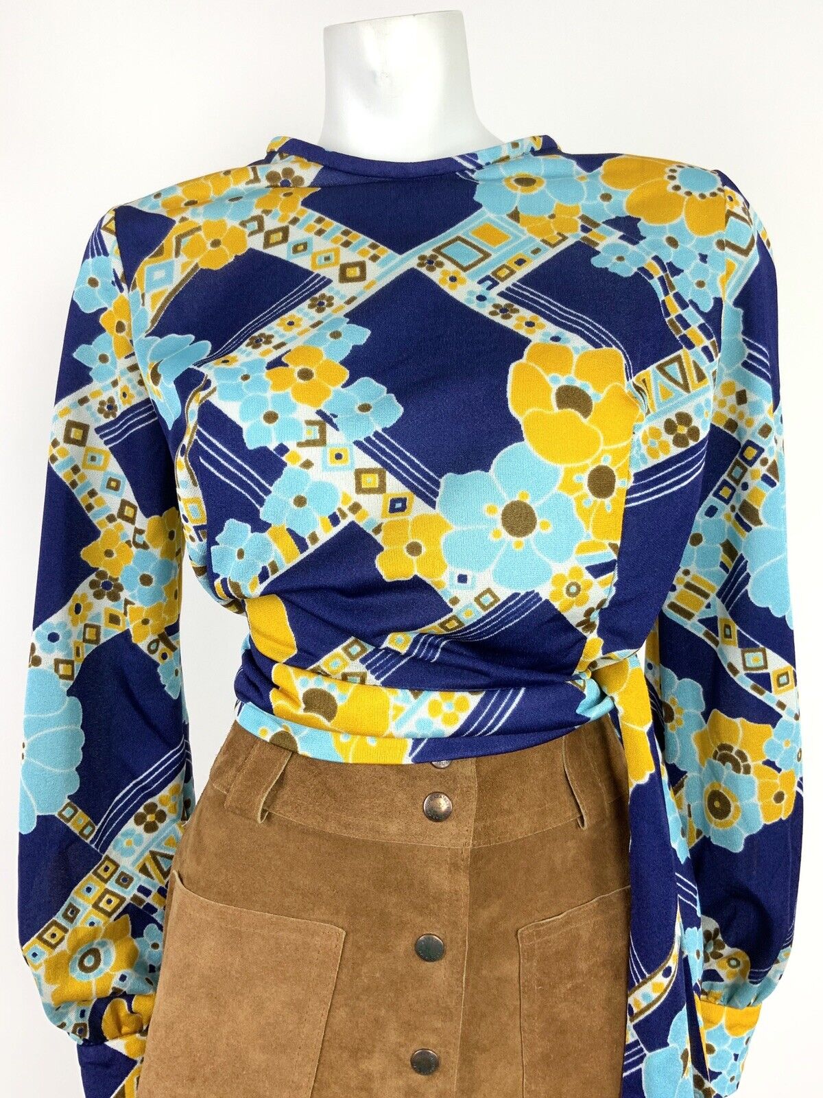 VTG 60s 70s BLUE YELLOW WHITE GLITTER GEOMETRIC FLORAL PSYCH BLOUSE 10 12 14
