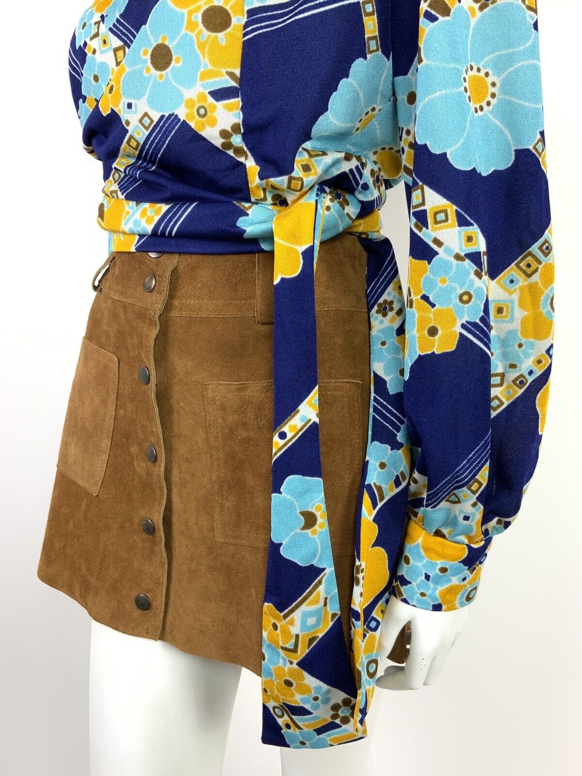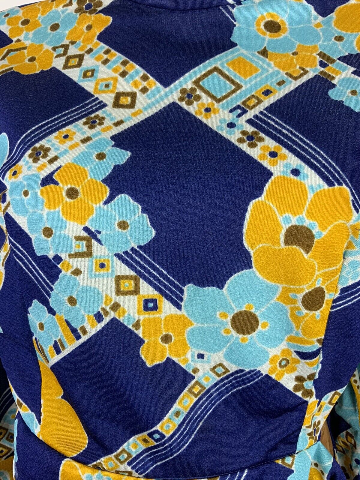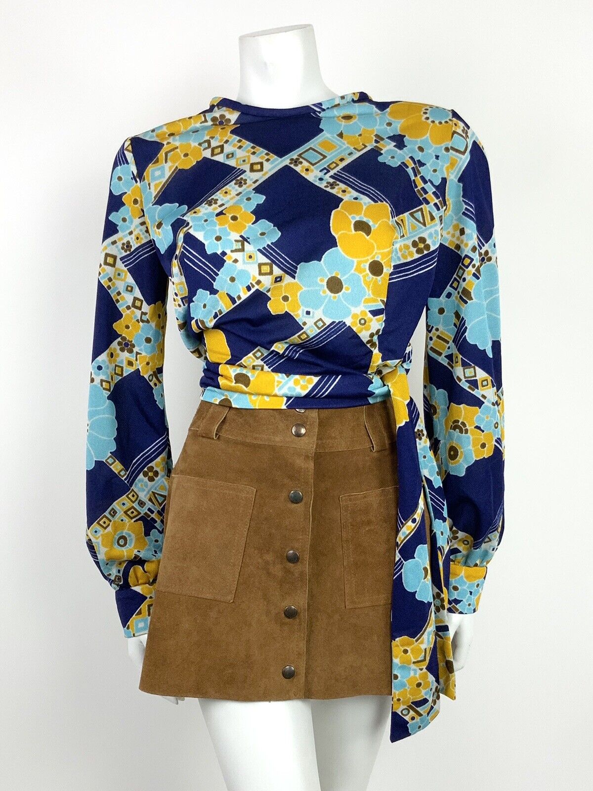 VTG 60s 70s BLUE YELLOW WHITE GLITTER GEOMETRIC FLORAL PSYCH BLOUSE 10 12 14