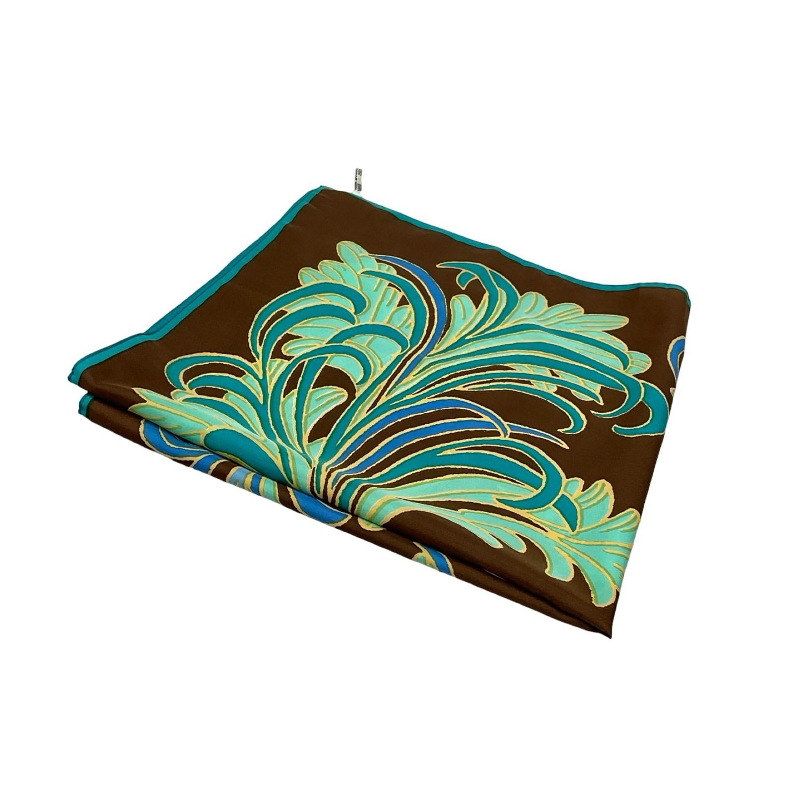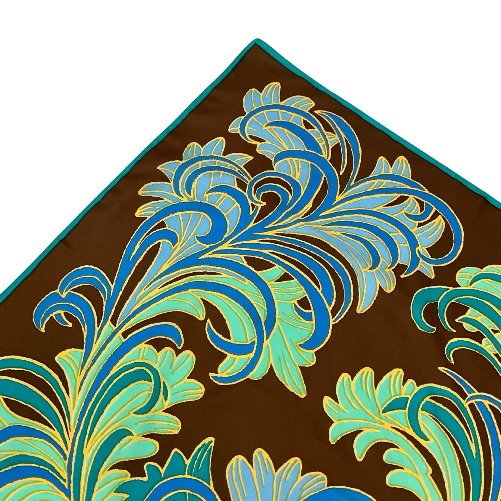 This is a gorgeous 60s 70s scarf made from synthetics, and printed with green, blue and yellow feather-like swirls on a brown background.