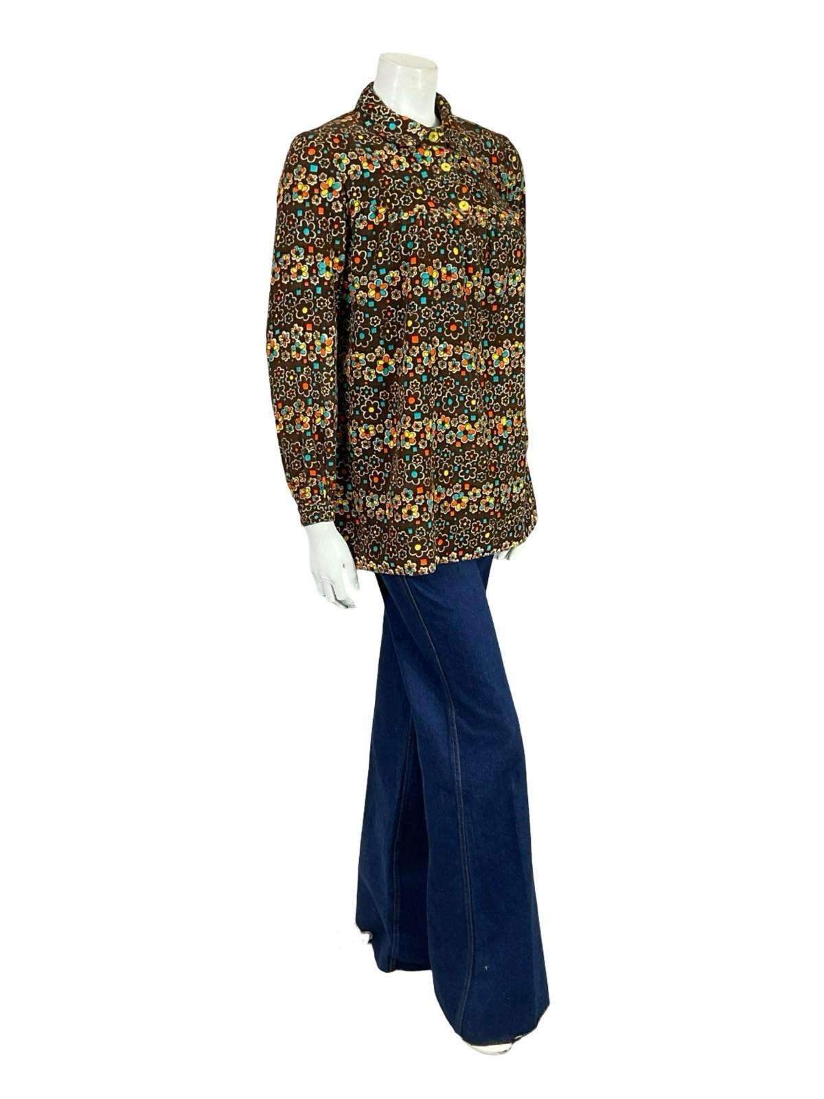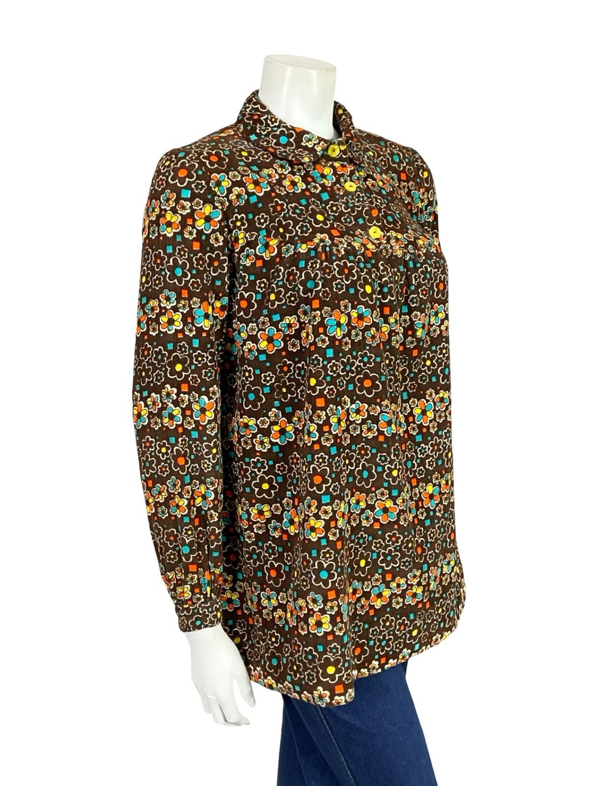 This is a cute 60s 70s long sleeve smock shirt, with a curved yoke and peter pan collar. This shirt is made from a brown corduroy printed with white, blue, yellow and orange daisies, and has no inner lining. This shirt has 3 pentagonal bright yellow buttons below the collar, and a matching button on each cuff to fasten you in.