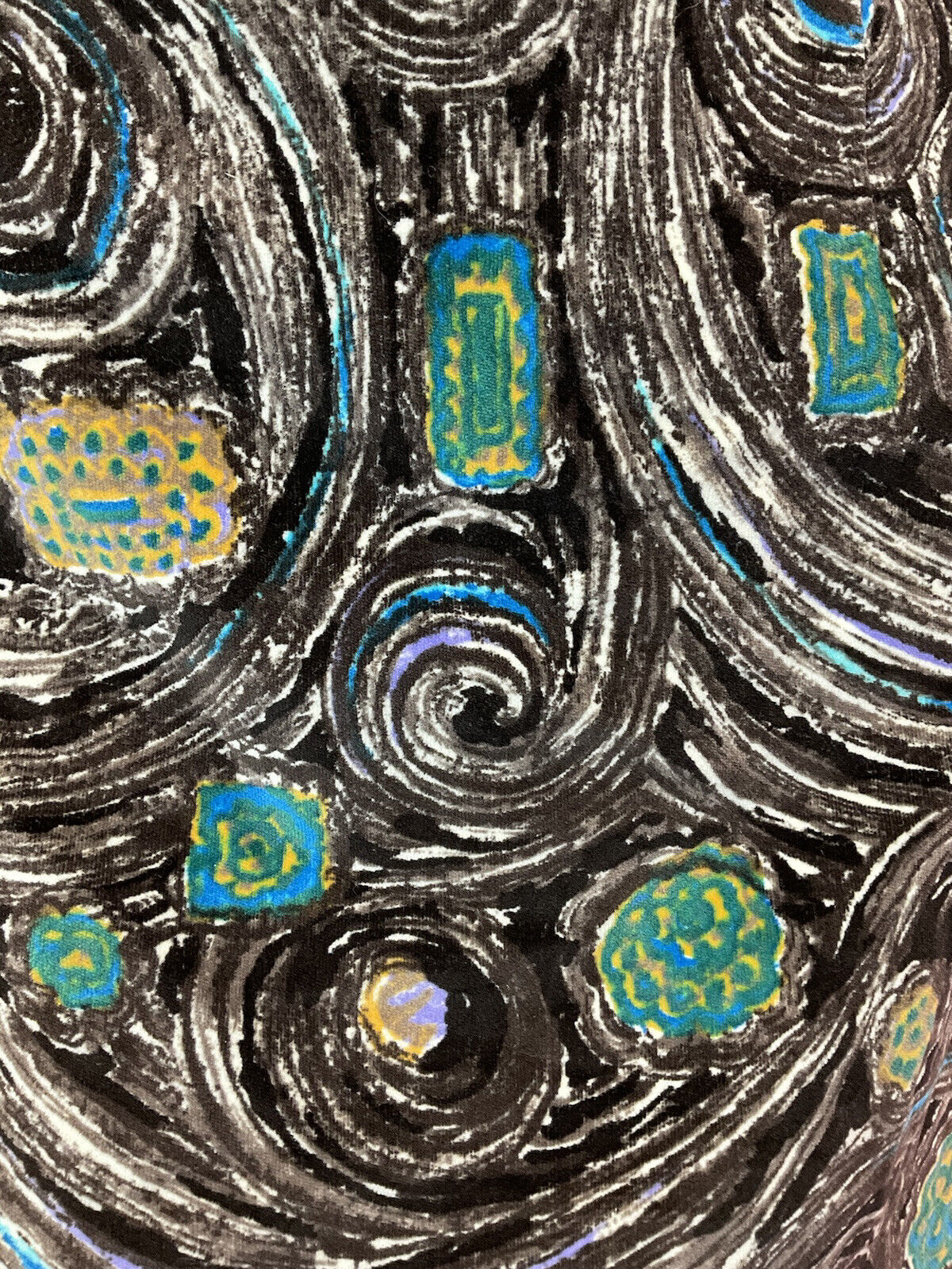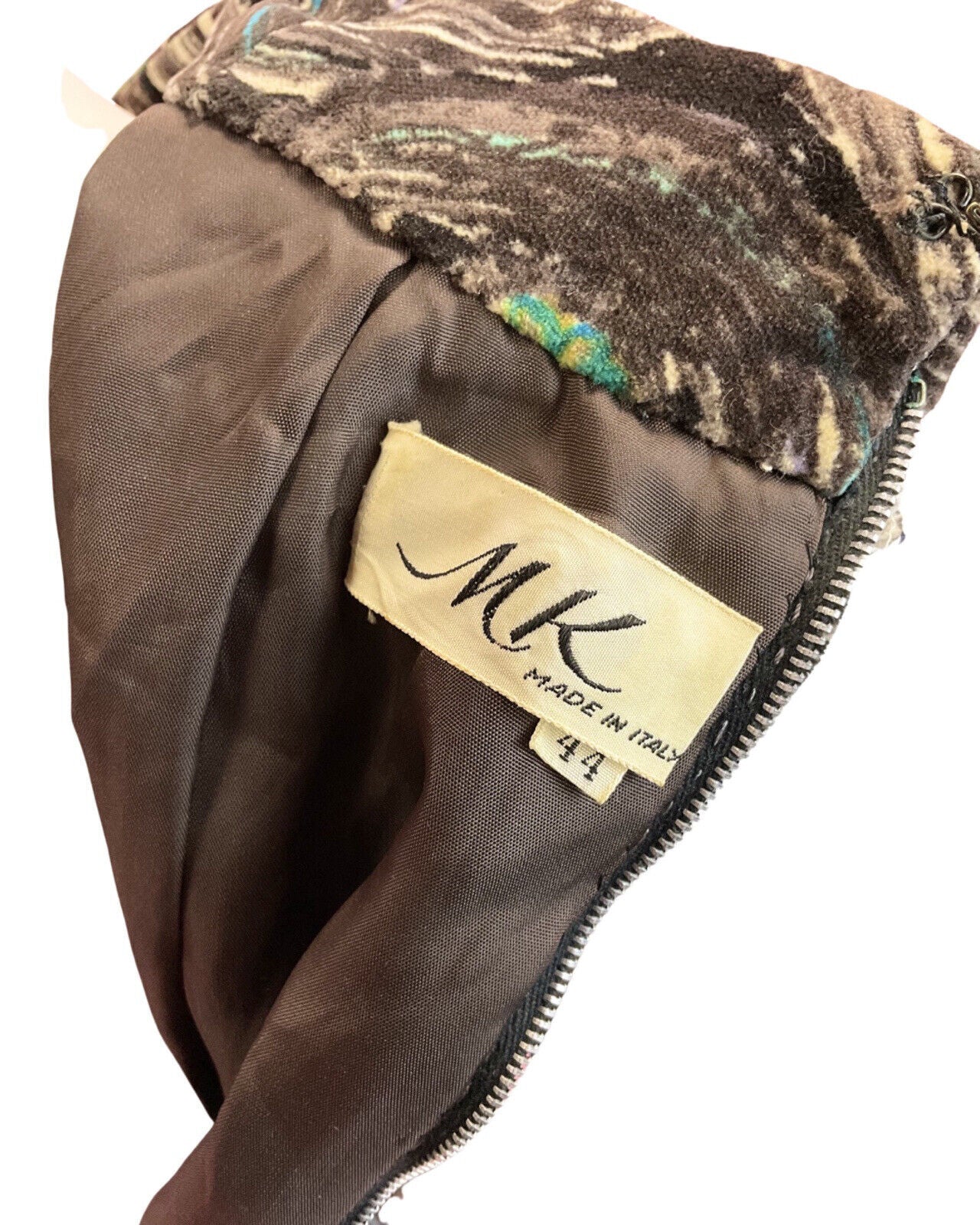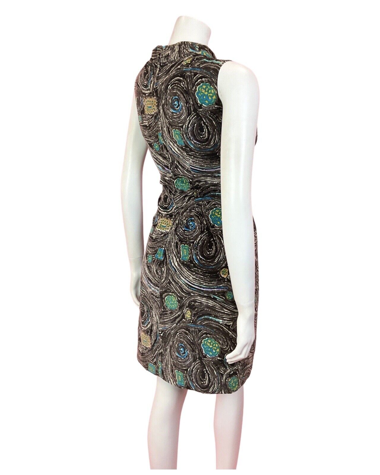 VTG 60s 70s BROWN CREAM BLUE PSYCHEDELIC SWIRL FLOWER VELVET WIGGLE DRESS 8 10