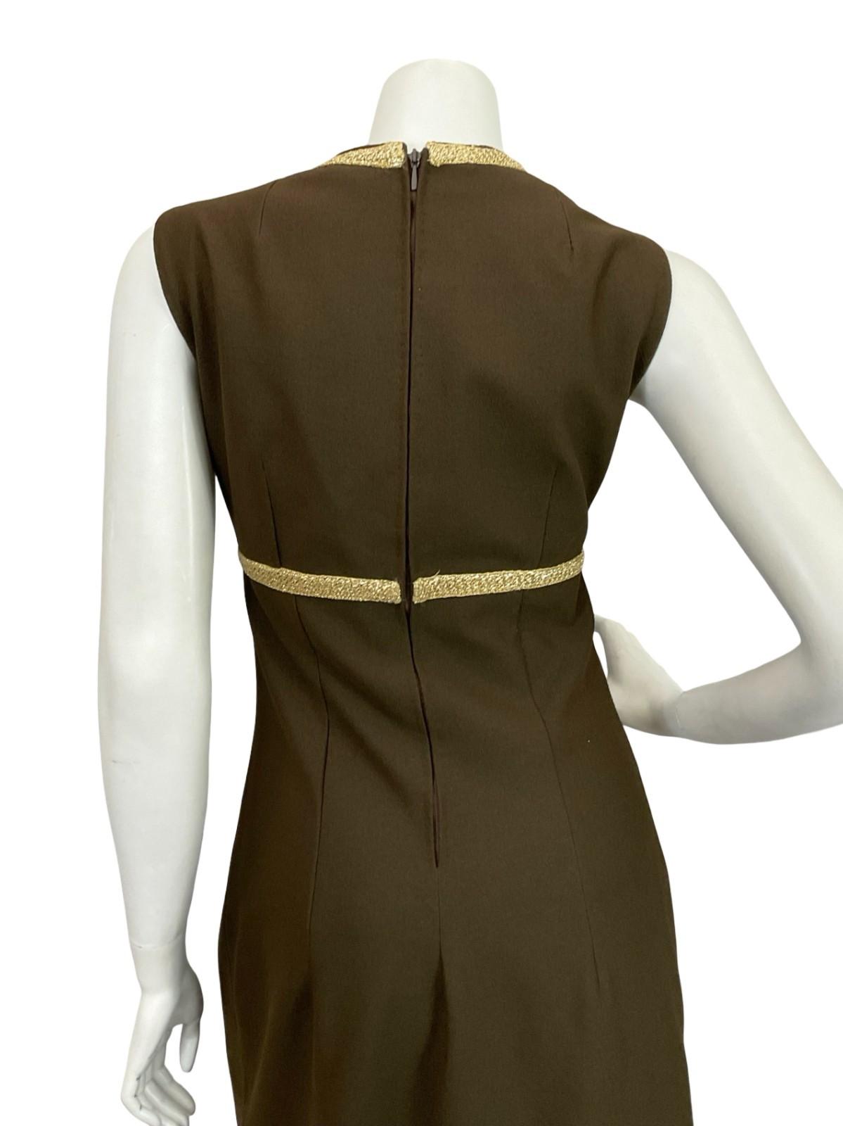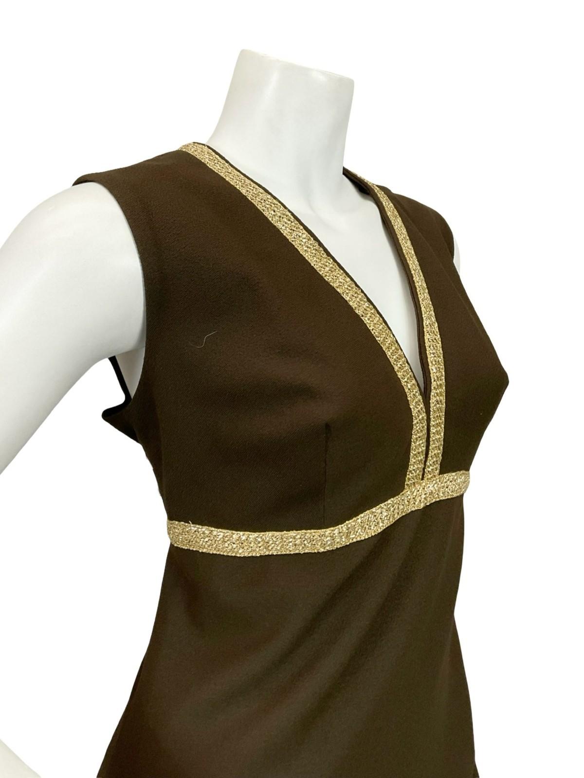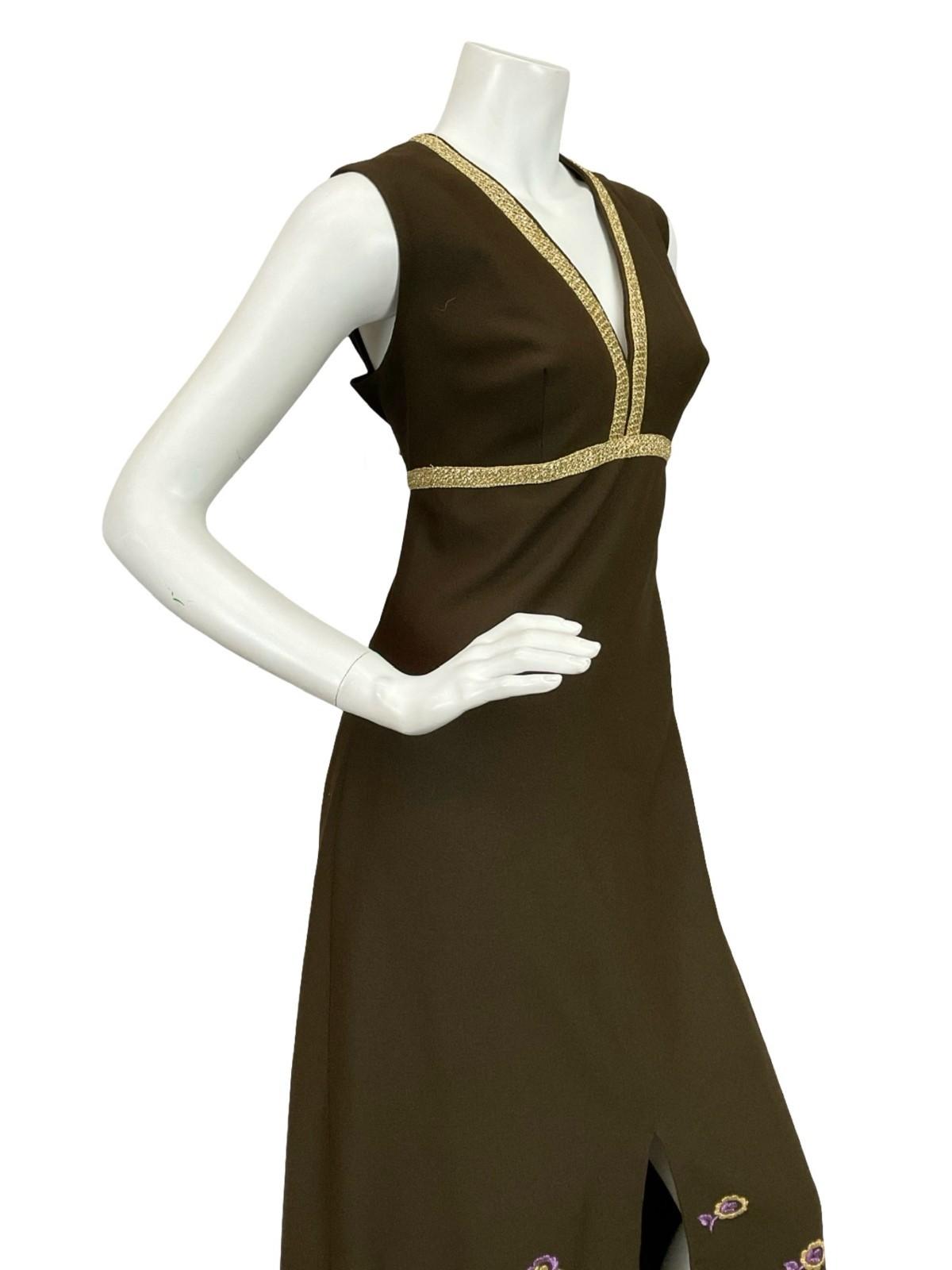 VTG 60S 70S BROWN GOLD PURPLE FLORAL EMBROIDERED EMPIRE PLUNGE MAXI DRESS 10