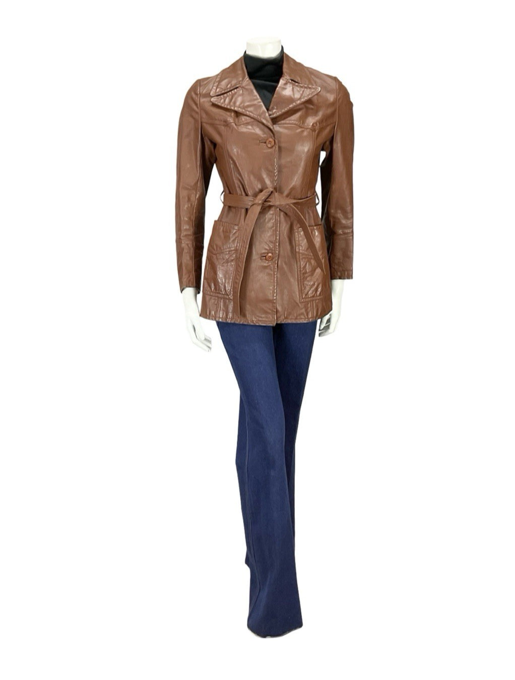 This is a lovely 60s 70s brown leather jacket with a notch lapel collar, square pockets and leather tie to cinch the waist. This jacket is lined with a silky smooth gold synthetic lining, and buttons down the front via 3 brown buttons. This is a great choice for anyone looking for outerwear that showcases the figure