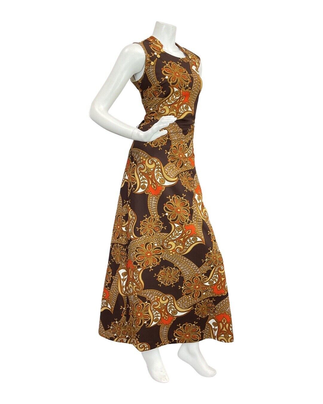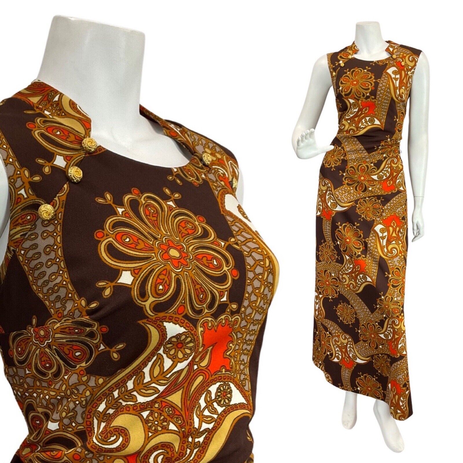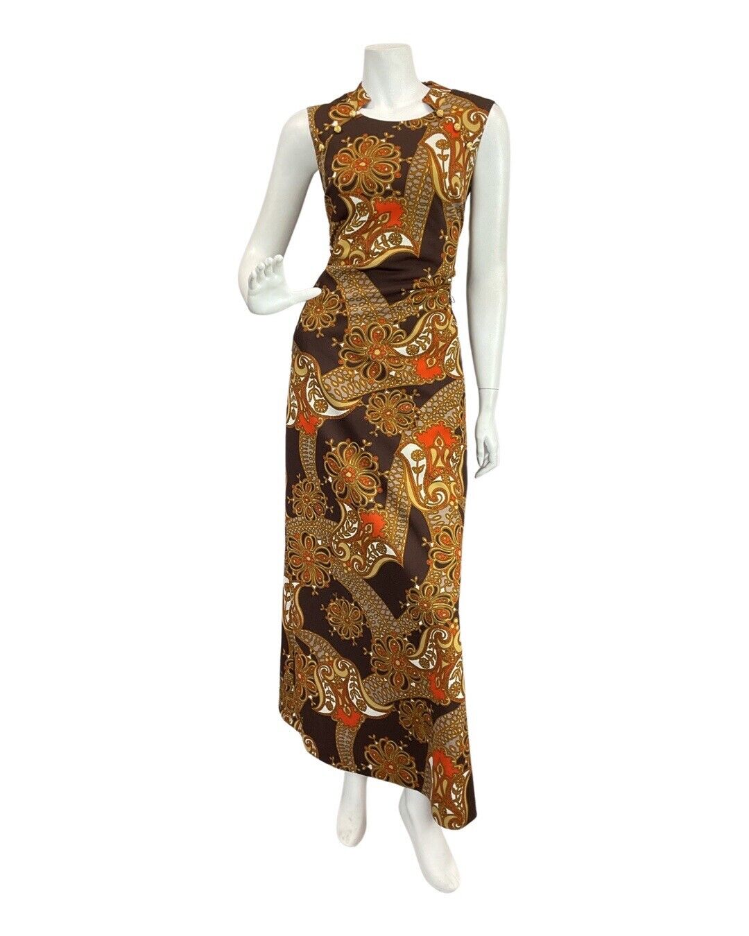 VTG 60s 70s BROWN ORANGE EIGE PSYCHEDELIC FLORAL MOD SLEEVELESS MAXI DRESS 10 12