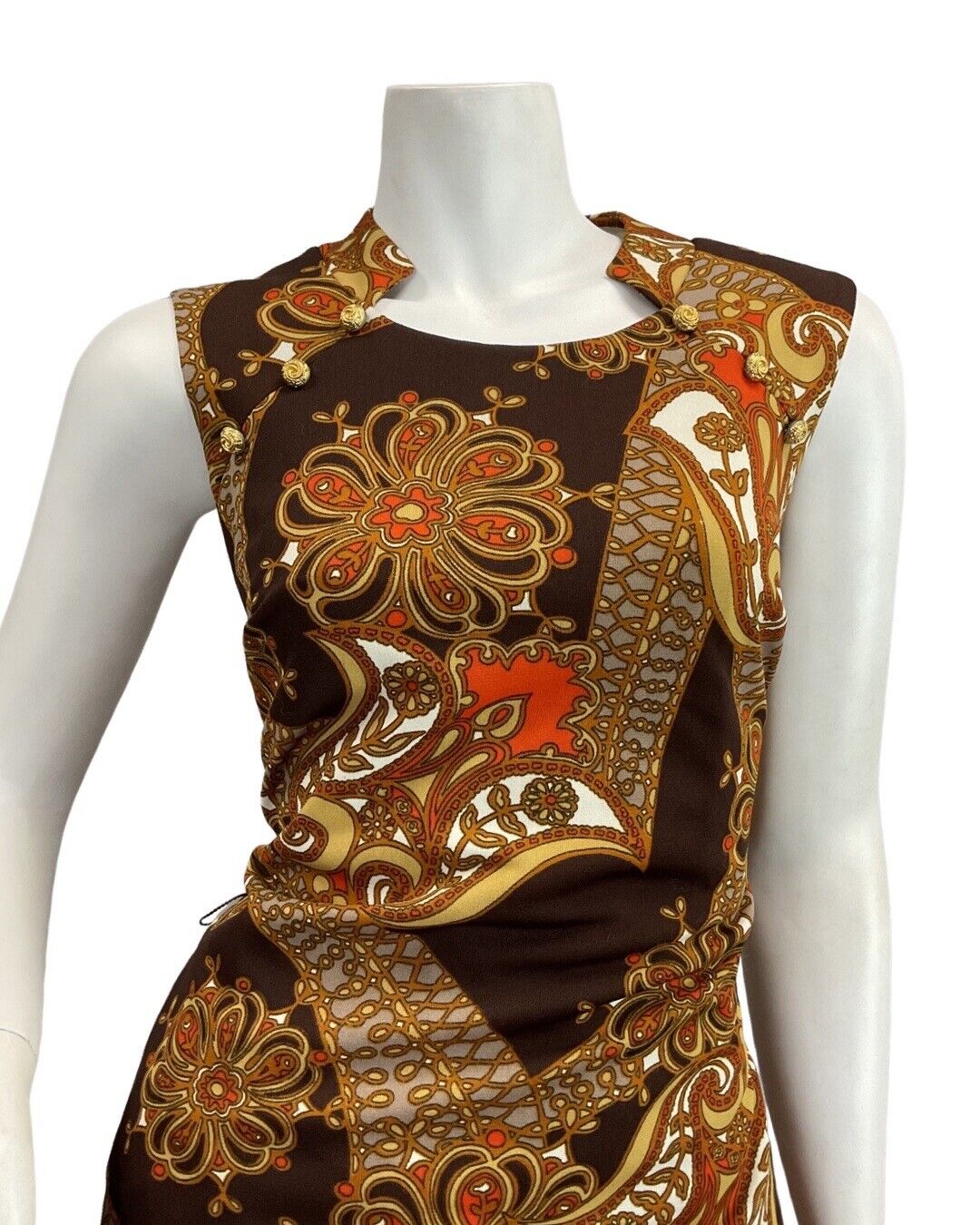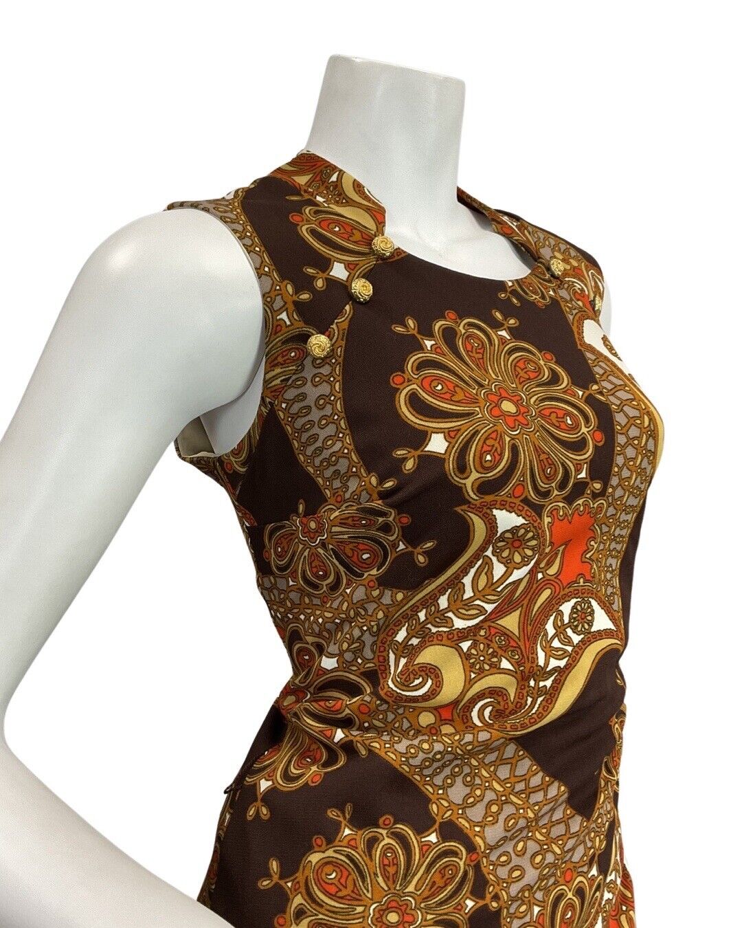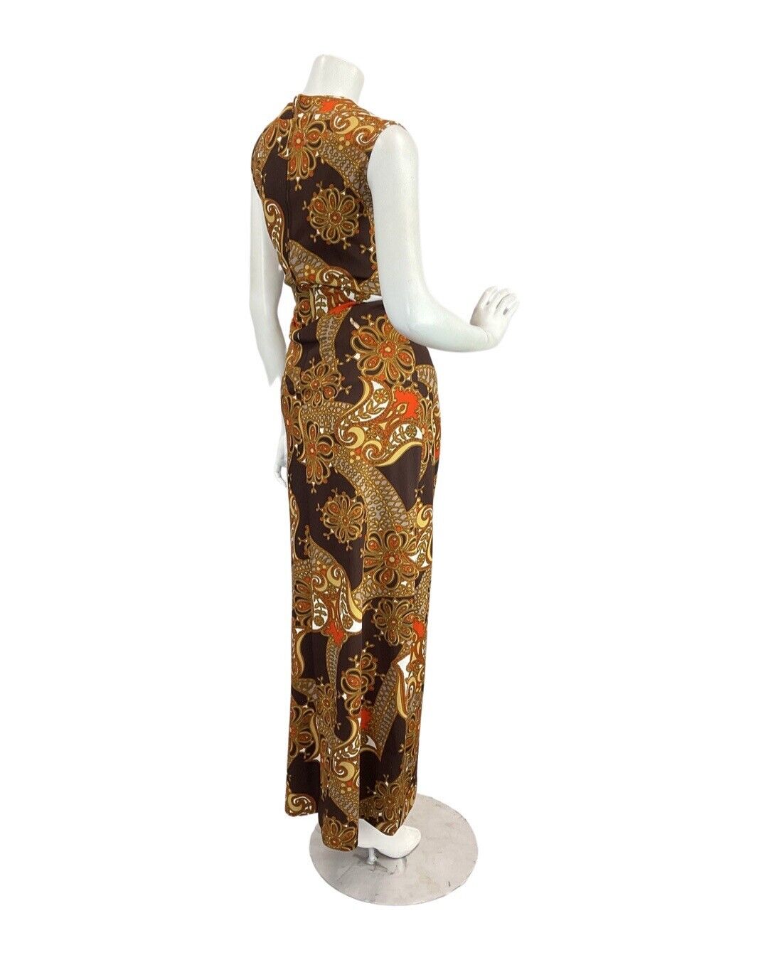 VTG 60s 70s BROWN ORANGE EIGE PSYCHEDELIC FLORAL MOD SLEEVELESS MAXI DRESS 10 12