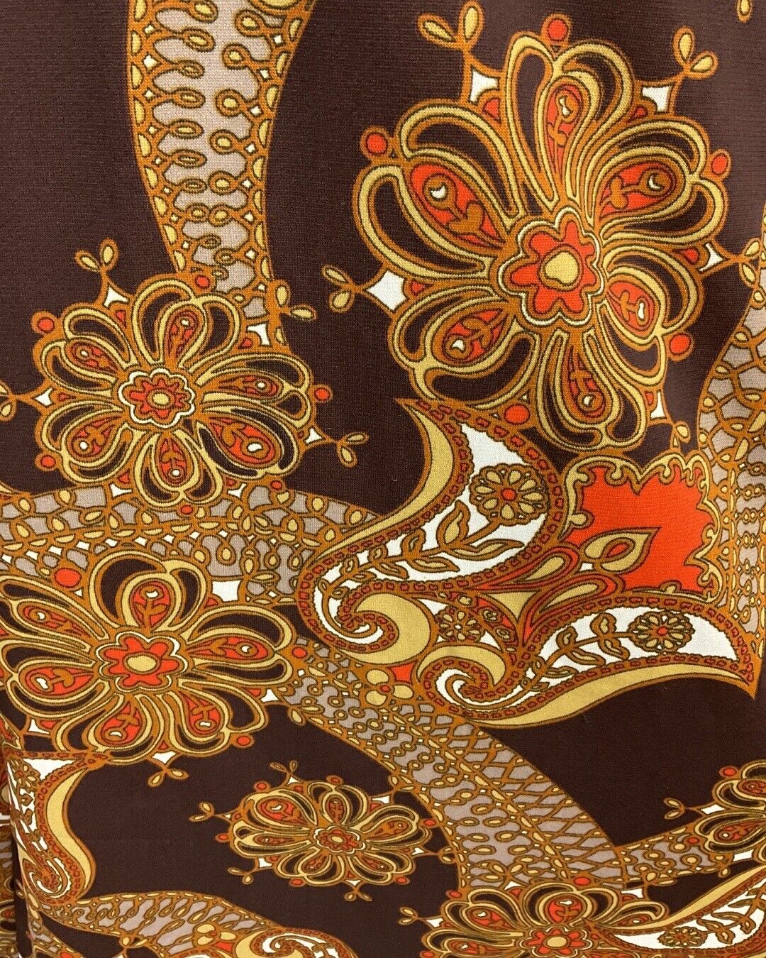 Covering the fabric is a busy psychedelic flower and swirl pattern in shades of brown, beige, orange, and red.
