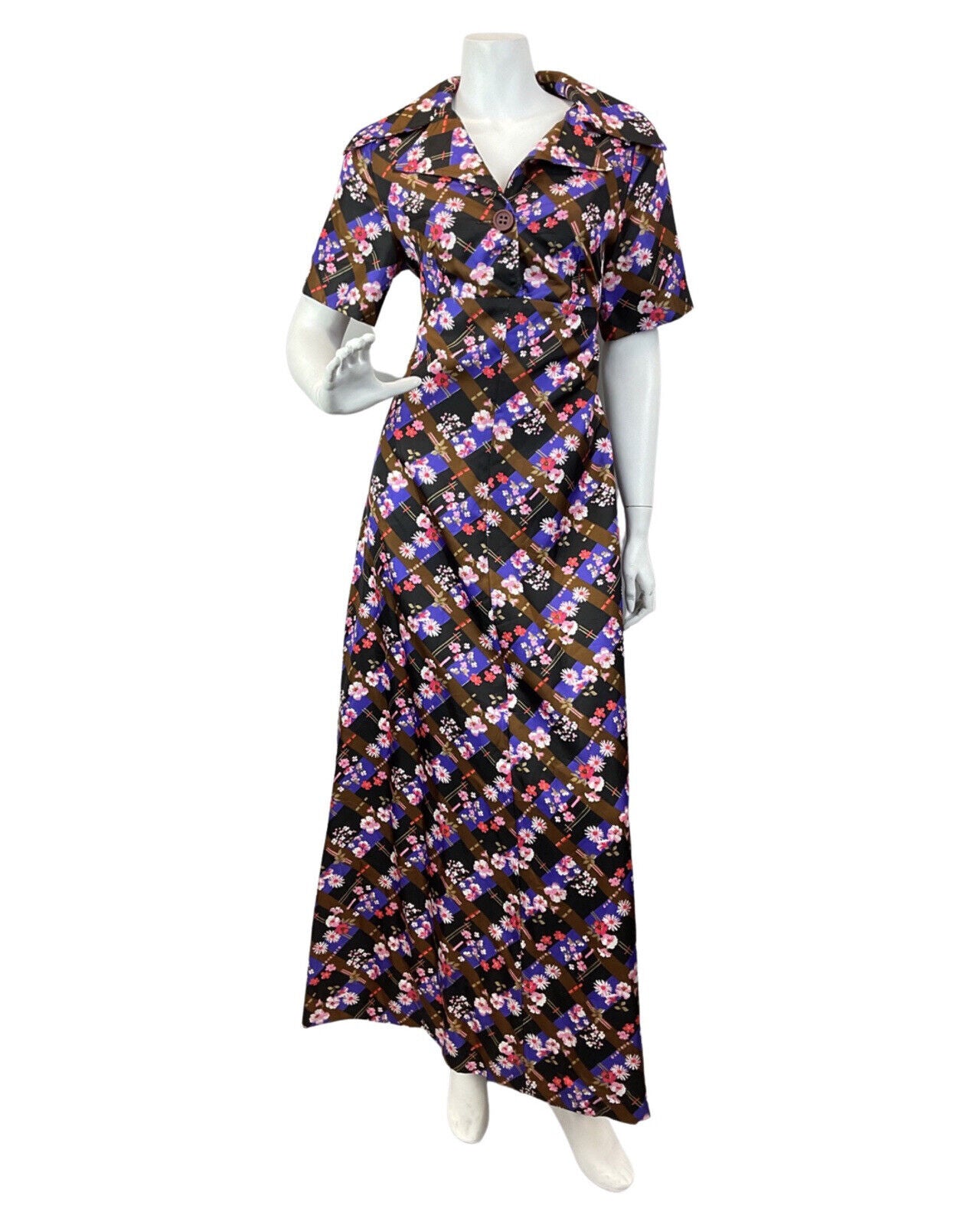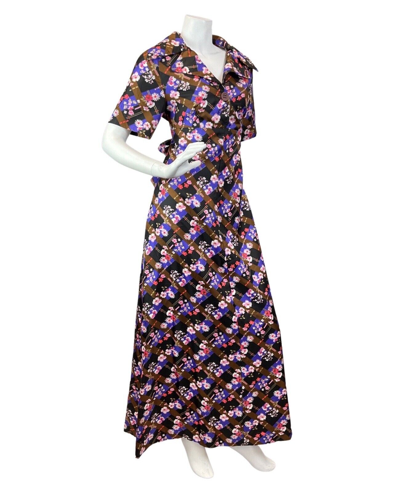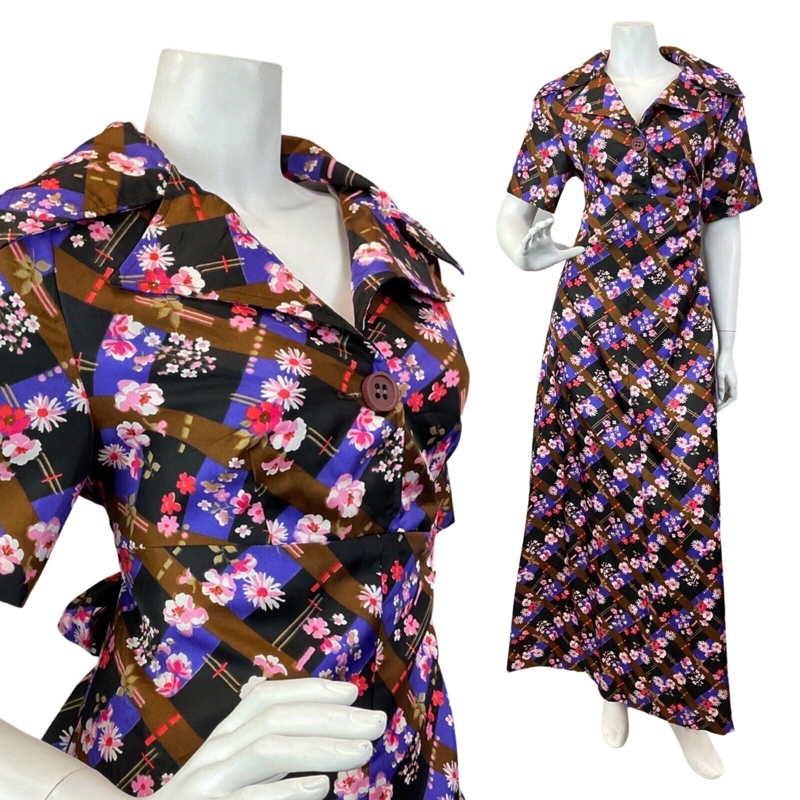VTG 60s 70s BROWN PURPLE BLACK CHECKED FLORAL DAISY DAGGER SHIRT MAXI DRESS 12