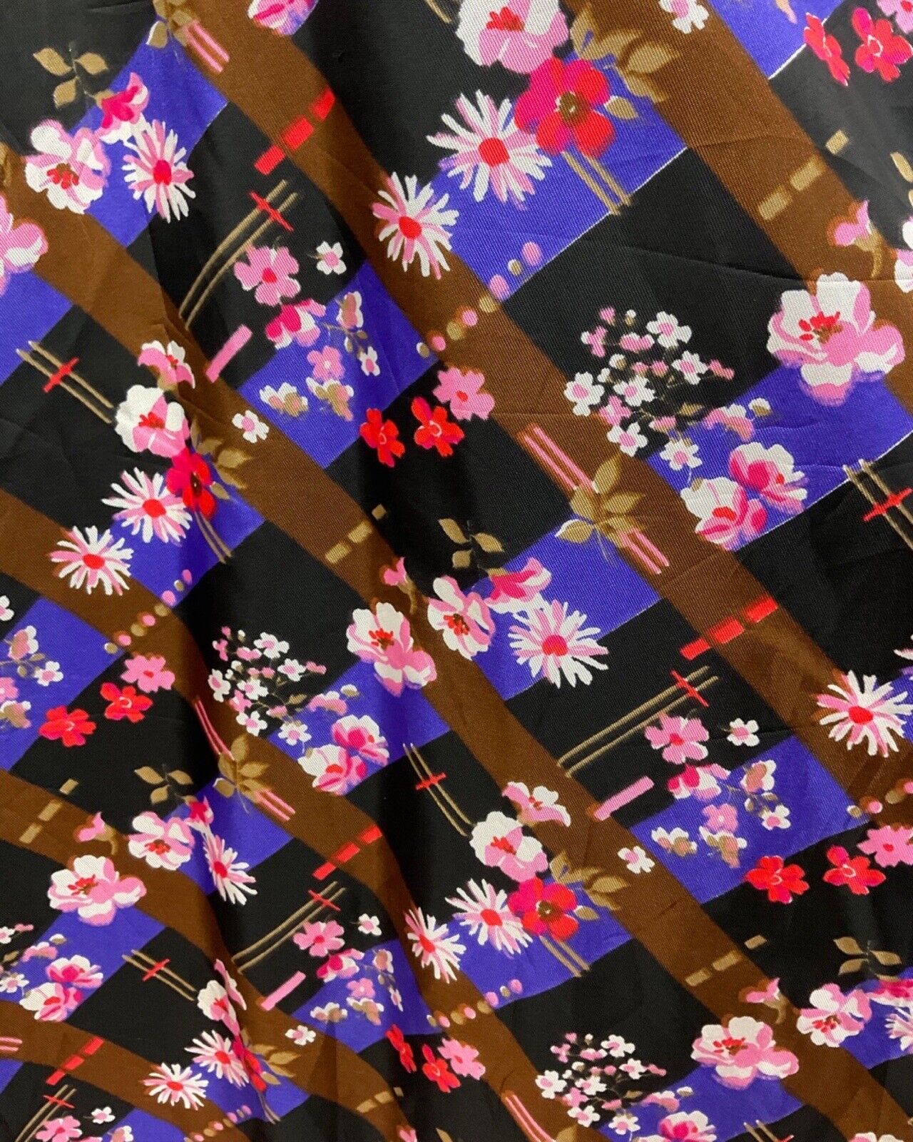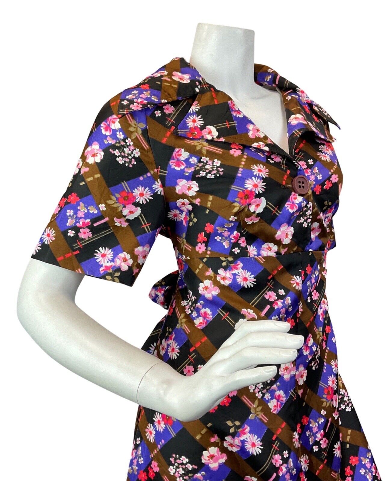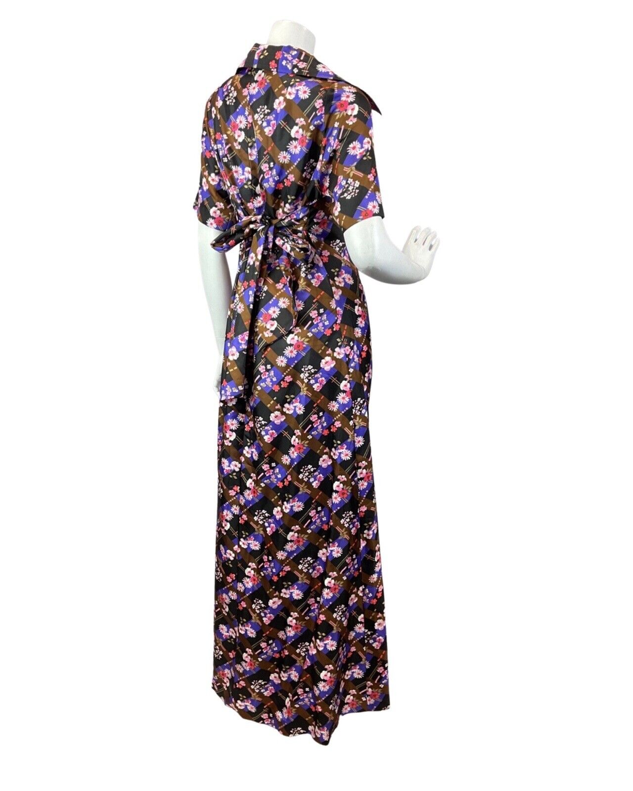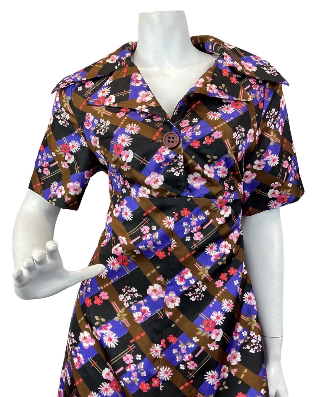 VTG 60s 70s BROWN PURPLE BLACK CHECKED FLORAL DAISY DAGGER SHIRT MAXI DRESS 12