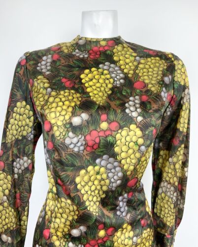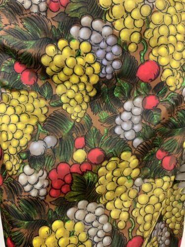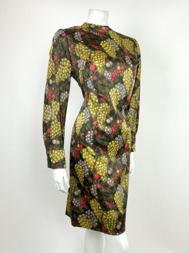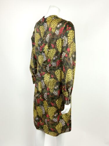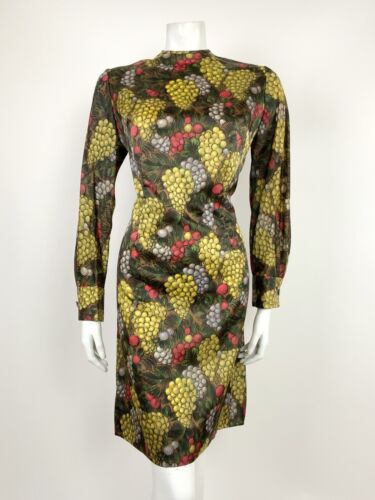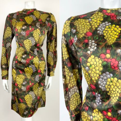 VTG 60s 70s BROWN RED YELLOW GREEN GRAPES BERRIES FLORAL SHIFT DRESS 10 12 14