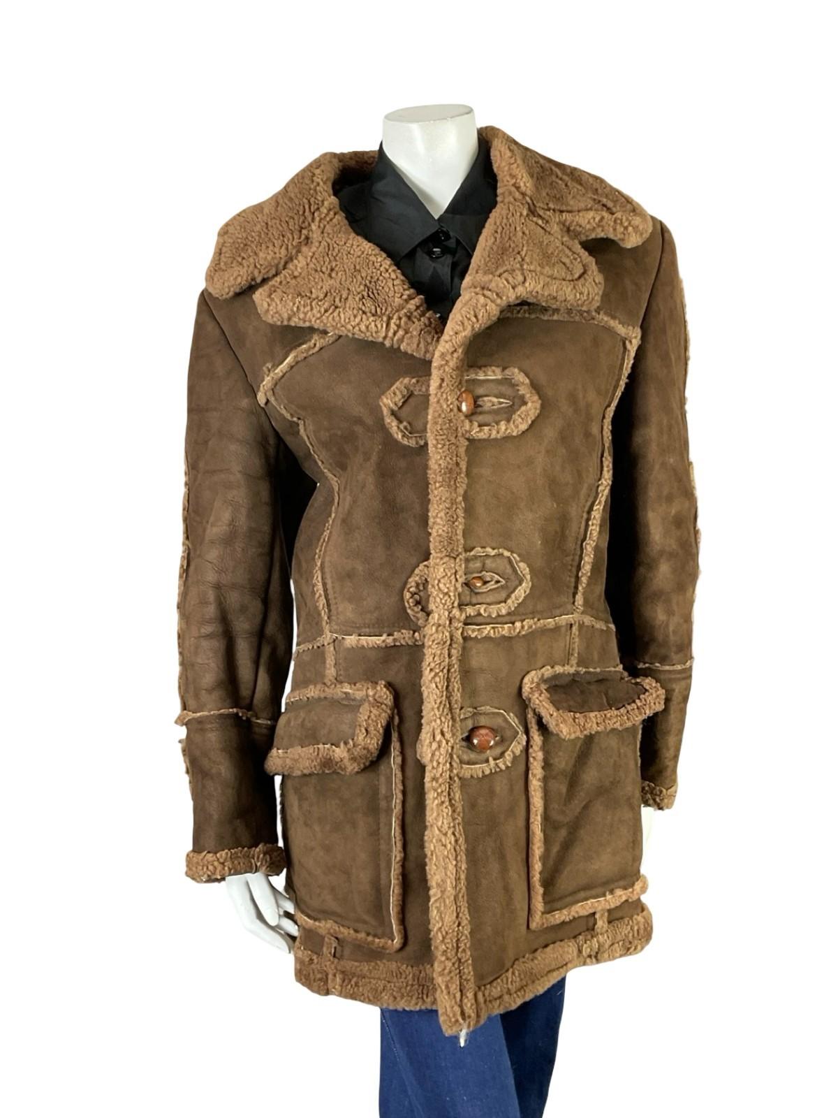 This is a lovely 60s 70s brown suede shearling coat with contrasting fluffy seams and flap pockets with a depth of 7" each. This coat has a contrast rounded notch lapel collar, and buttons down the front via 3 woven tan brown leather buttons. This is a wonderfully luxurious coat to touch, and is perfect for staying warm with a classic bohemian style.