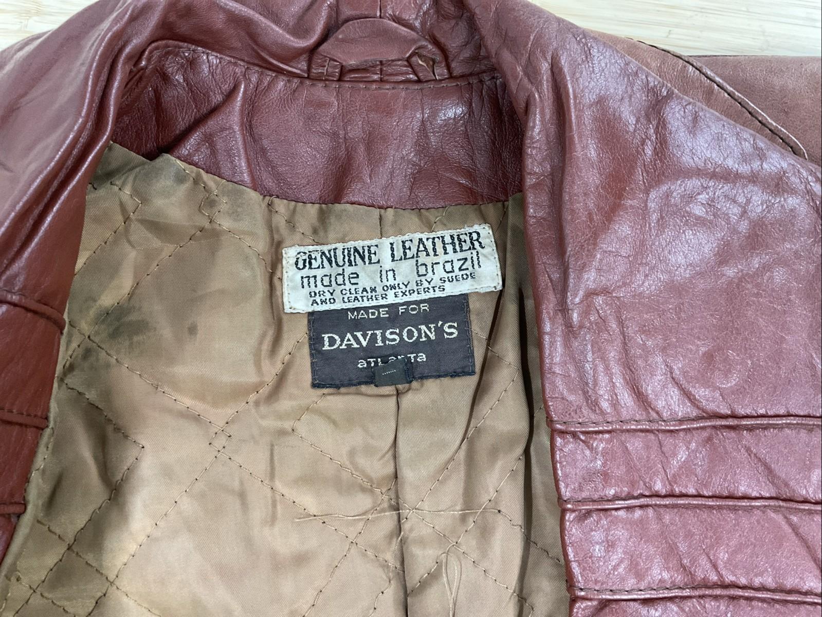 This is a lovely burgundy red leather jacket with a pleated diamond web like collar, long sleeves and two slanted pockets at the hips. This jacket has a built in tie to cinch the waist, and buttons down the front via 3 brown marbled buttons. The lining of this jacket is made from a shiny brown synthetic fabric, which has been quilted for extra warmth during wear. There is some marking near the waist of the jacket, however this is hidden with the tie during wear. This is a great choice for anyone looking for figure hugging outerwear. This jacket was made in Brazil for Davidson’s Atlanta, which was the predecessor to Macy’s department store.