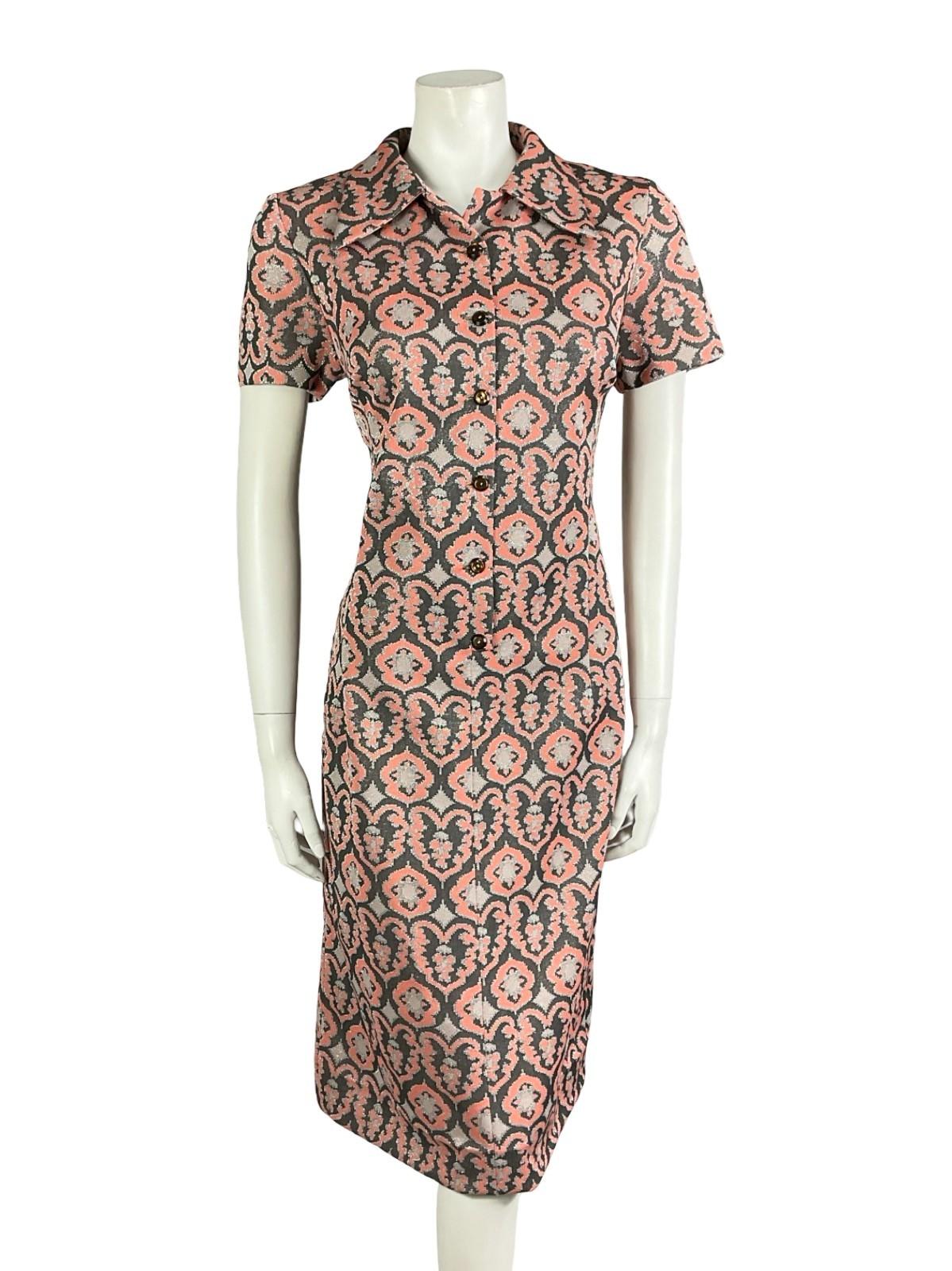VTG 60S 70S CORAL GREY SILVER LUREX GLITTERY ORNATE DAGGER PARTY SHIRT DRESS 8