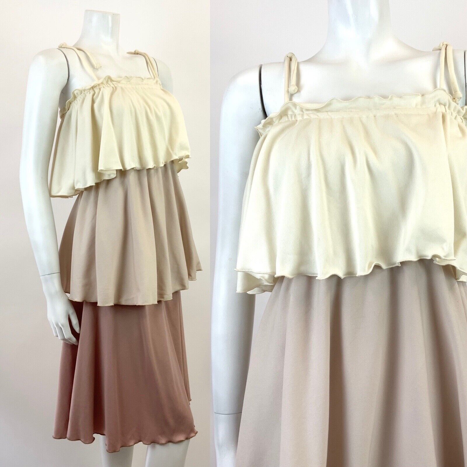 VTG 60s 70s CREAM BEIGE BROWN TIERED FLAPPER STUDIO 54 STRAPPY SUN-DRESS 8 10