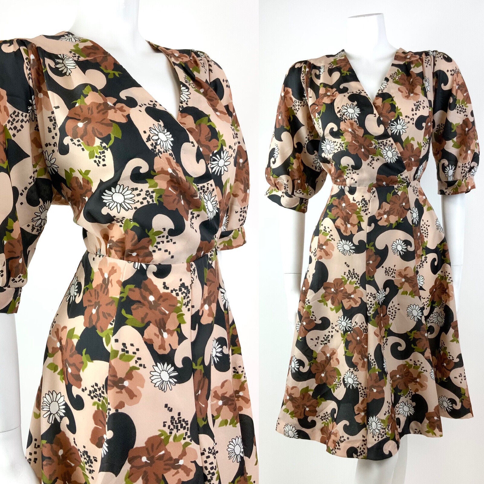 VTG 60s 70s CREAM BLACK BROWN GREEN PSYCHEDELIC FLORAL BLOUSON SWING DRESS 12