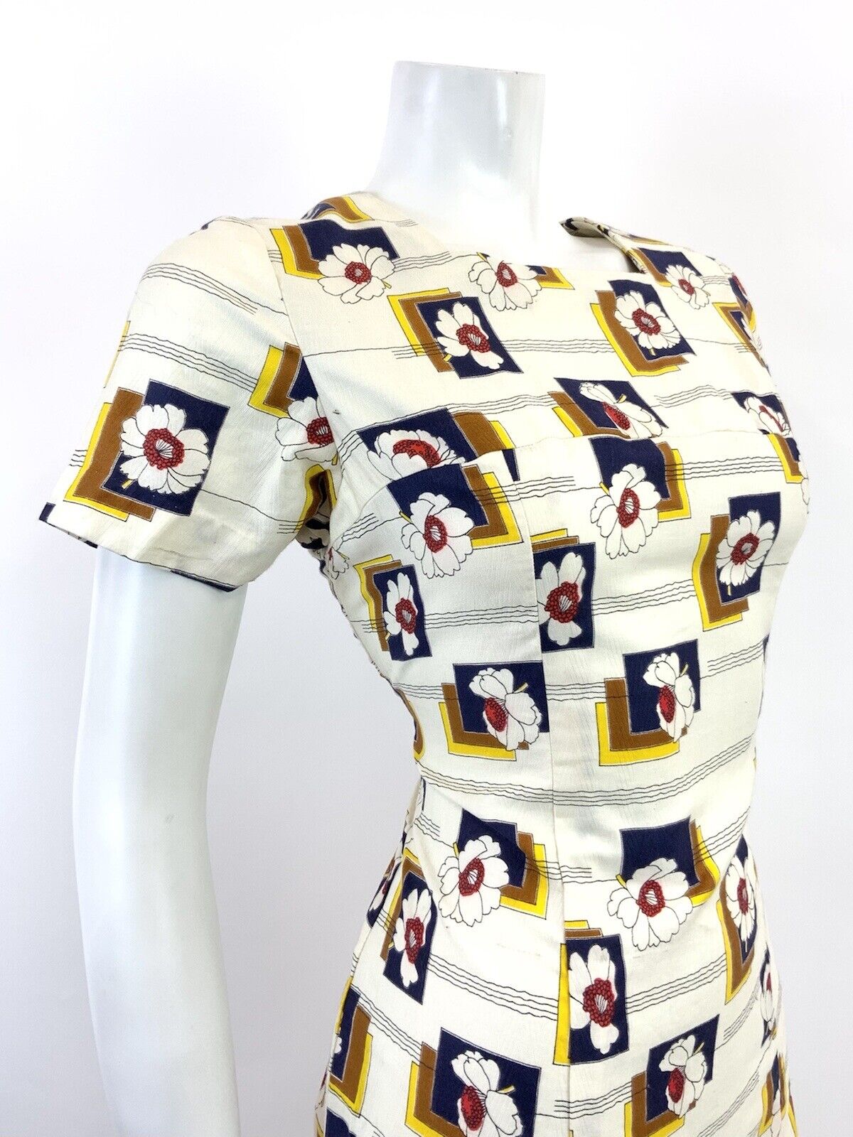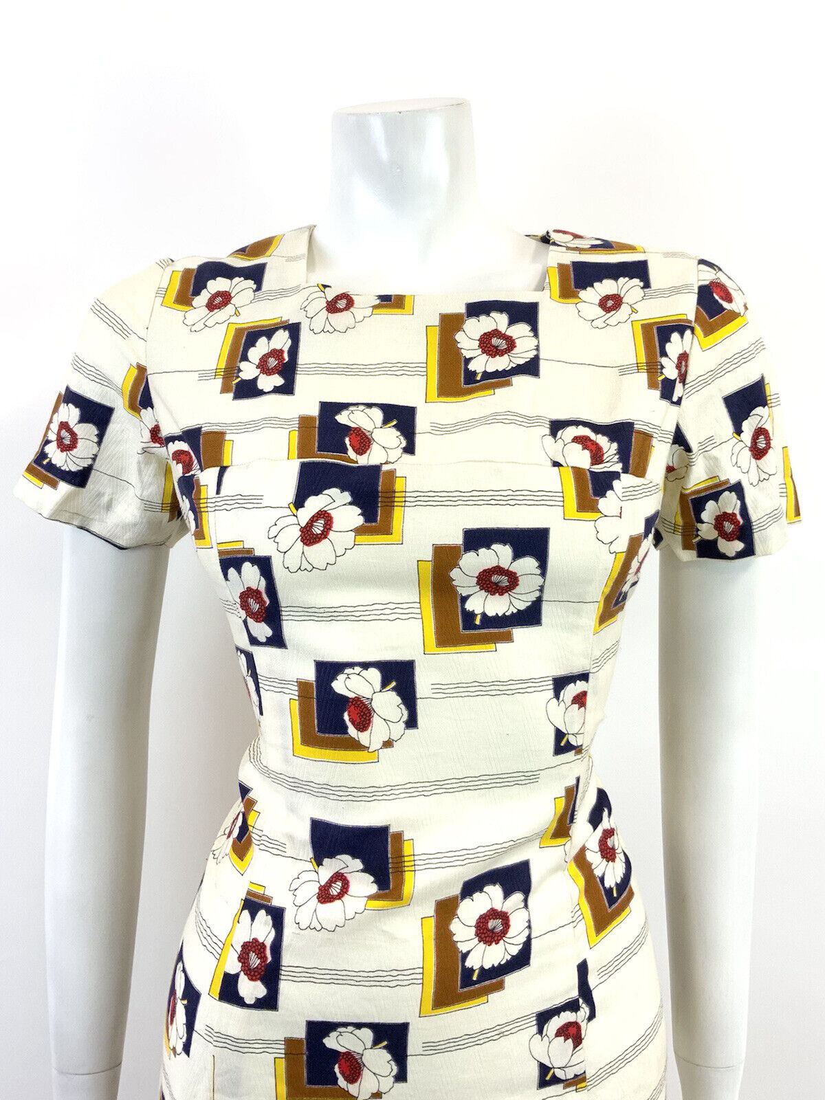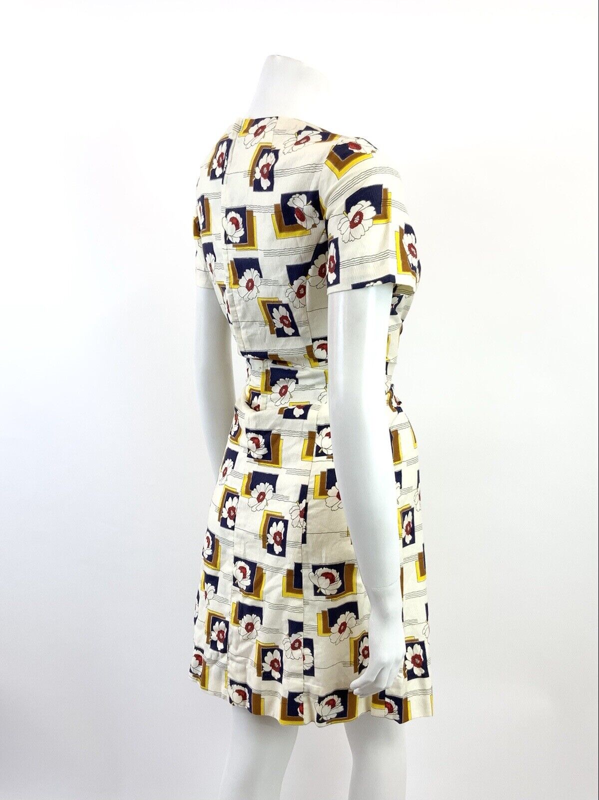 VTG 60s 70s CREAM BLUE RED YELLOW STRIPED GEOMETRIC FLORAL MOD MINI DRESS 10 12