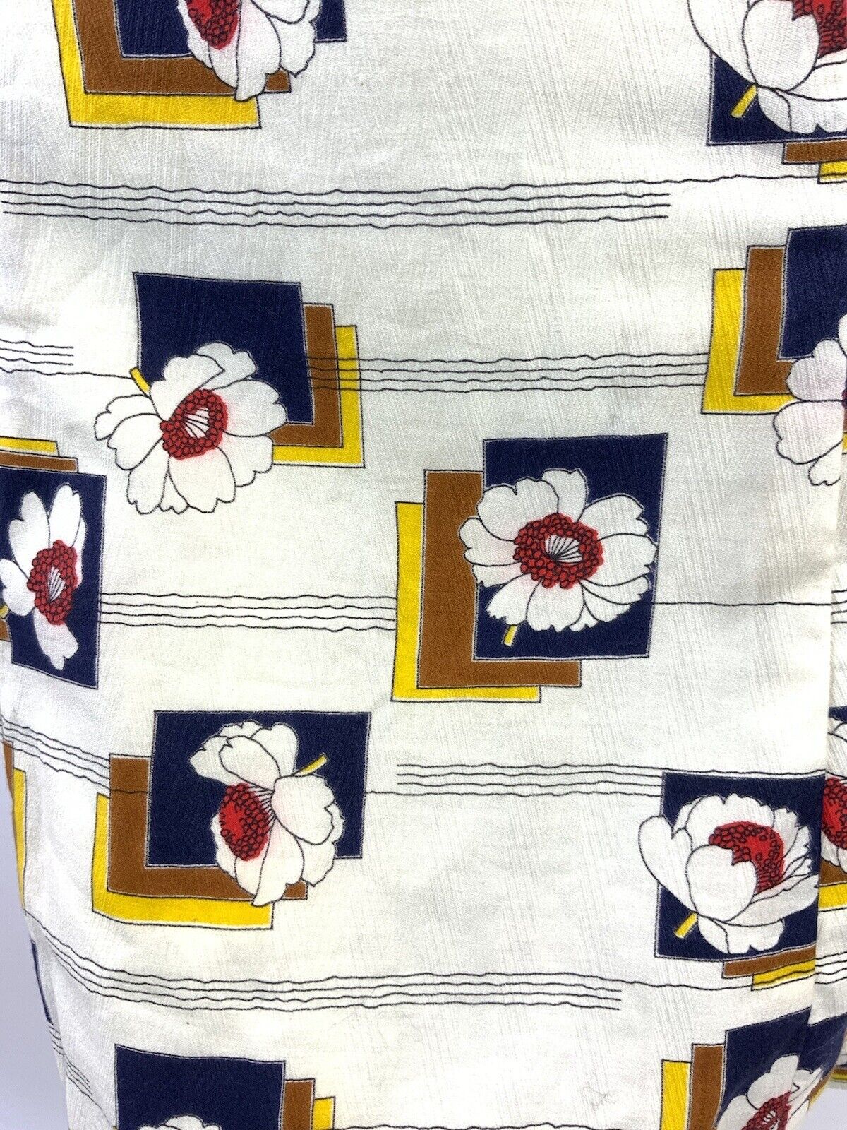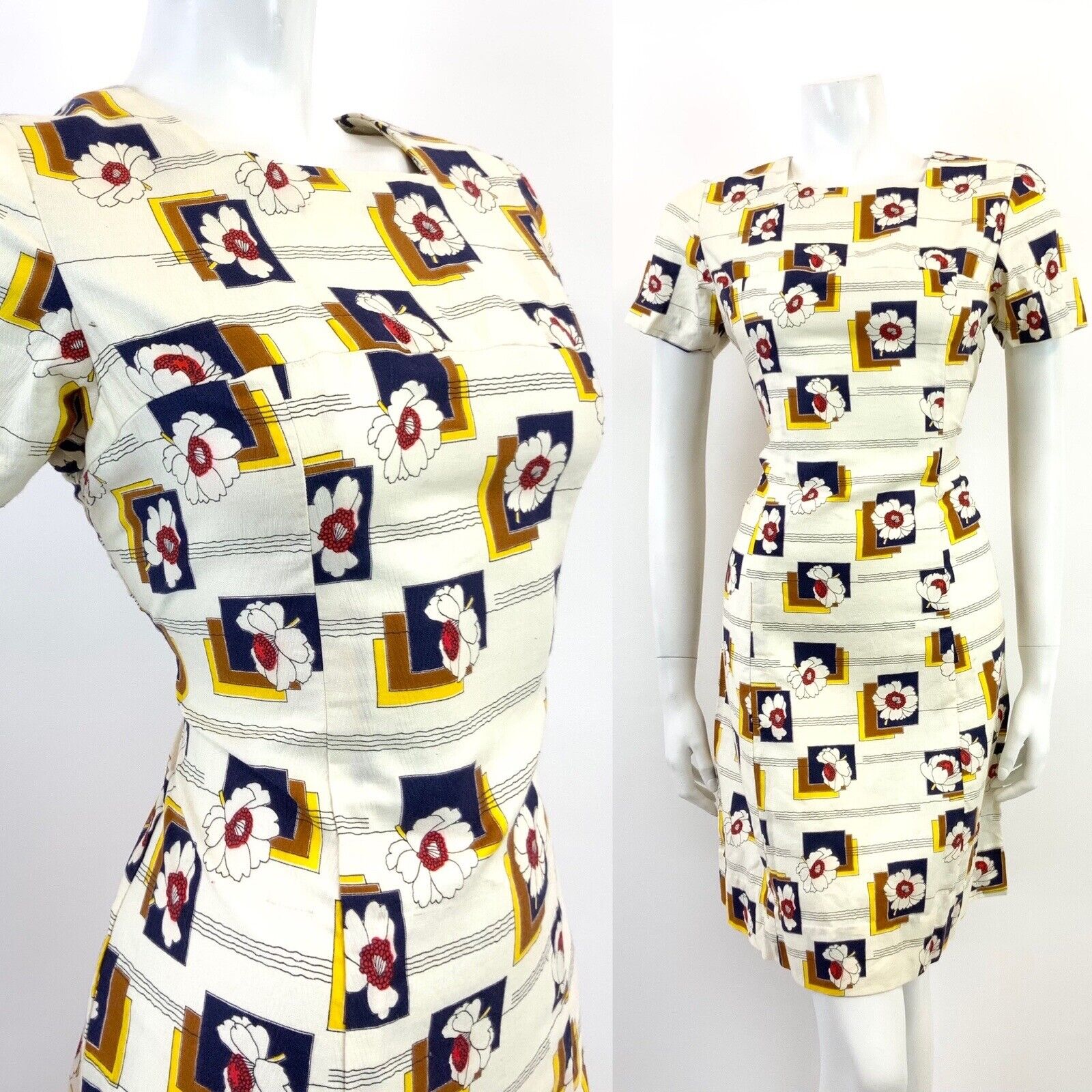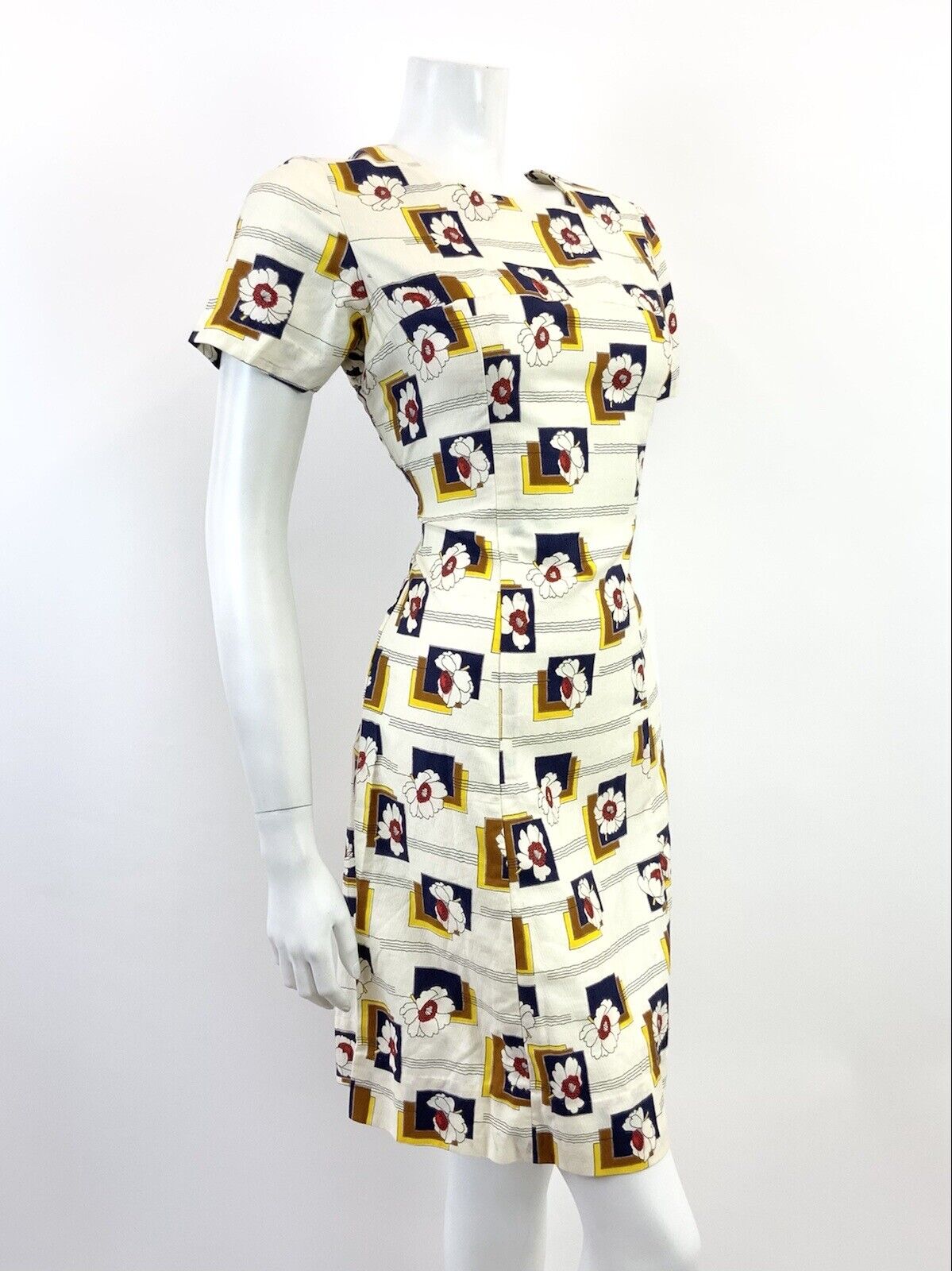 VTG 60s 70s CREAM BLUE RED YELLOW STRIPED GEOMETRIC FLORAL MOD MINI DRESS 10 12
