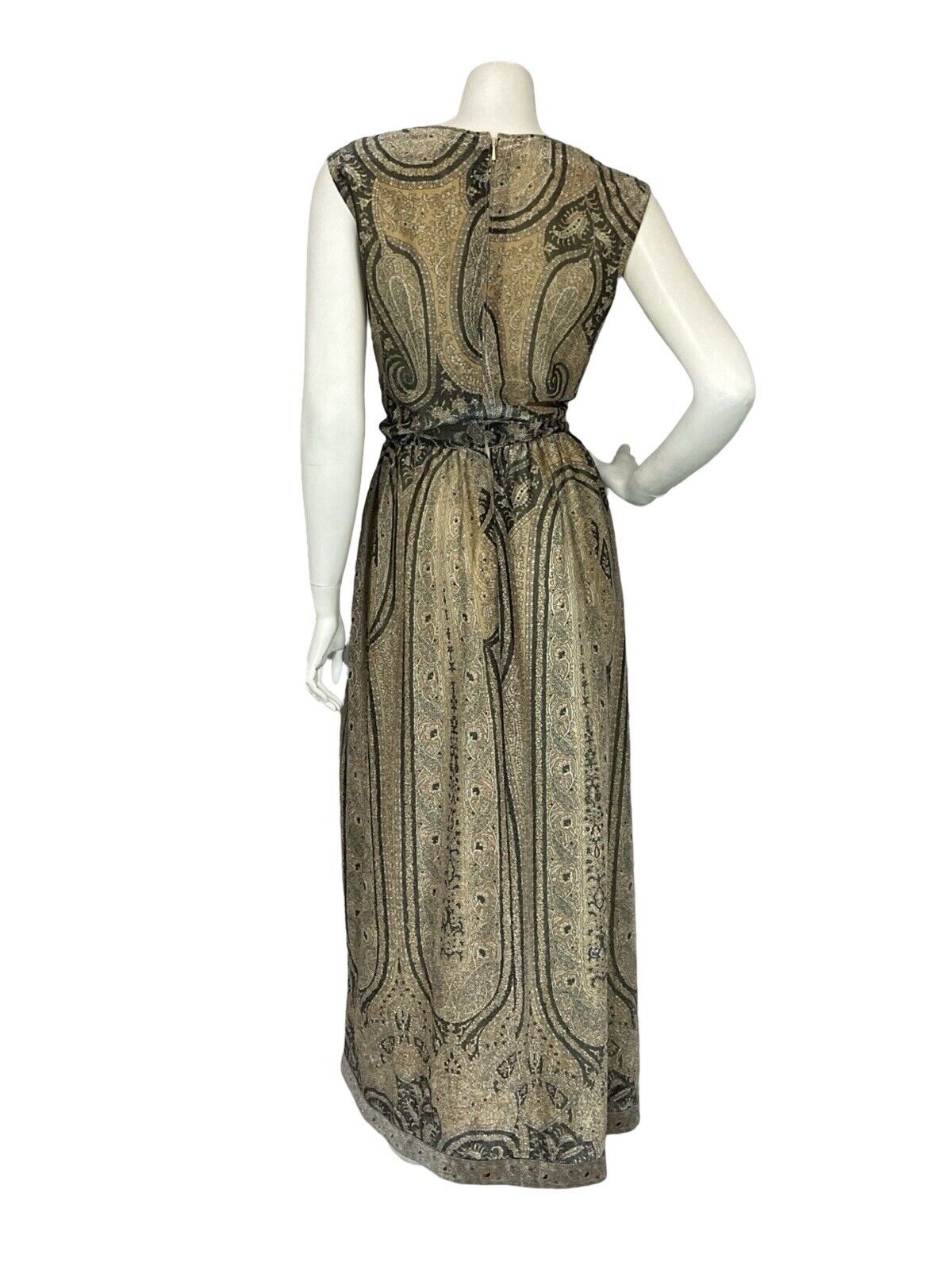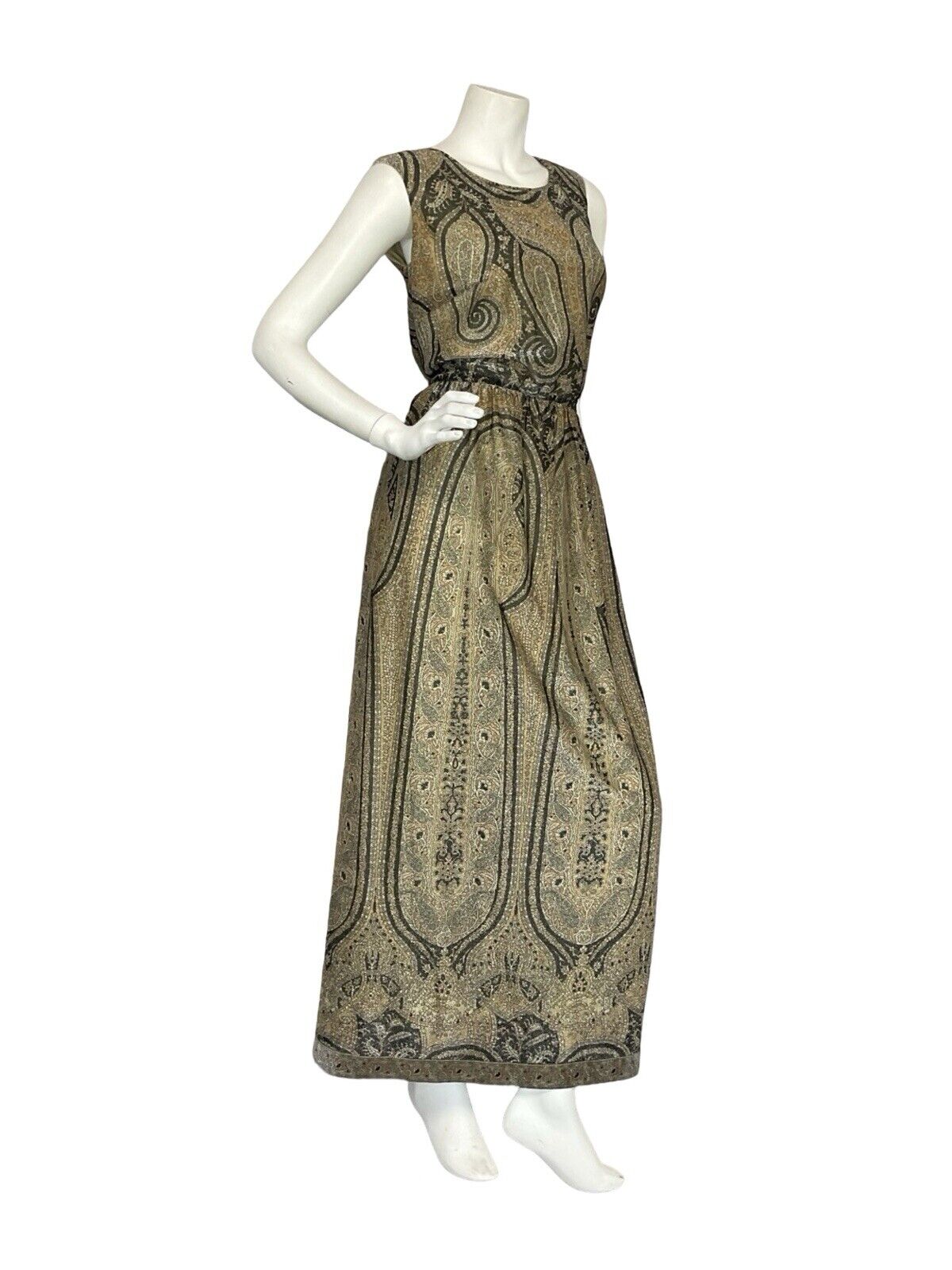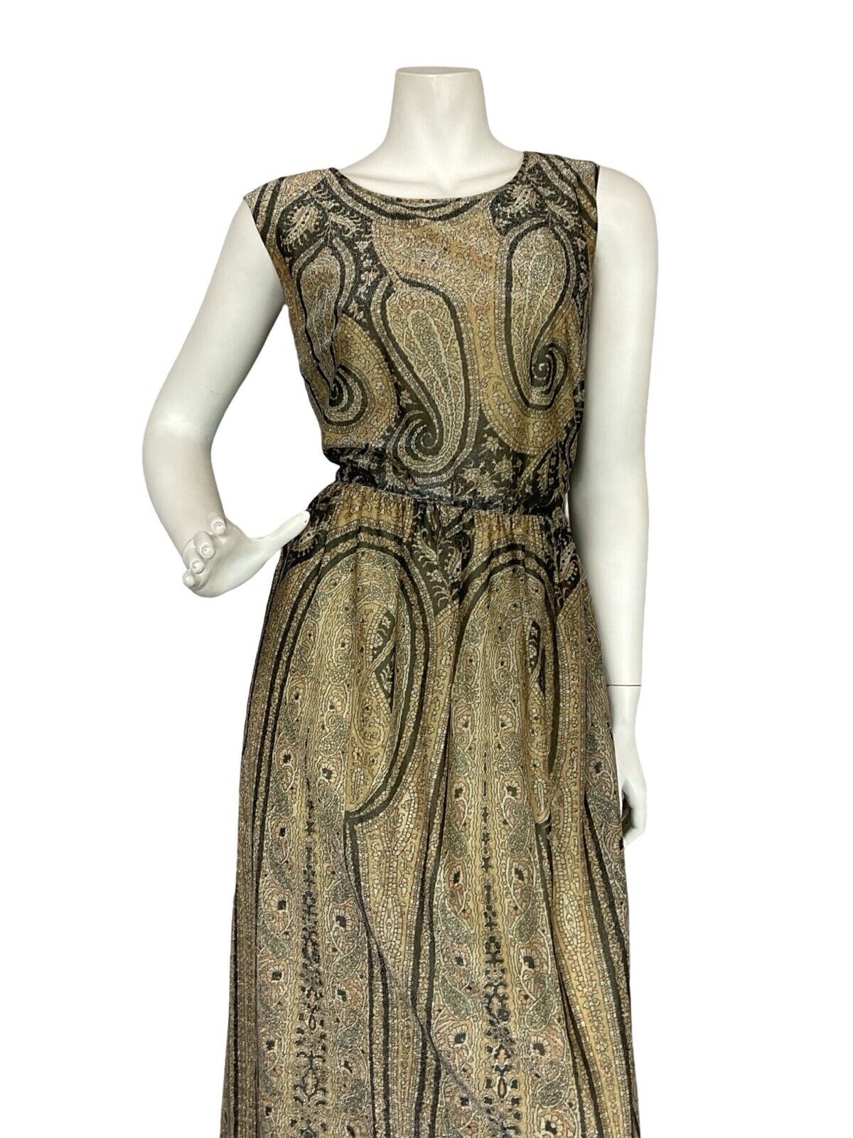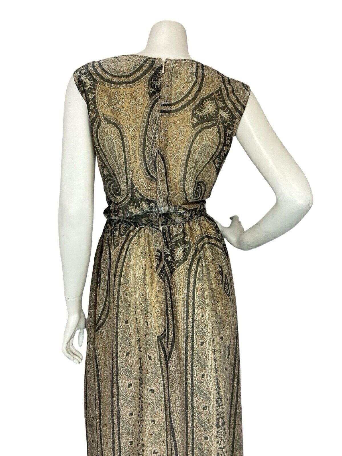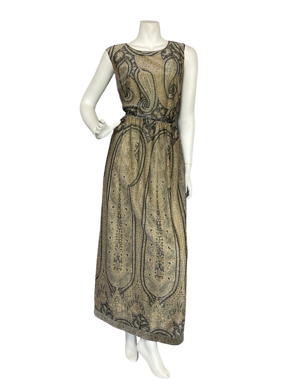 VTG 60S 70S CREAM GOLD BLACK PAISLEY BOHO HIPPY EVENING PARTY MAXI DRESS 12