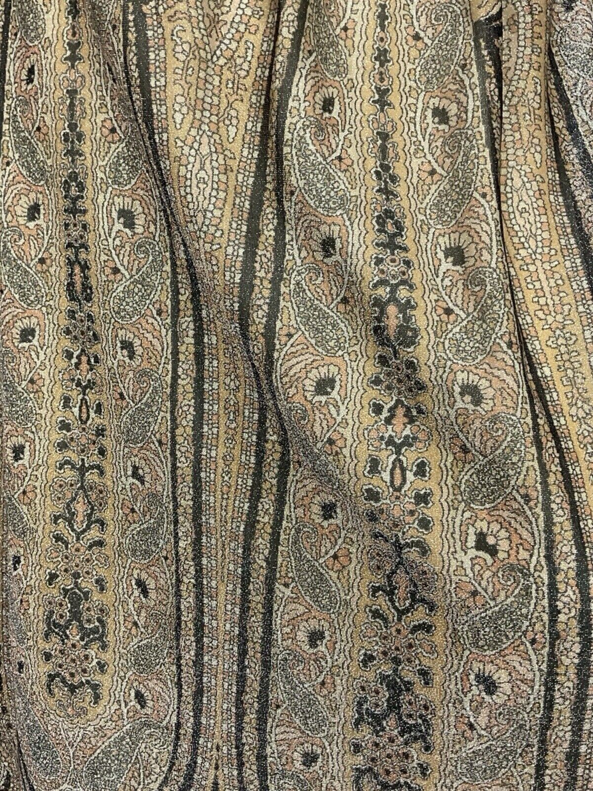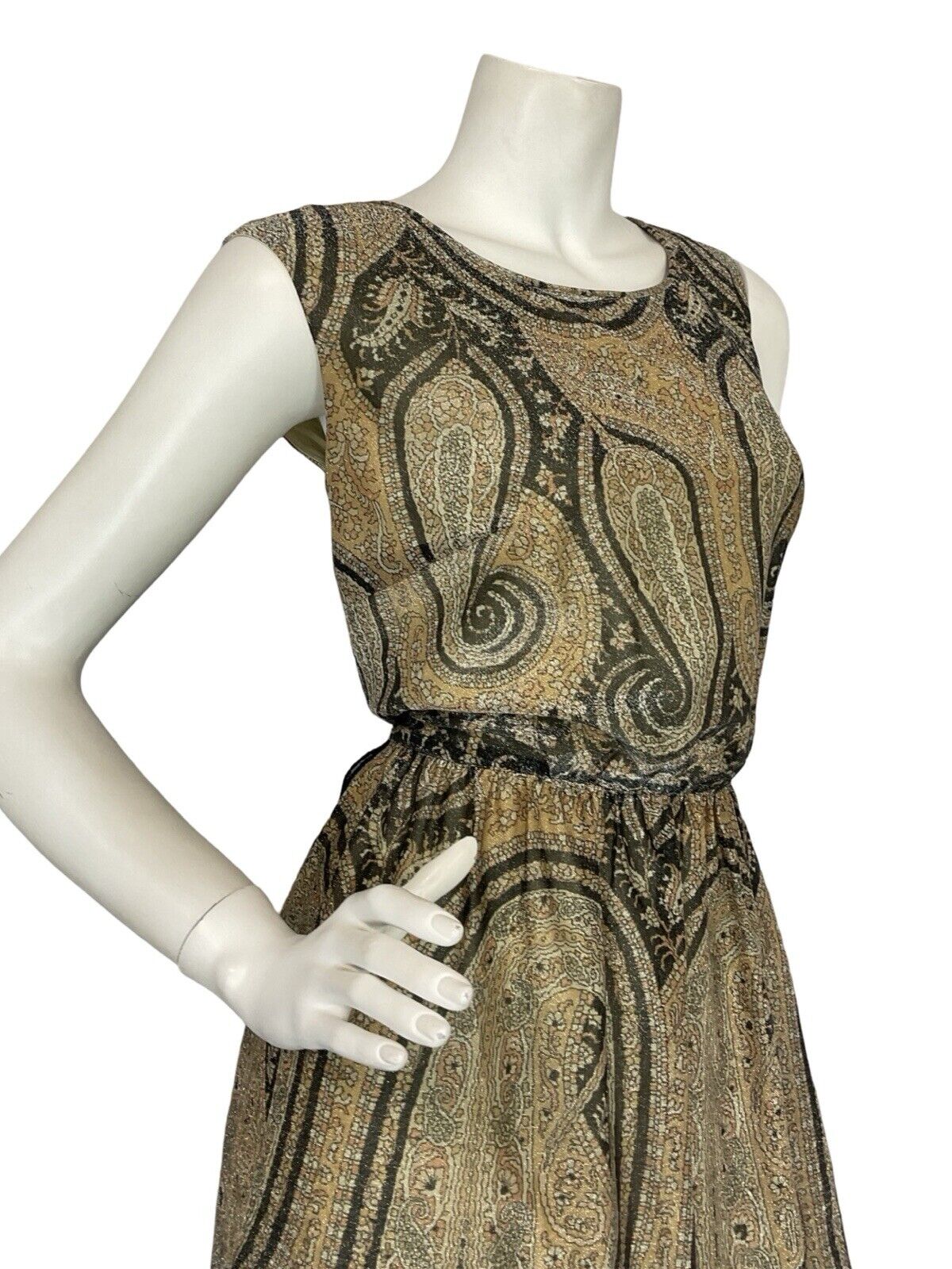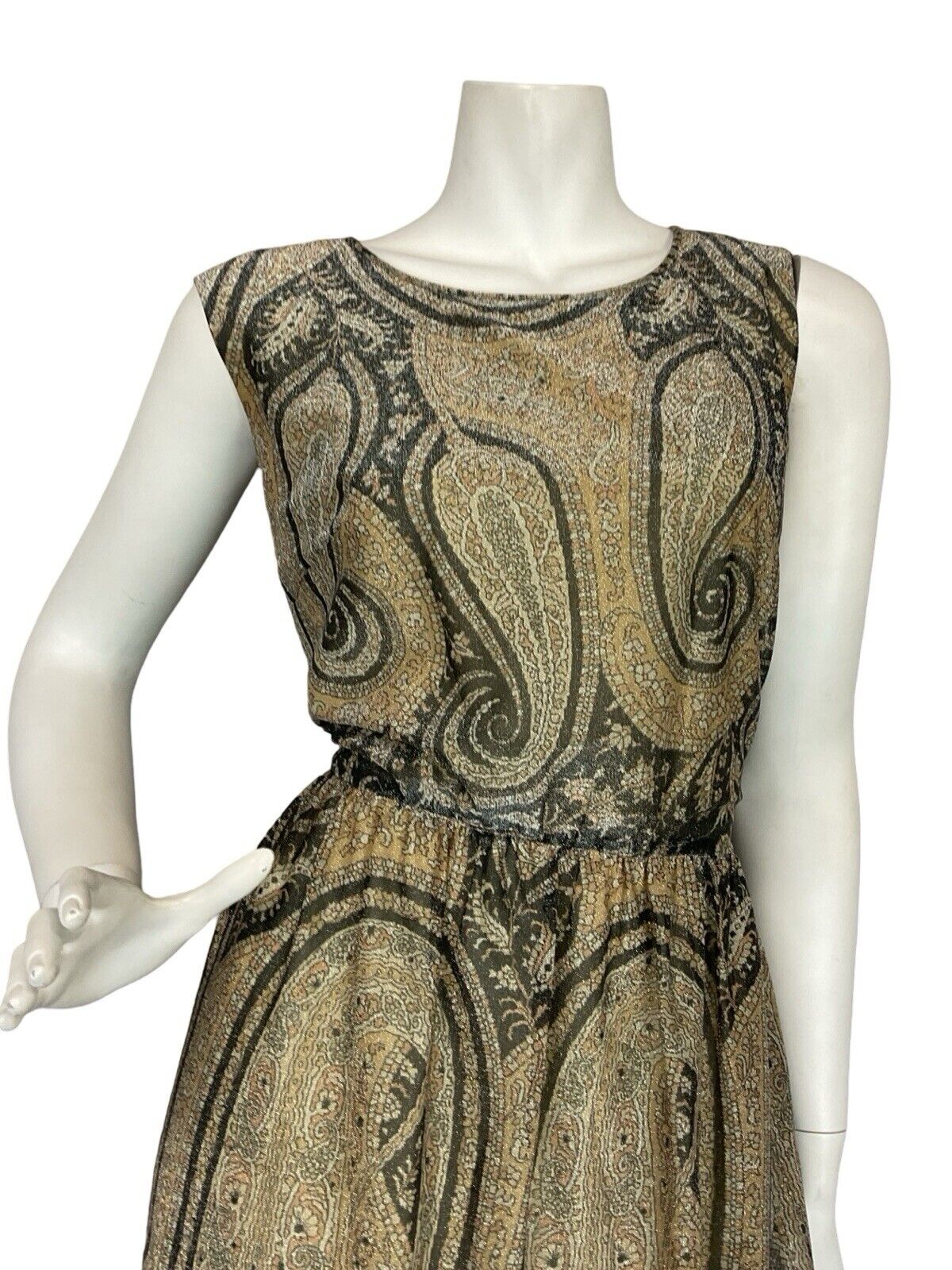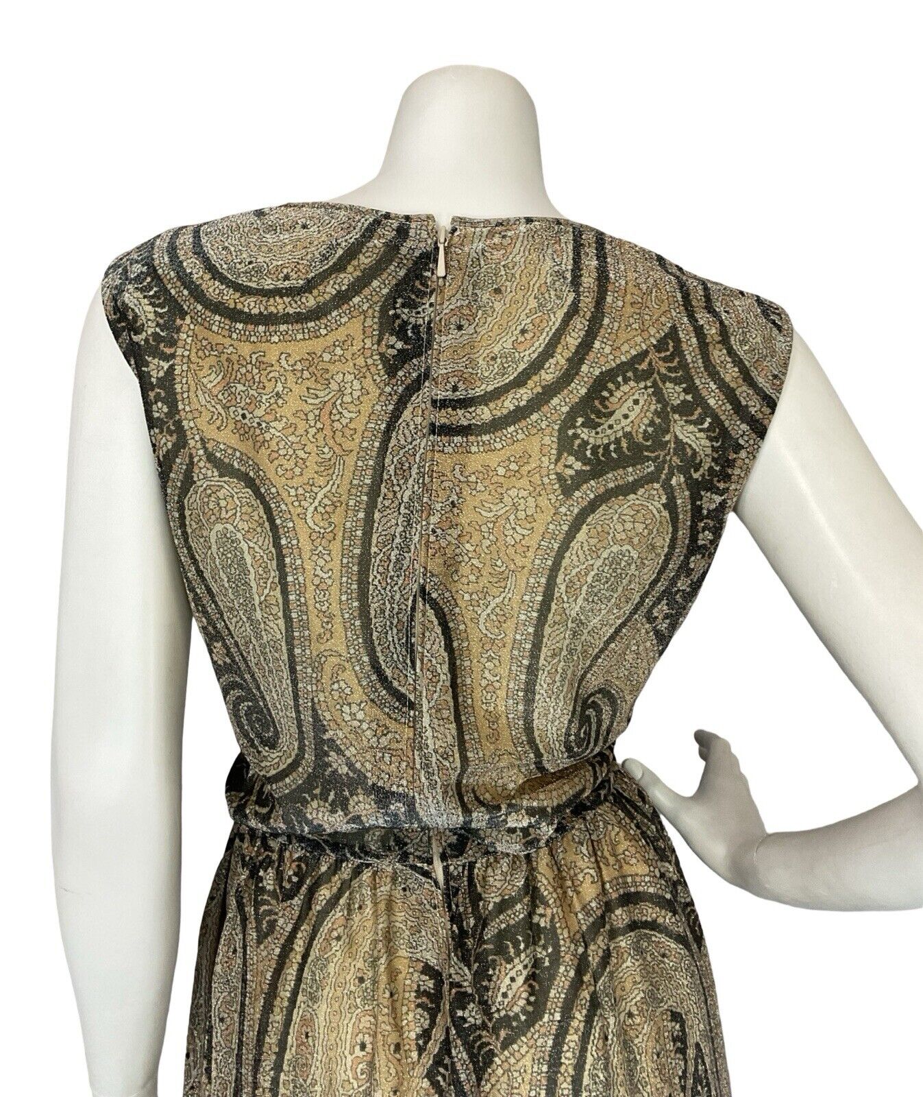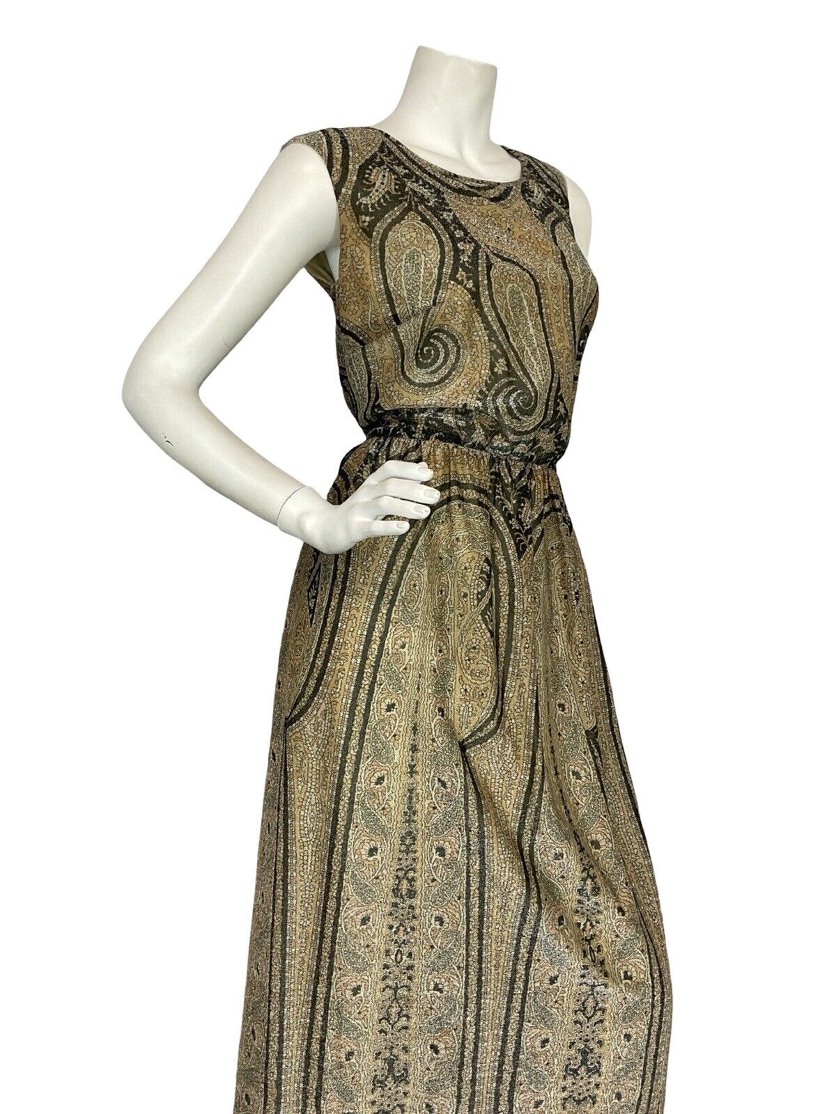 VTG 60S 70S CREAM GOLD BLACK PAISLEY BOHO HIPPY EVENING PARTY MAXI DRESS 12