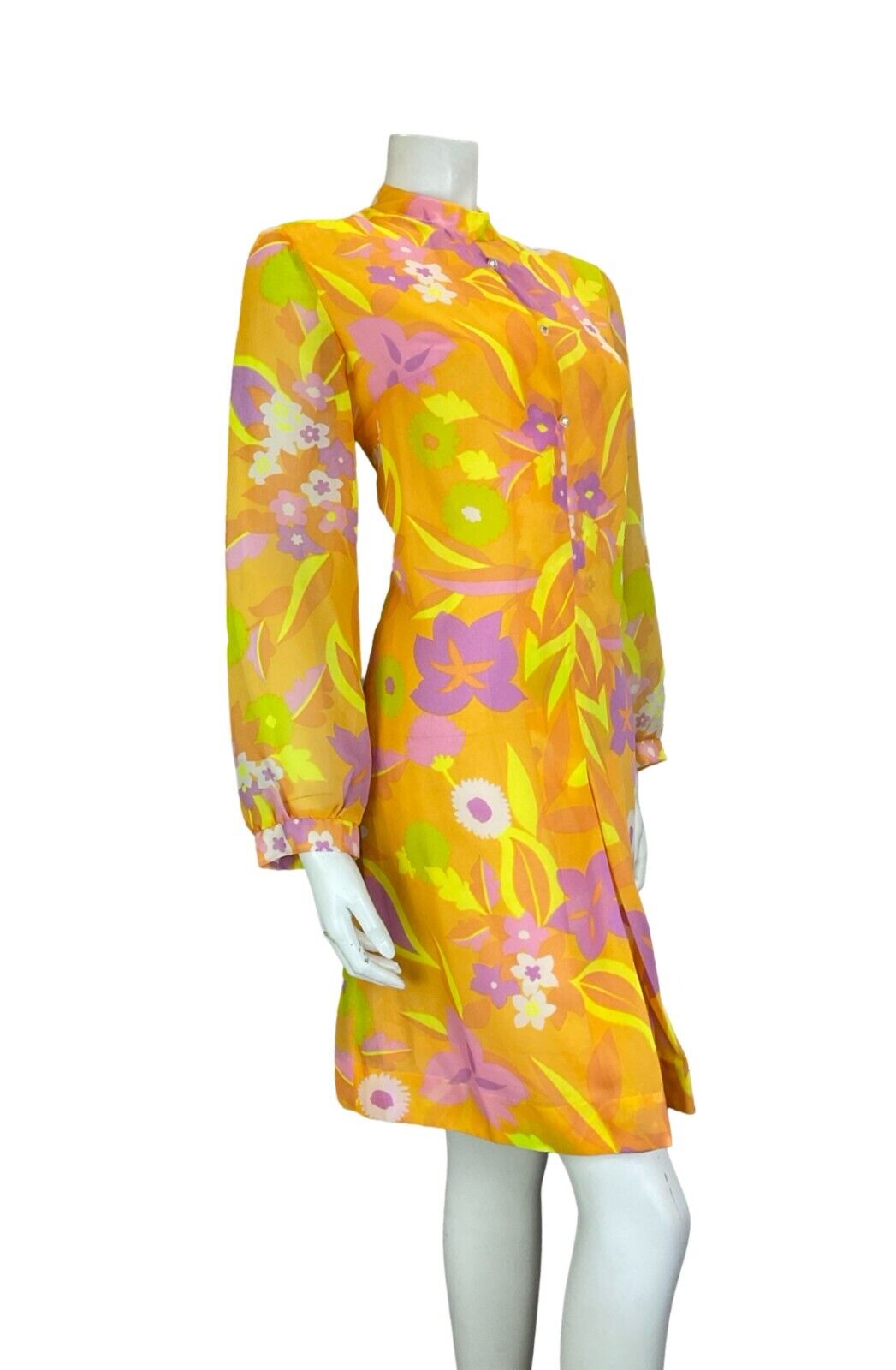 VTG 60S 70S FLORAL PSYCHEDELIC MANDARIN COLLAR ORANGE PINK YELLOW SHIFT DRESS 14