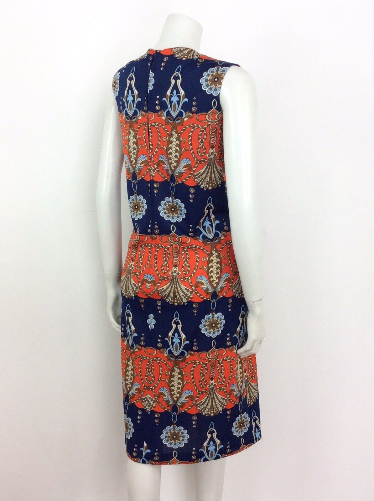 VTG 60s 70s FLORAL ROPE NAUTICAL NAVY BLUE ORANGE RED BROWN SHIFT DRESS 14 16