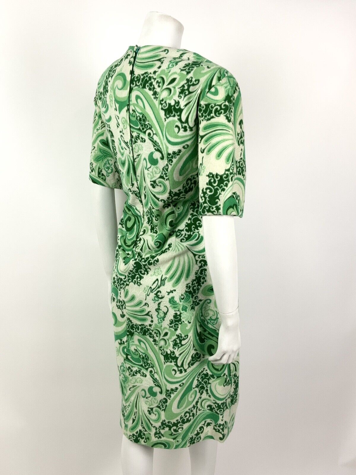 VTG 60s 70s FOREST GREEN CREAM SWIRL PSYCHEDELIC SCROLL SHIFT DRESS 14 16