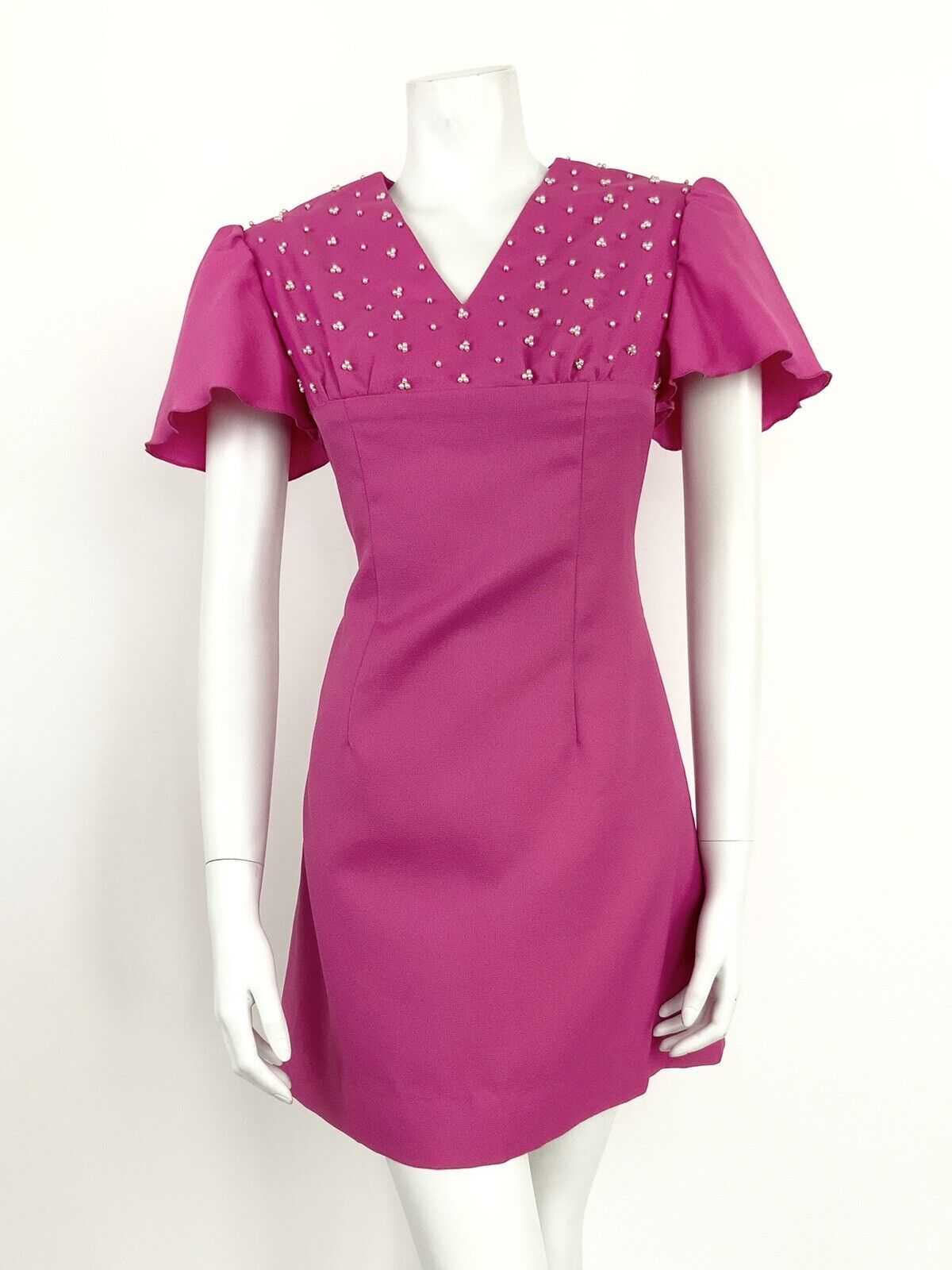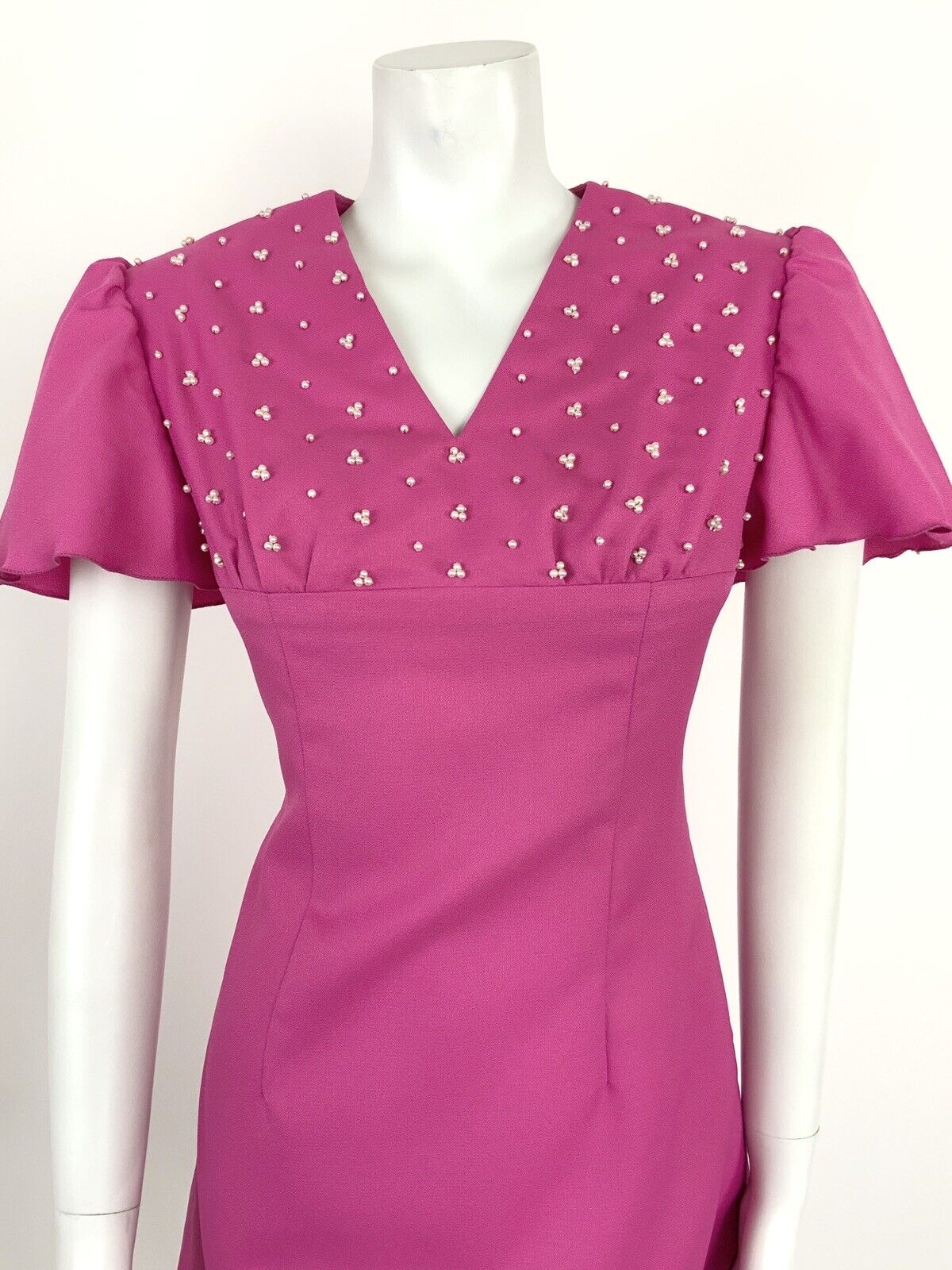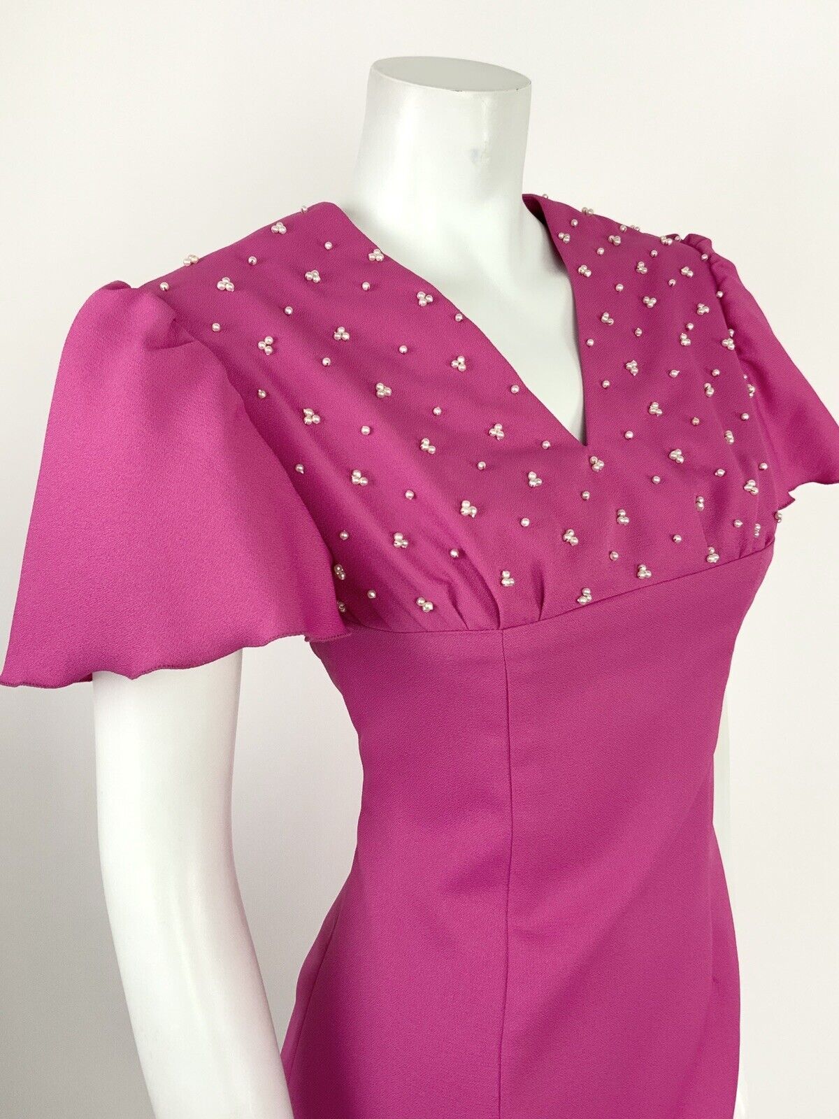 VTG 60s 70s FUCHSIA PINK EMPIRE LINE PEARL EMBELLISHMENT FLUTTER SLEEVE DRESS 8