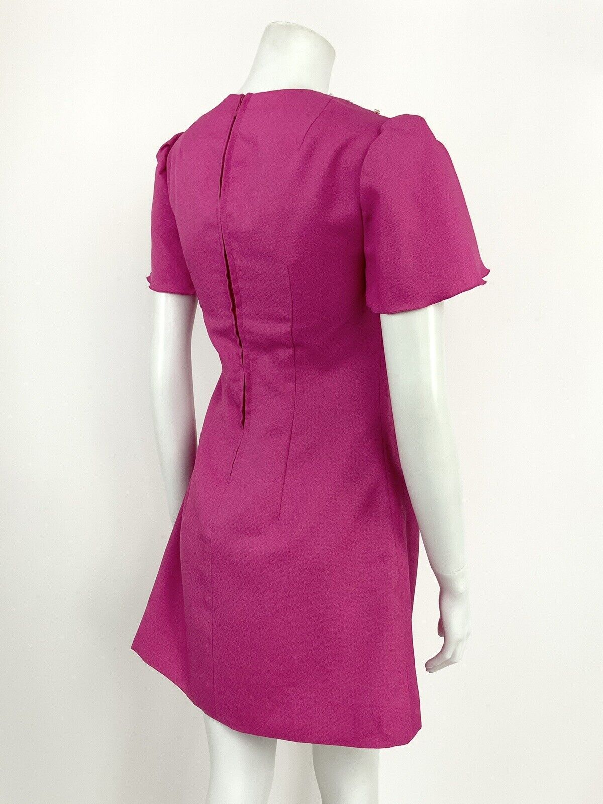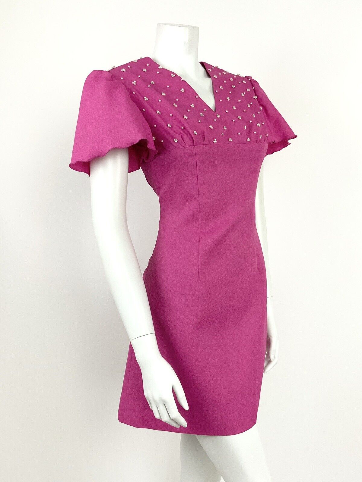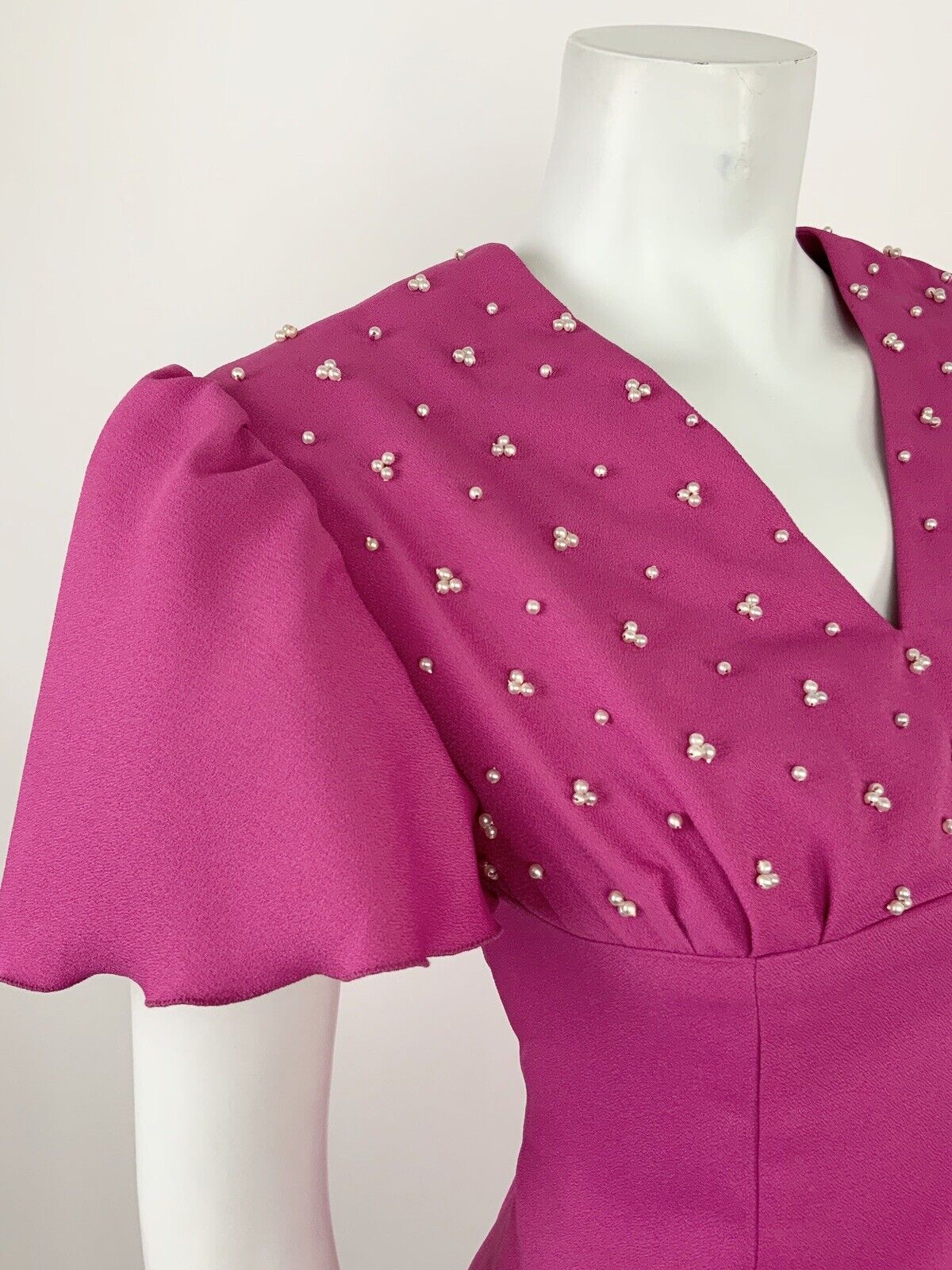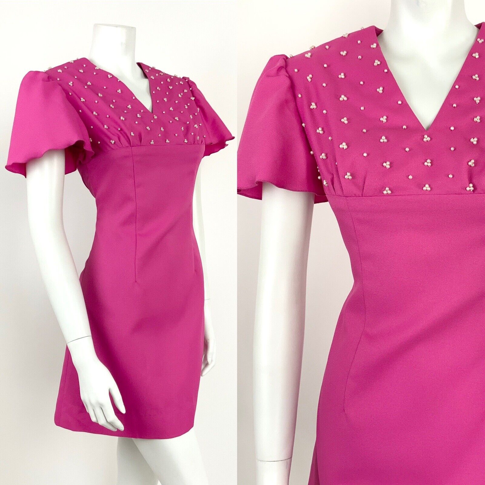 VTG 60s 70s FUCHSIA PINK EMPIRE LINE PEARL EMBELLISHMENT FLUTTER SLEEVE DRESS 8