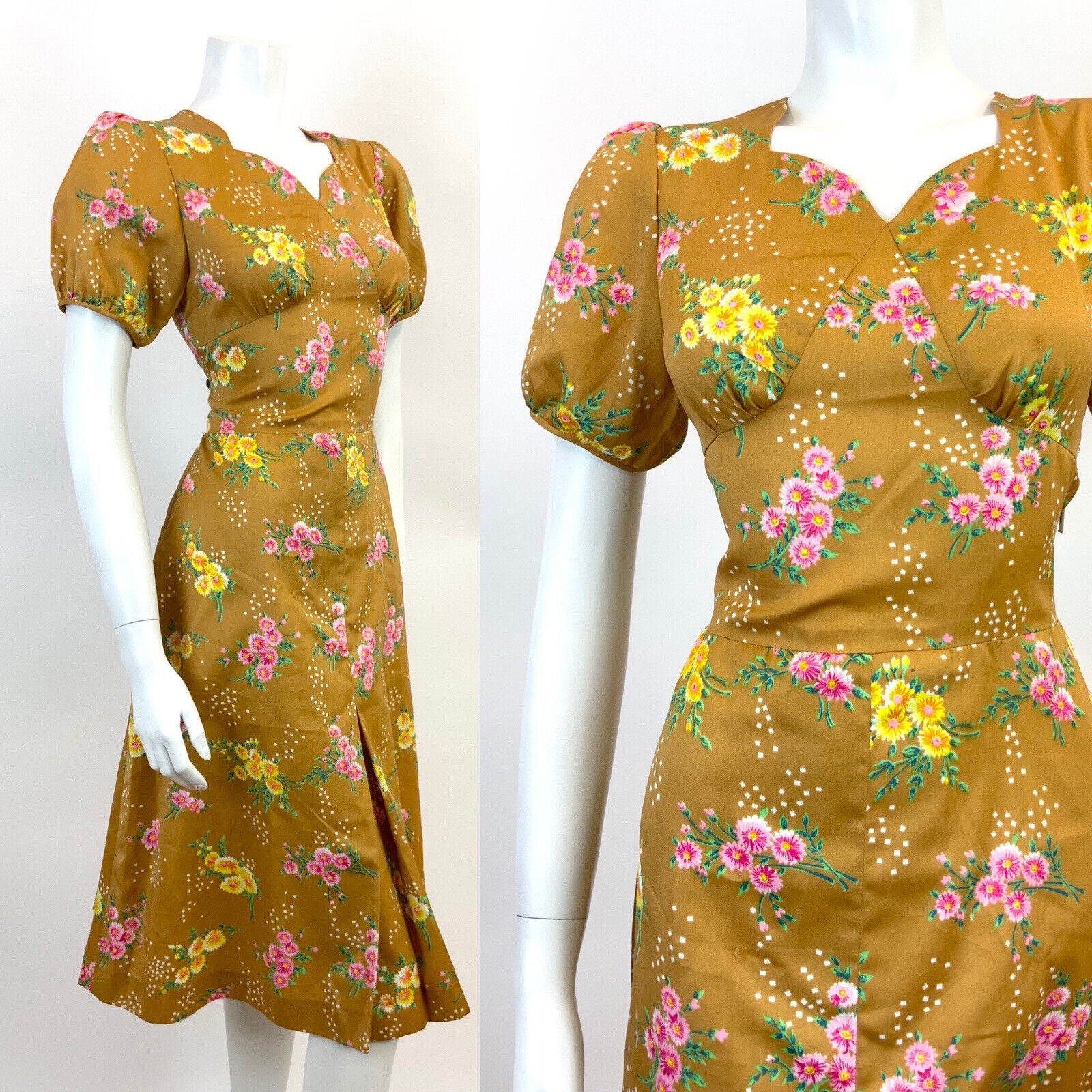 VTG 60s 70s GOLDEN BROWN TAN GREEN PINK FLORAL DOTTY PUFF SLEEVE TEA DRESS 10