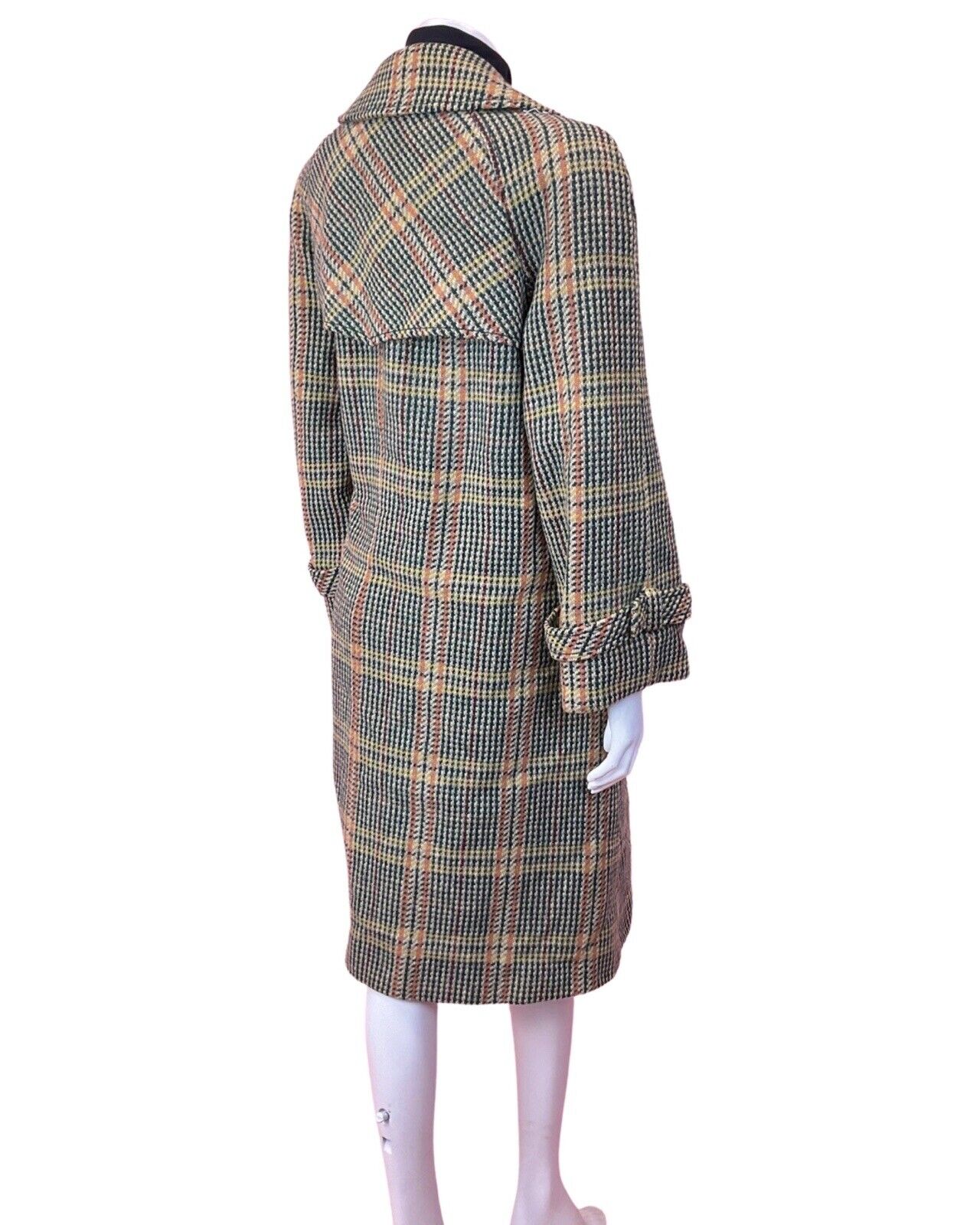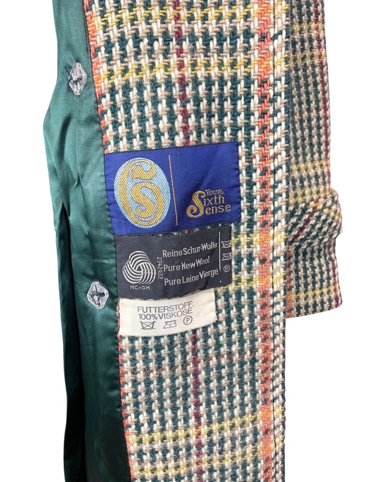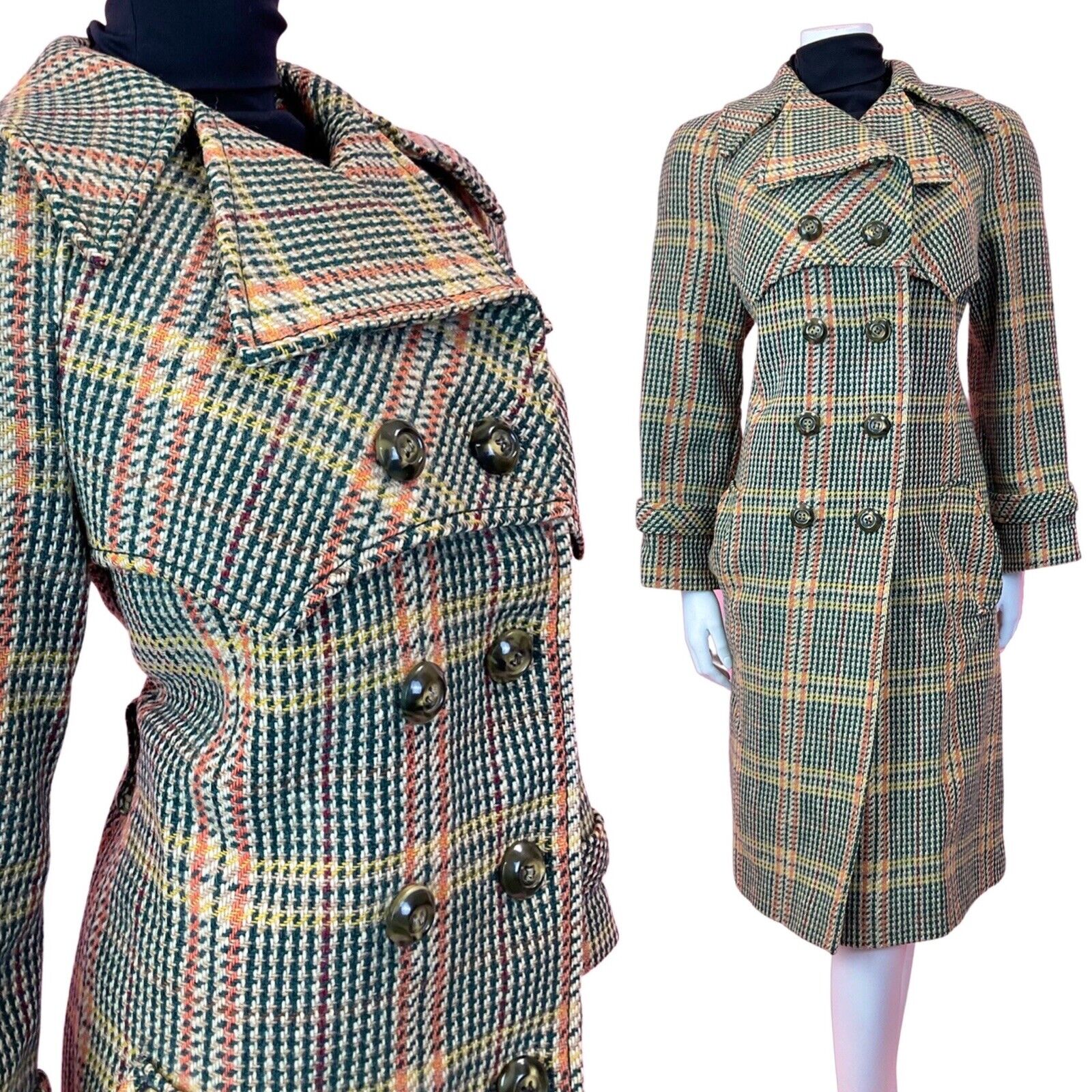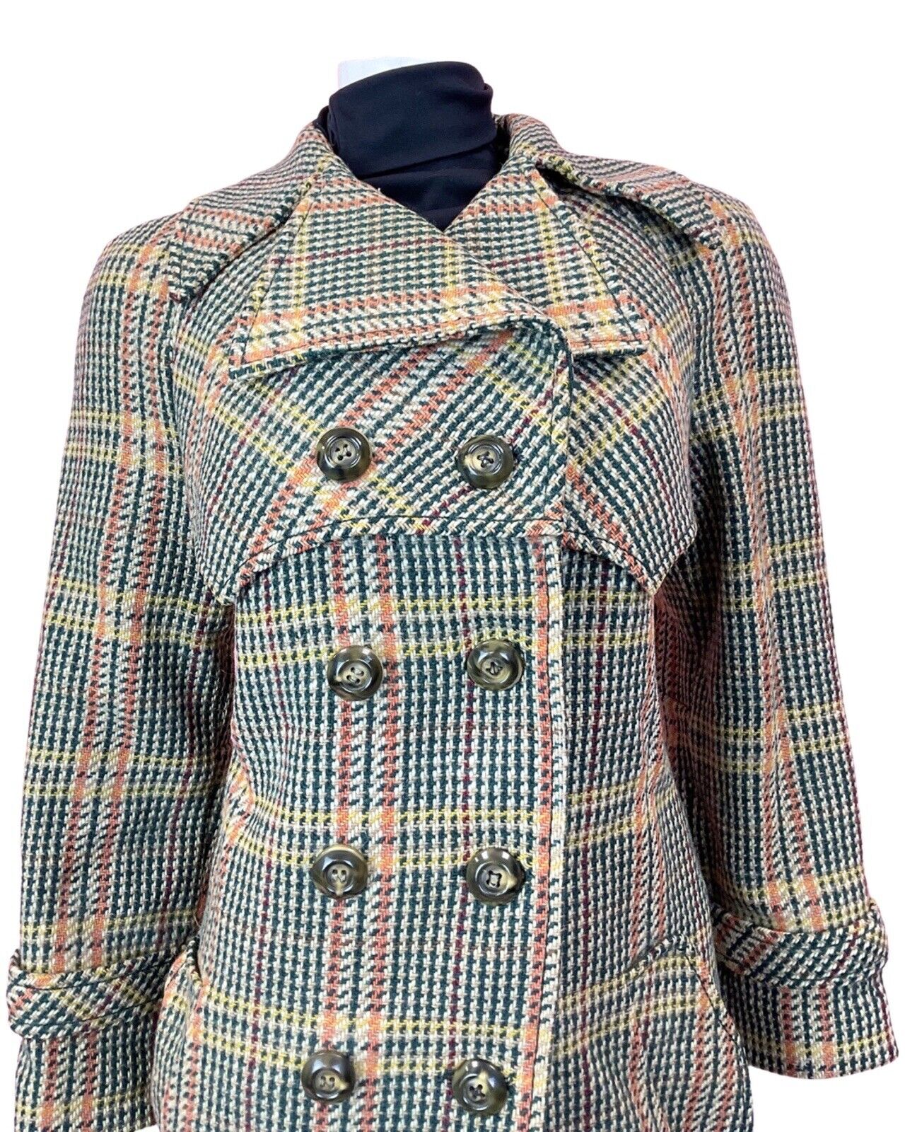 VTG 60s 70s GREEN BEIGE ORANGE CHECKED PLAID DOUBLE-BREASTED MOD WOOL COAT 16