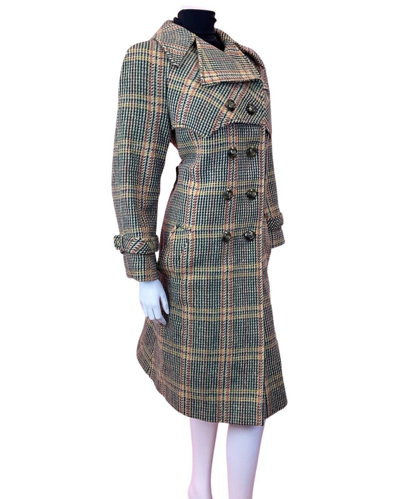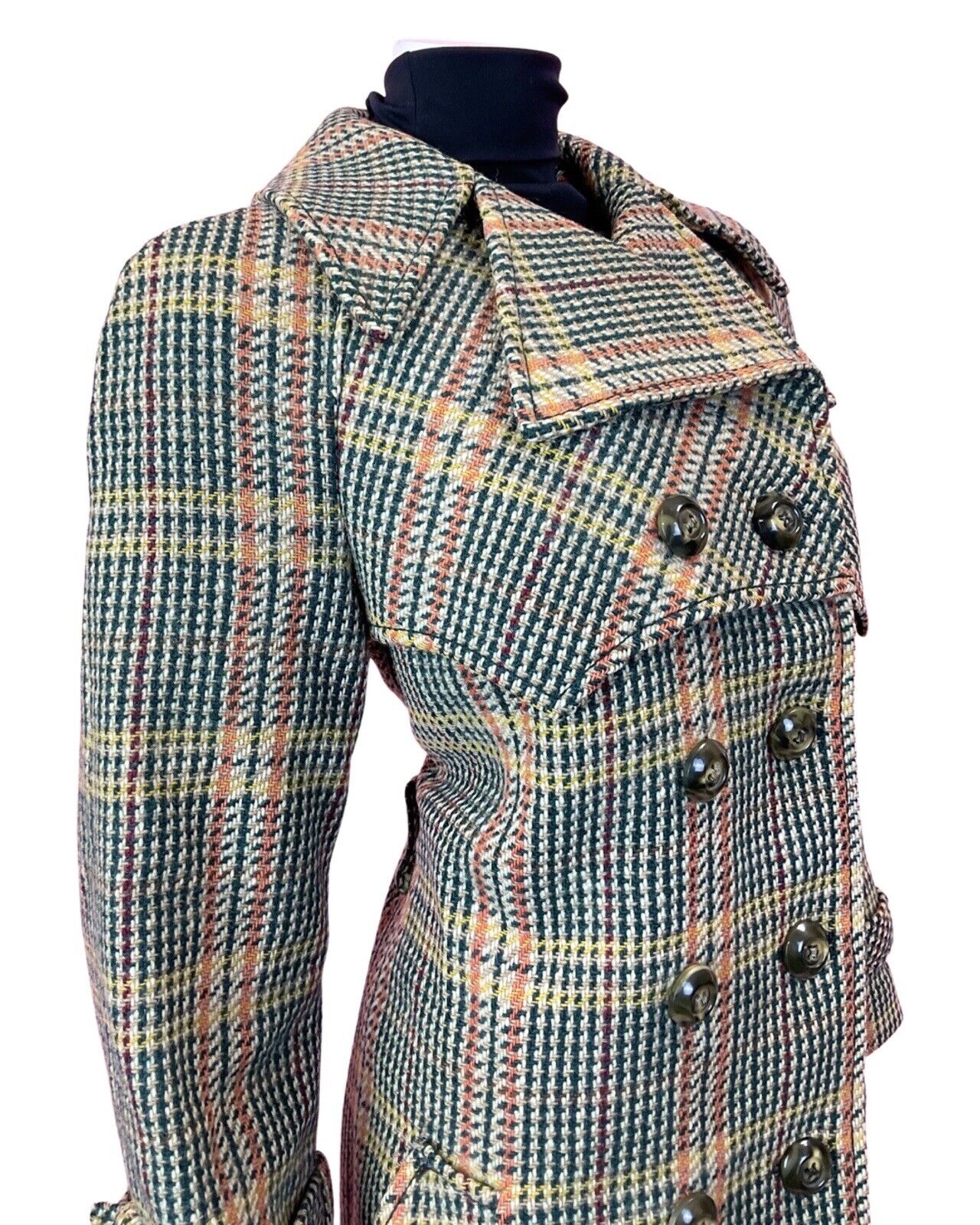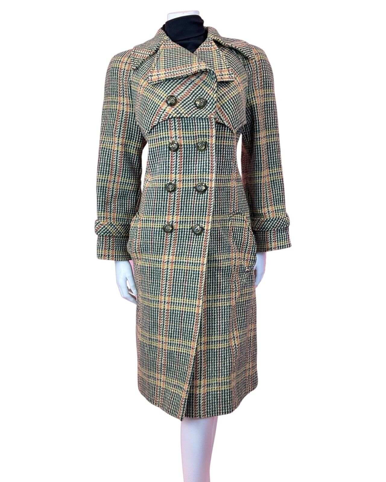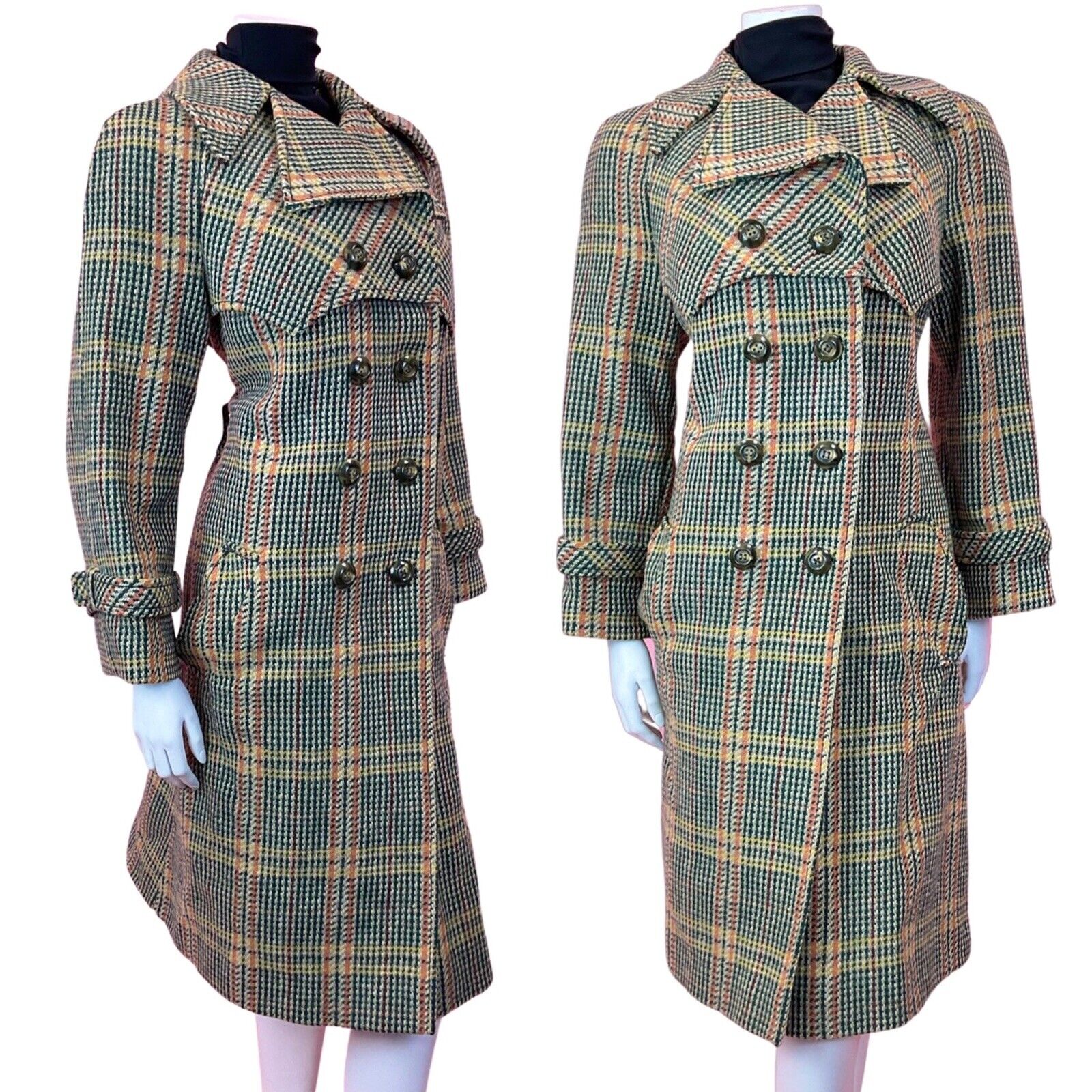 VTG 60s 70s GREEN BEIGE ORANGE CHECKED PLAID DOUBLE-BREASTED MOD WOOL COAT 16
