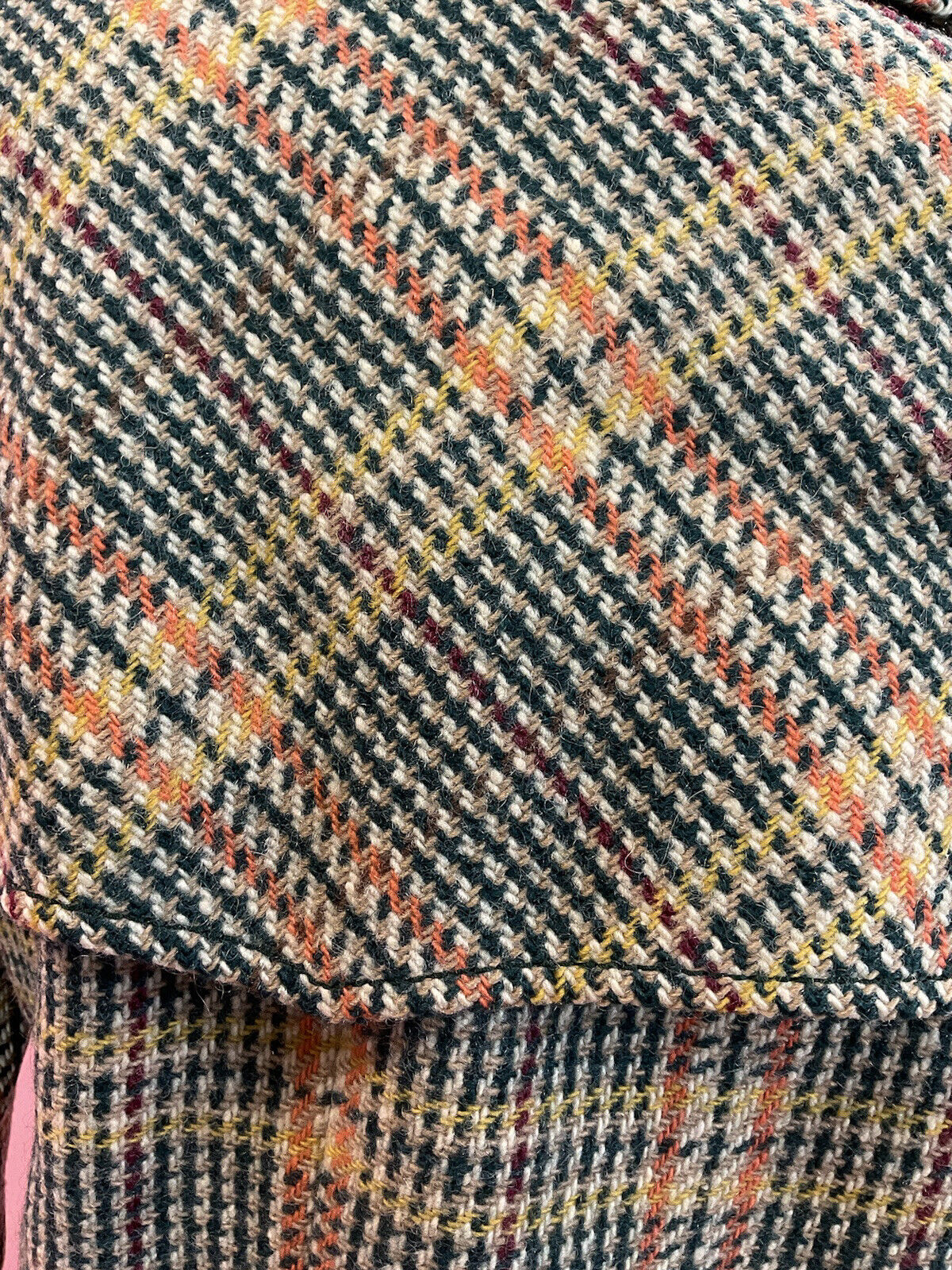 Covering the coat is a bust plaid checked pattern in block colours of green, beige, yellow, and orange, that is woven into the fabric.