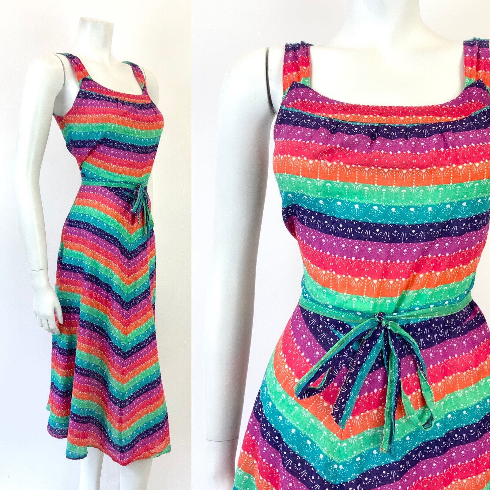 VTG 60s 70s GREEN BLUE RED RAINBOW STRIPED STRAPPY APRON SUMMER SUN DRESS 6 8