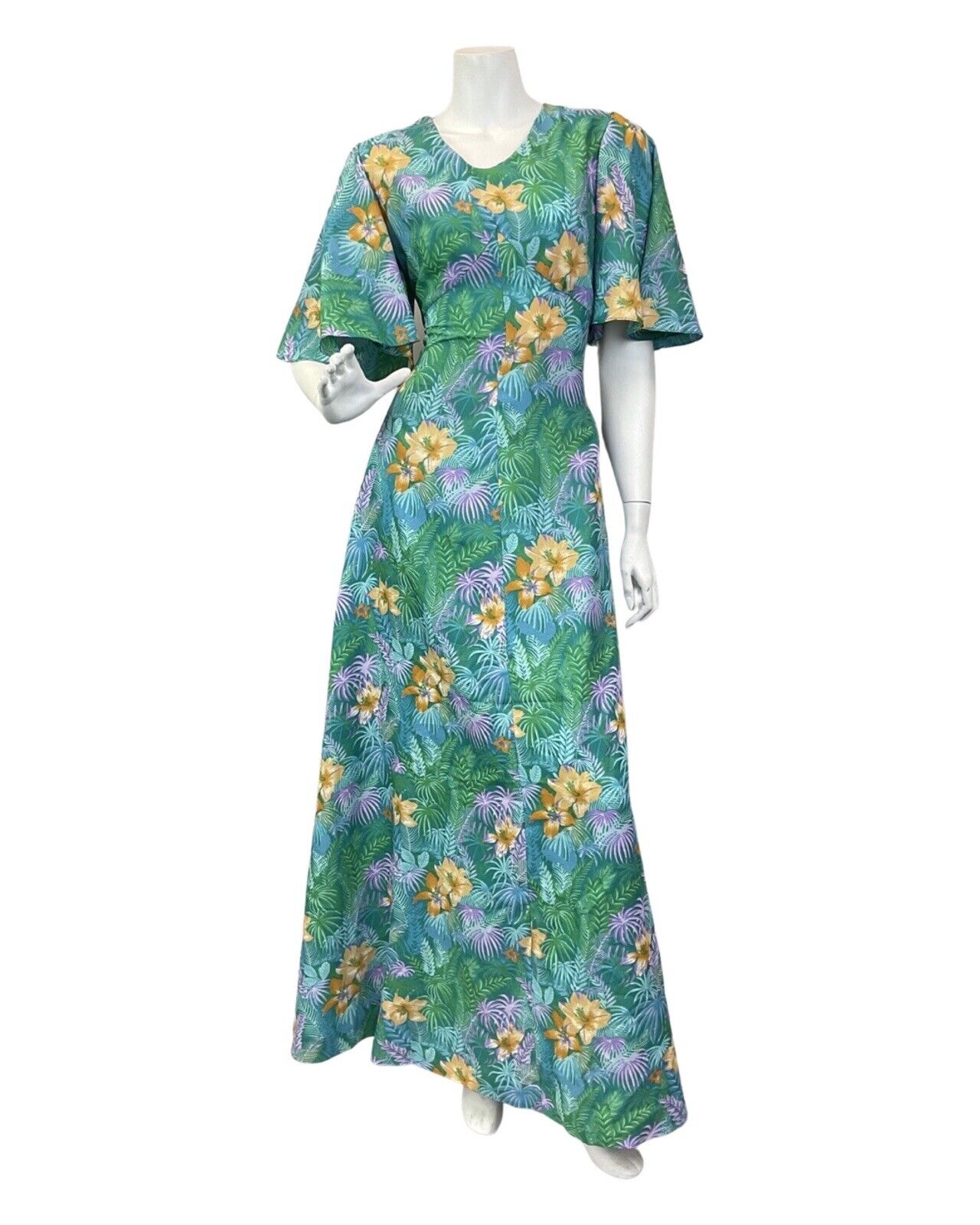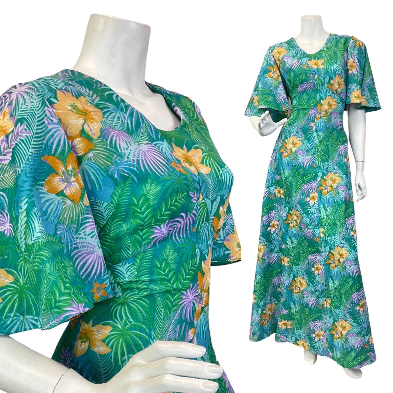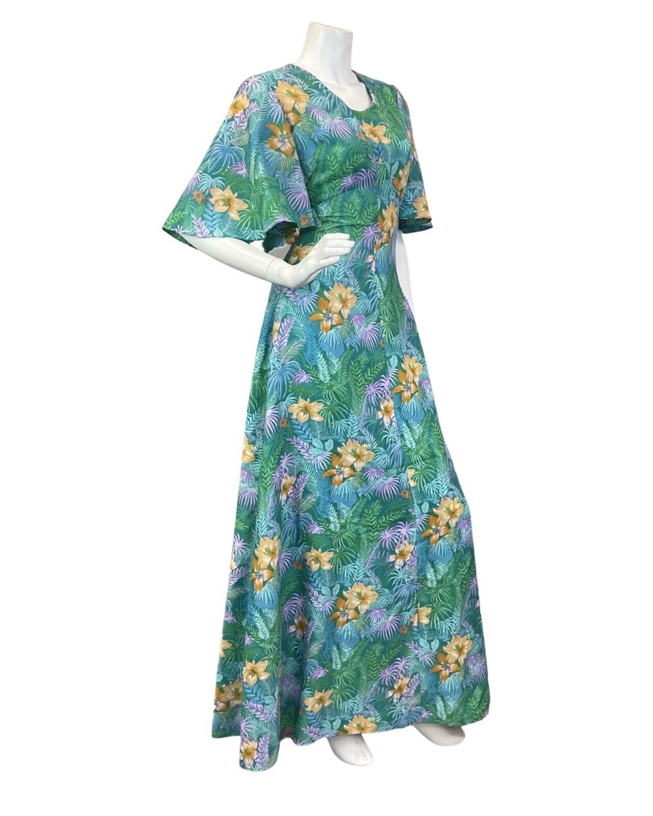 VTG 60s 70s GREEN BLUE YELLOW HAWAIIAN FLORAL PALM LEAVES TROPICAL MAXI DRESS 10