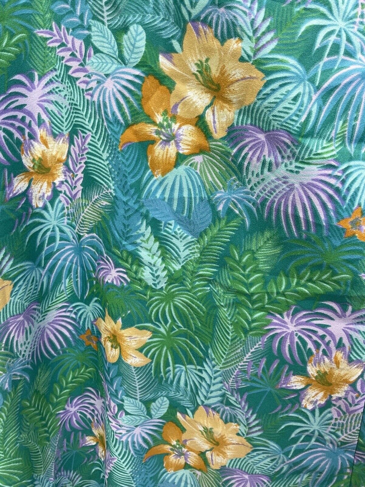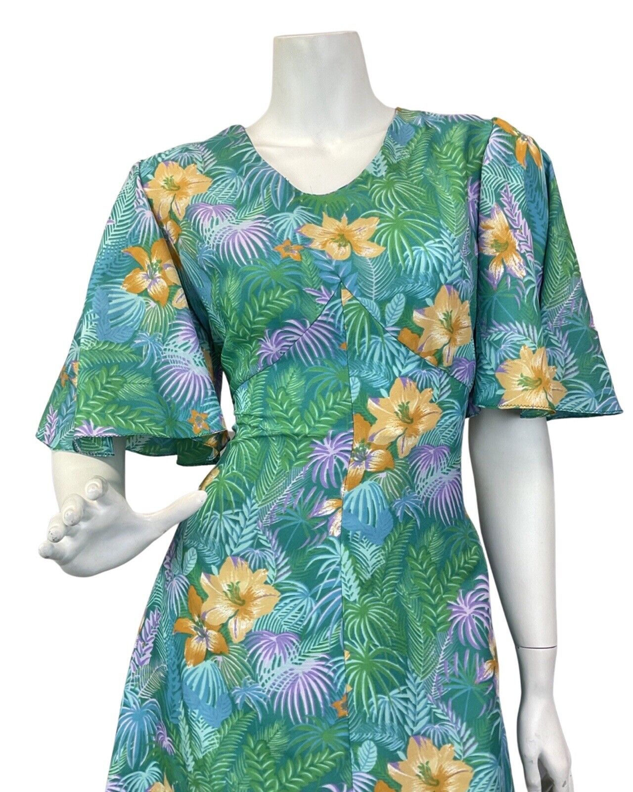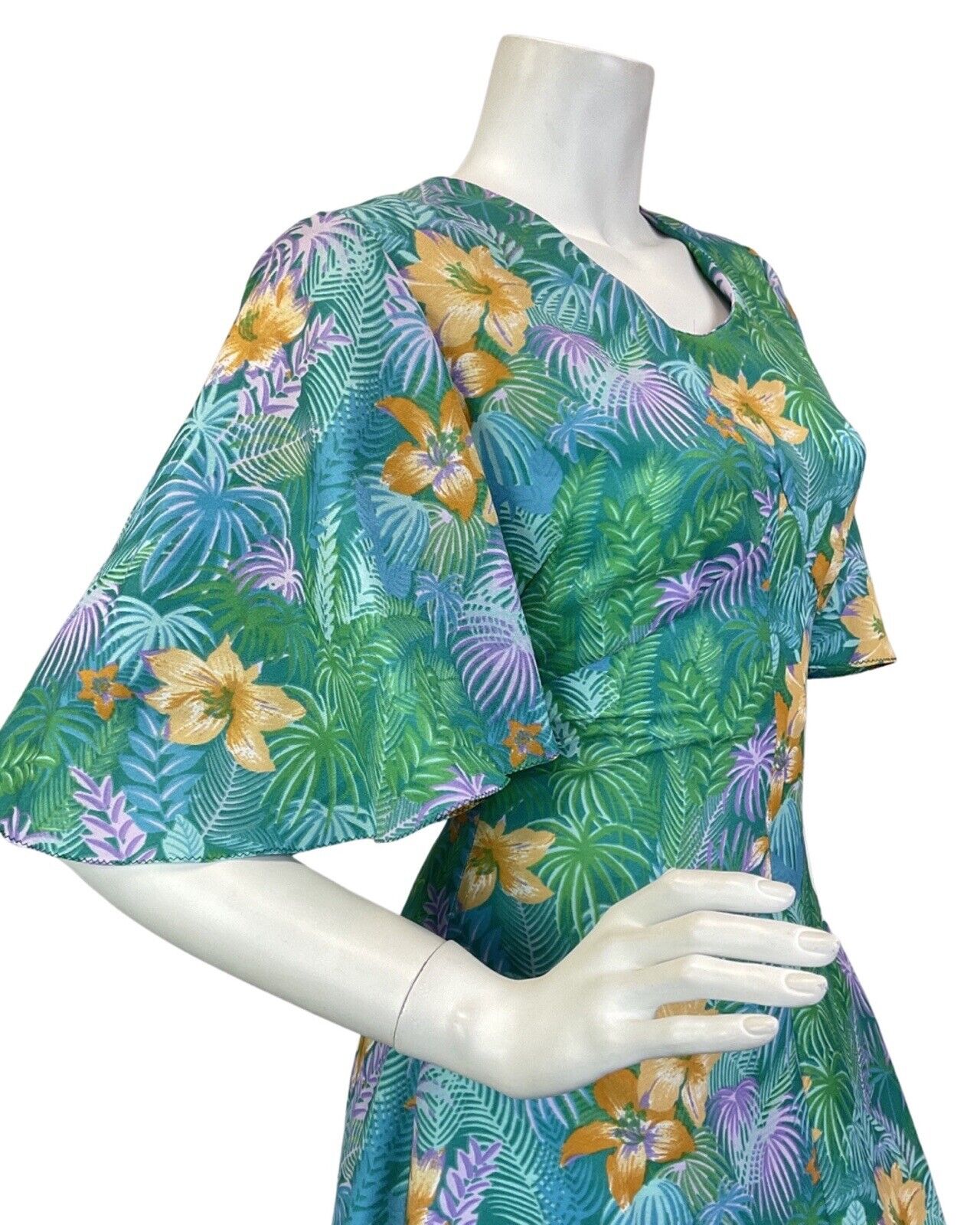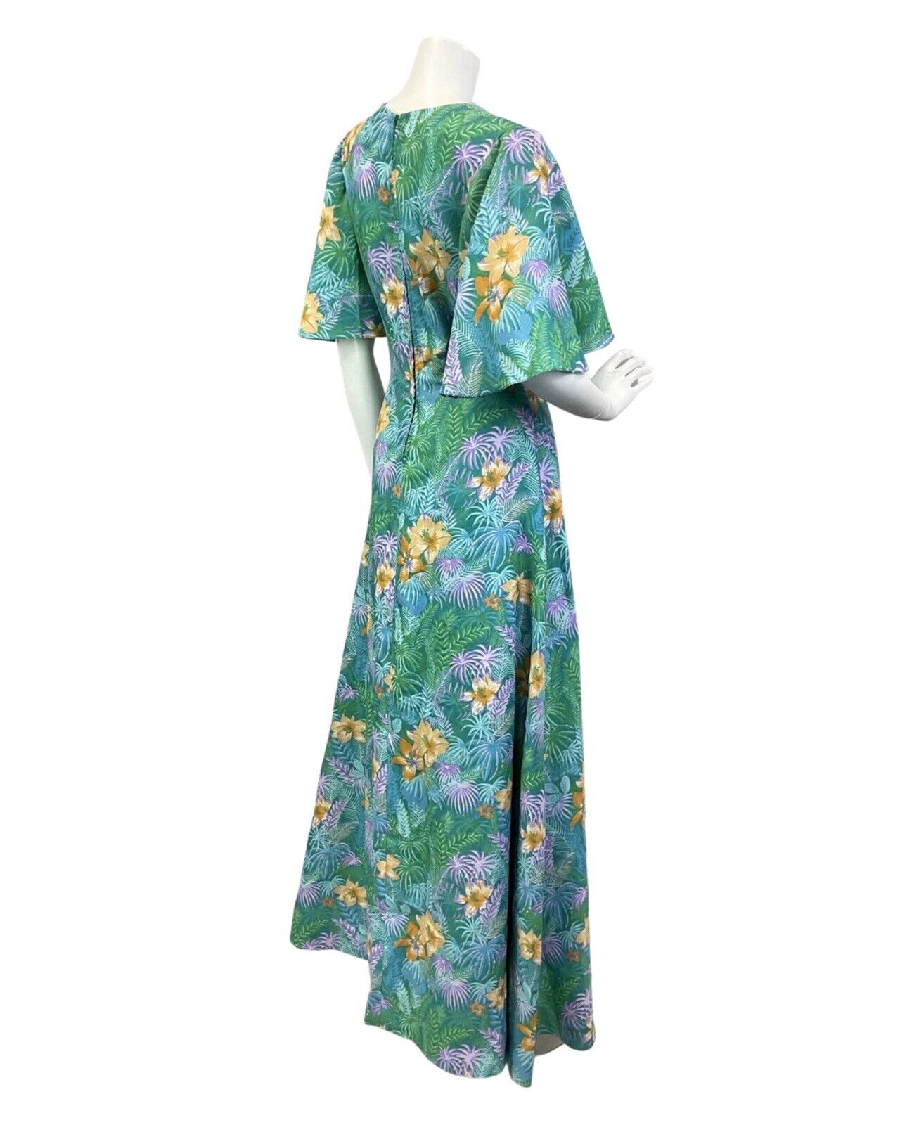 VTG 60s 70s GREEN BLUE YELLOW HAWAIIAN FLORAL PALM LEAVES TROPICAL MAXI DRESS 10