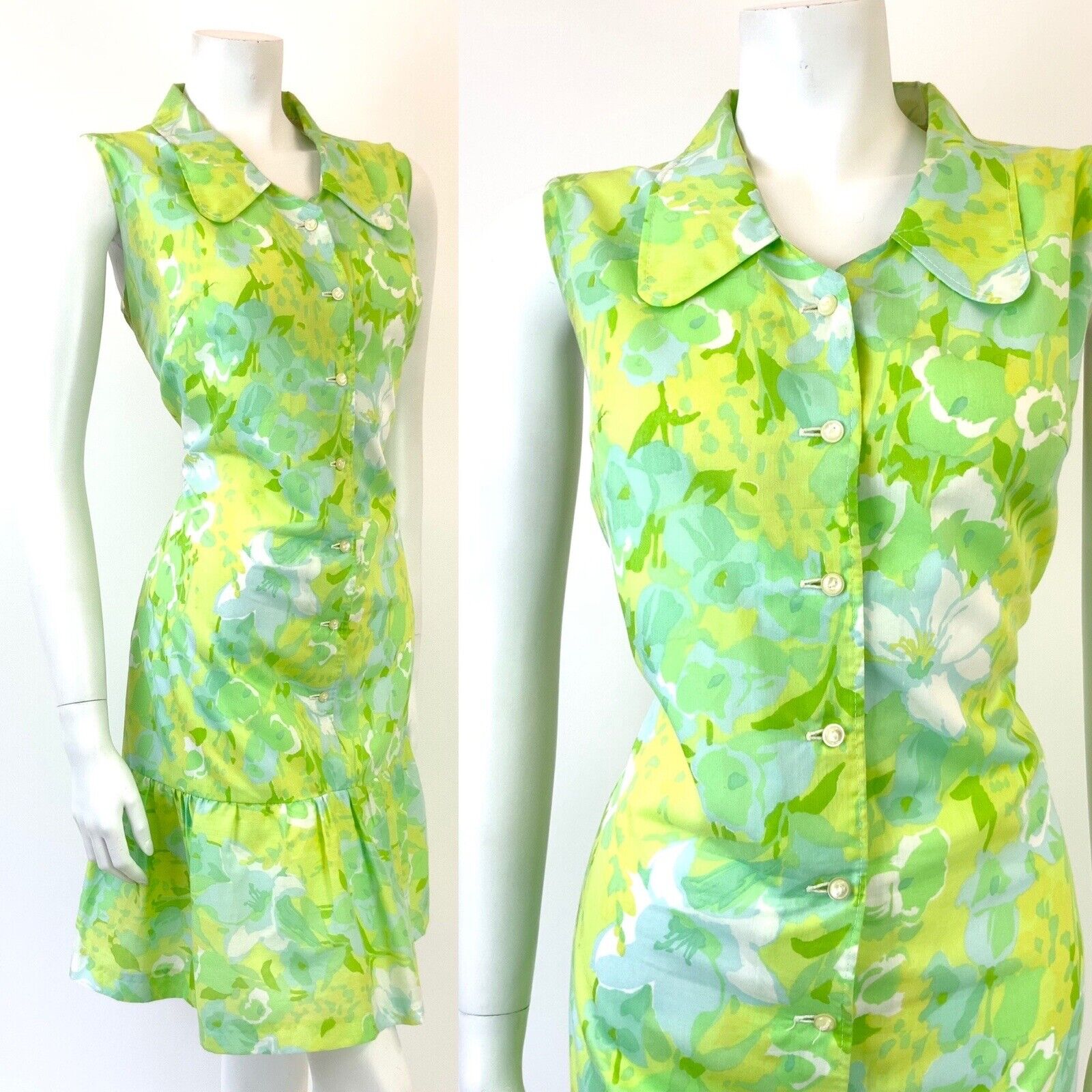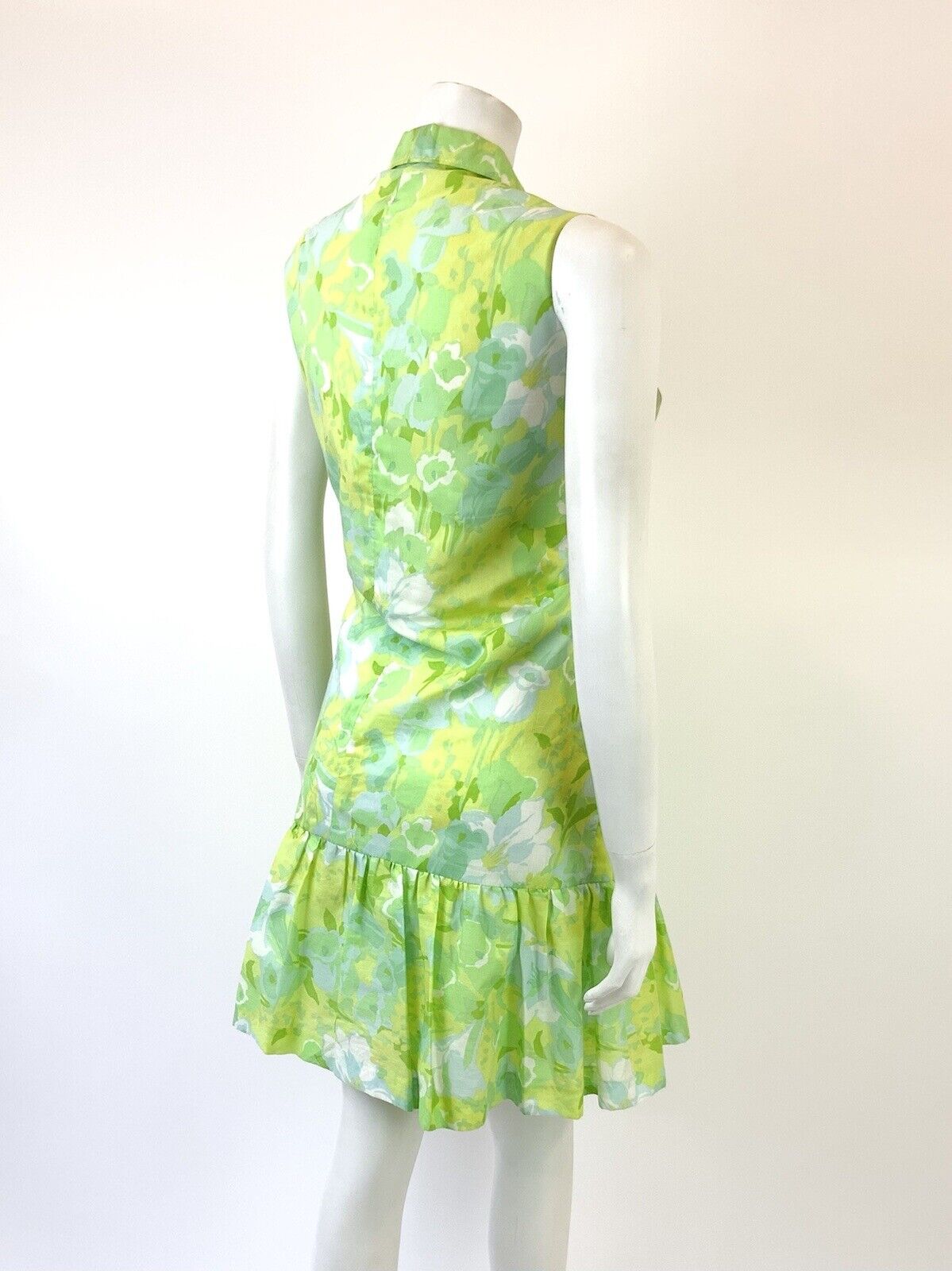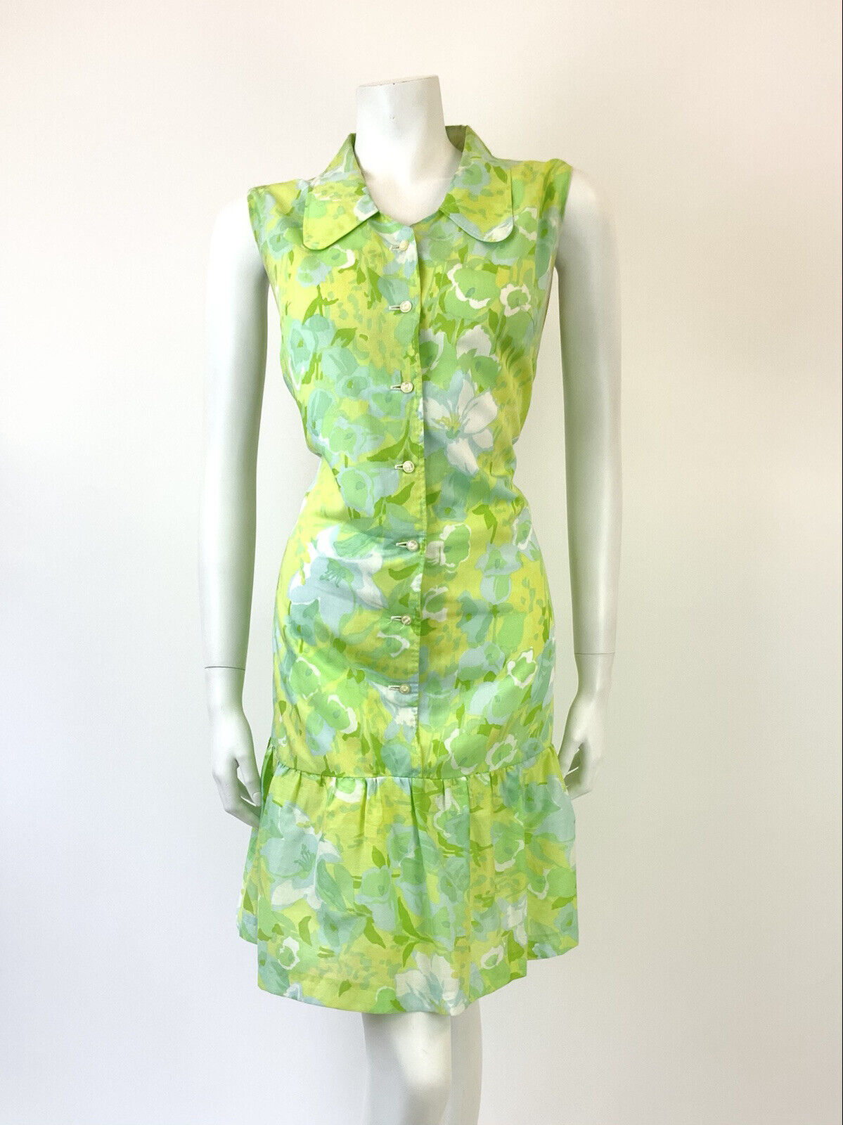 VTG 60s 70s GREEN BLUE YELLOW PSYCHEDELIC FLORAL SPOON COLLAR MOD DRESS 14 16