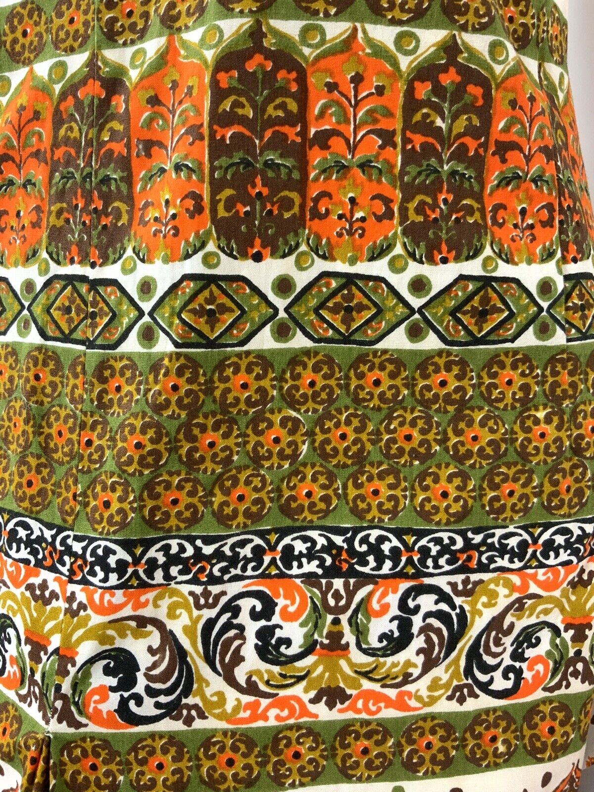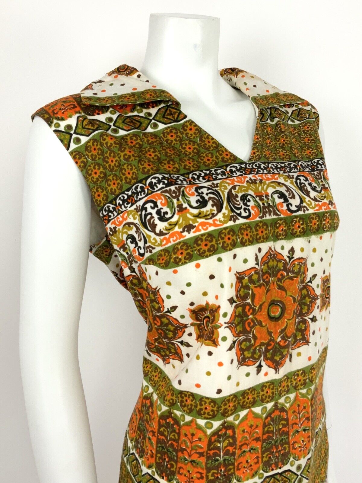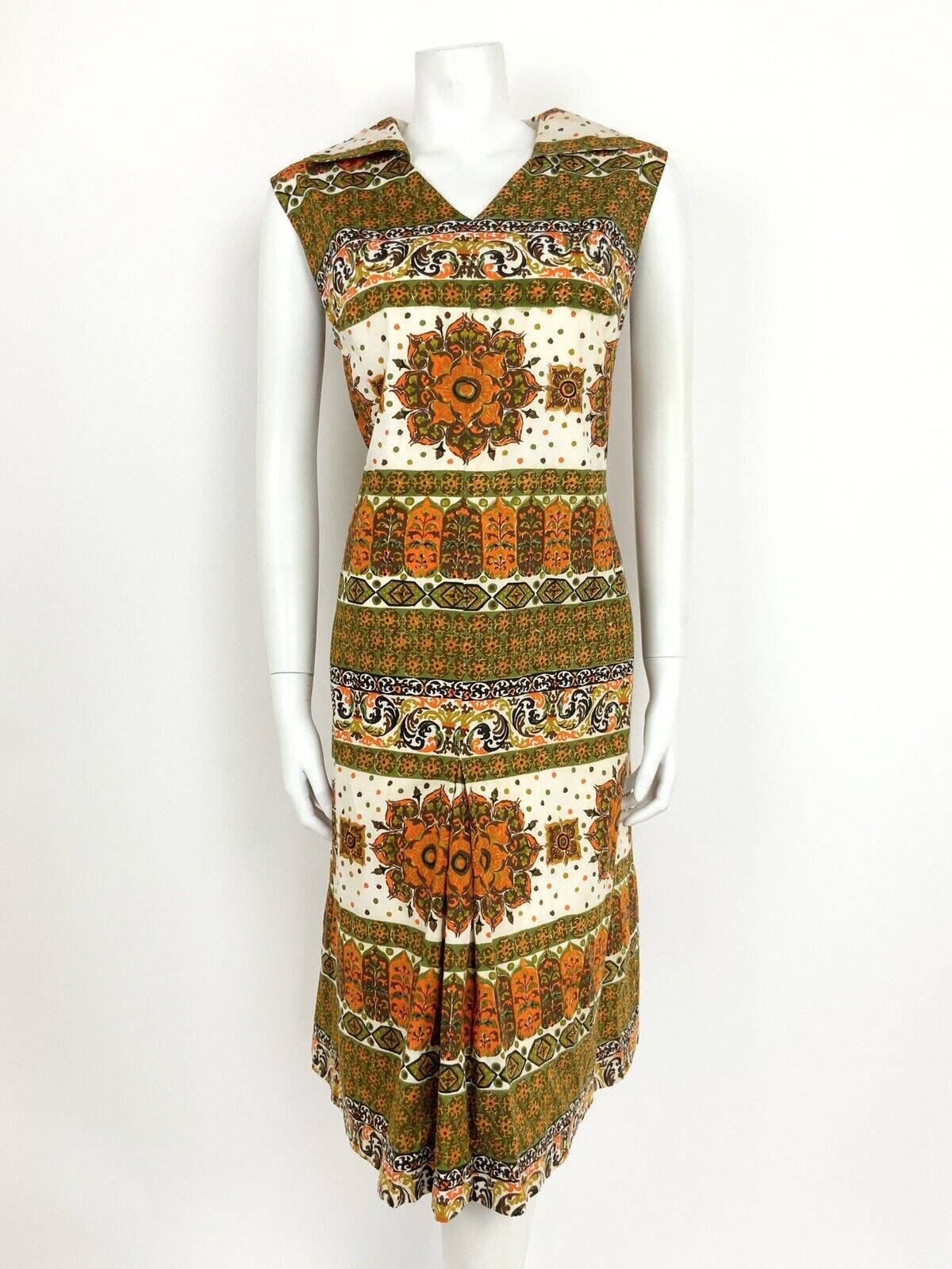 VTG 60s 70s GREEN ORANGE BROWN WHITE FLORAL ORNATE MANDALA SUMMER DRESS 14 16